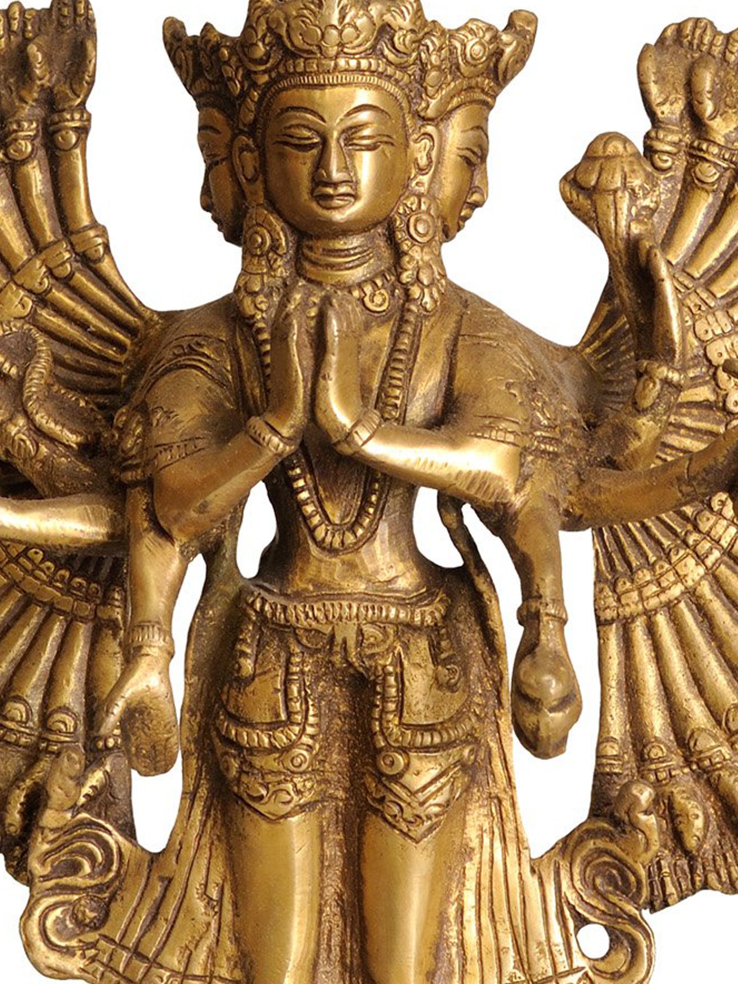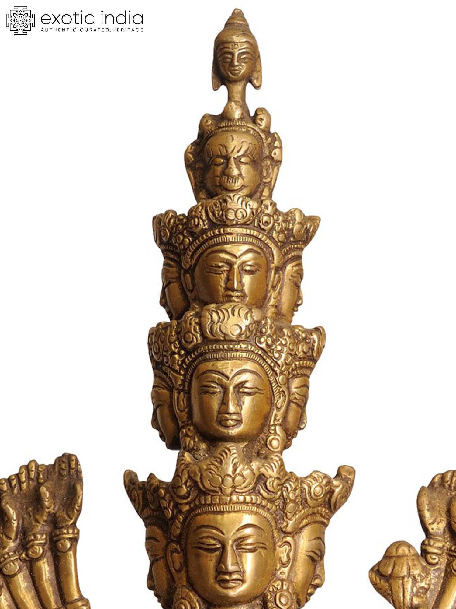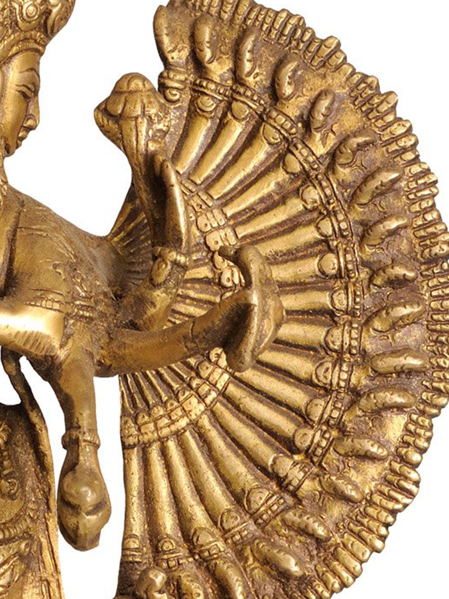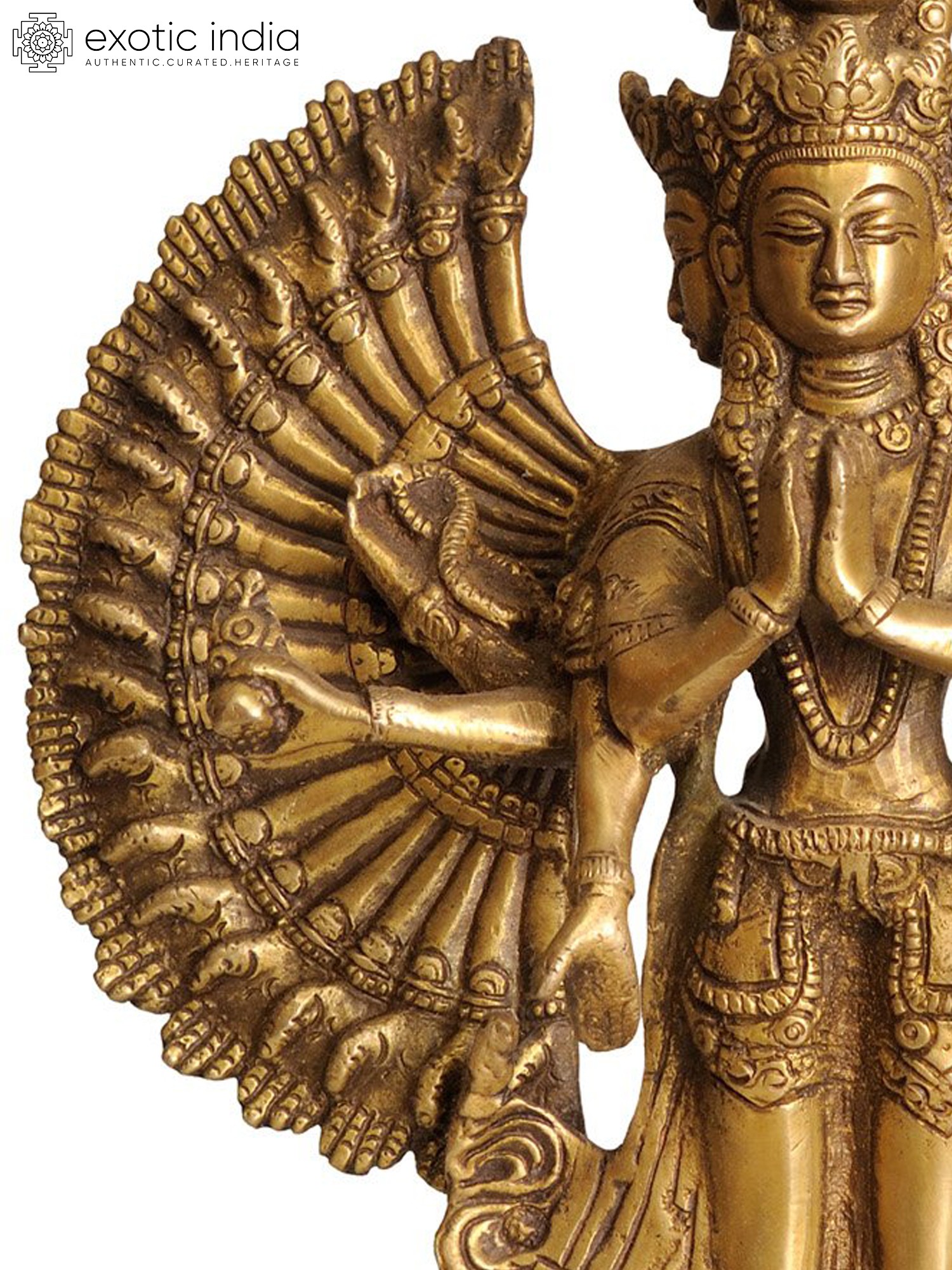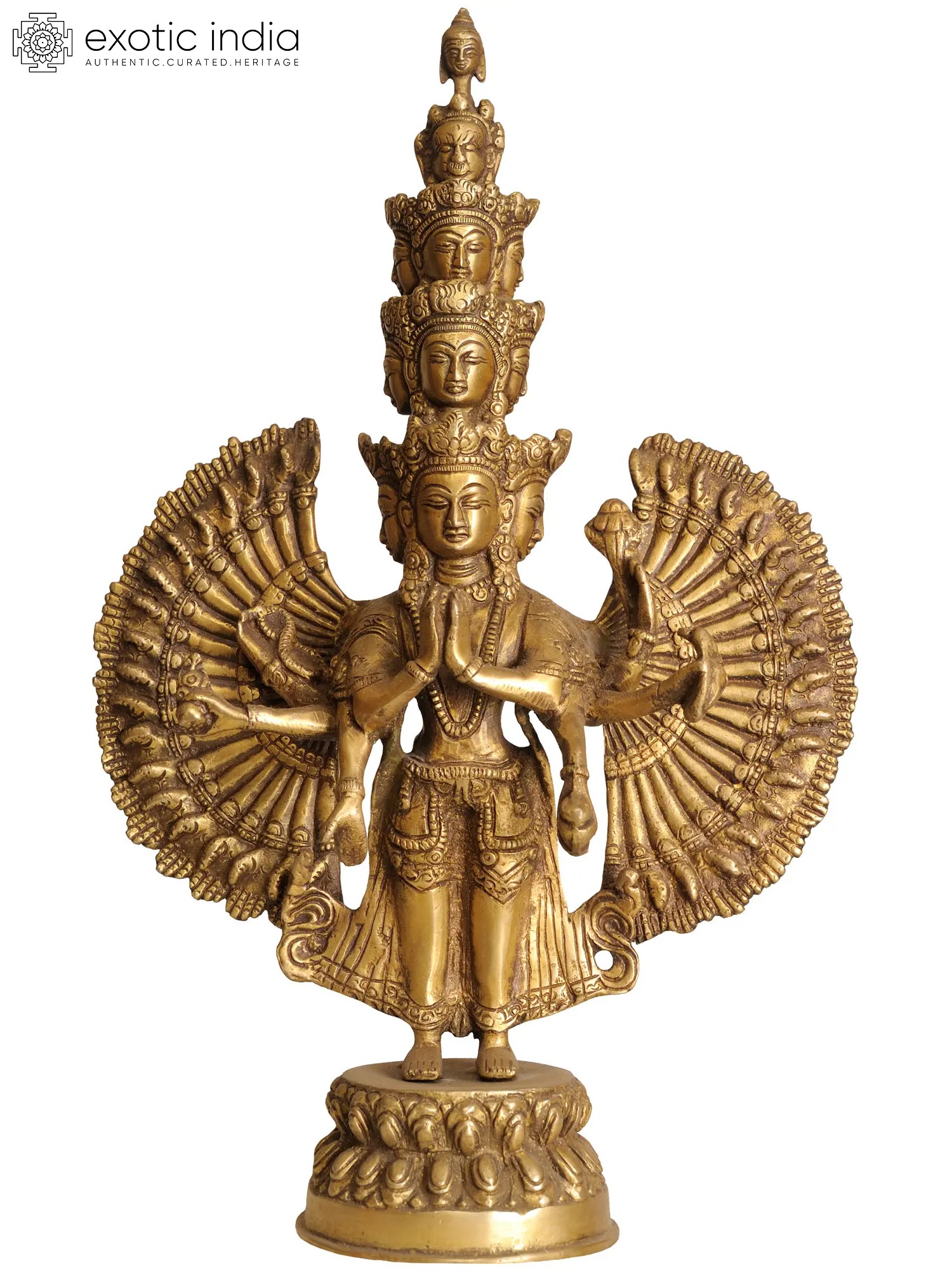 A representation of Avalokiteshvara with eleven heads and a thousand arms crafted in brass is a remarkable and spiritually significant artwork.