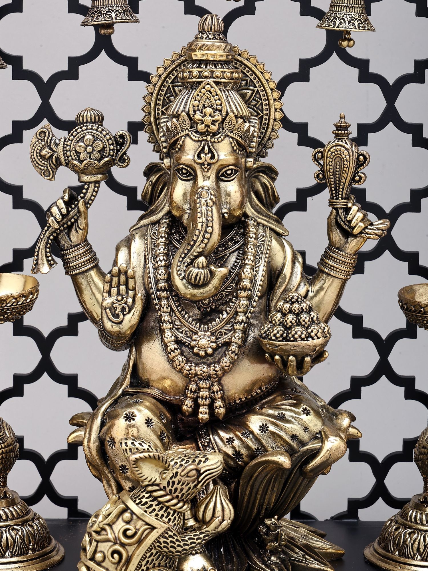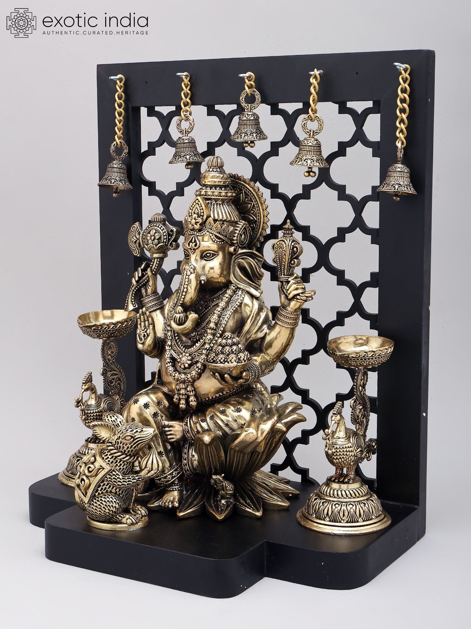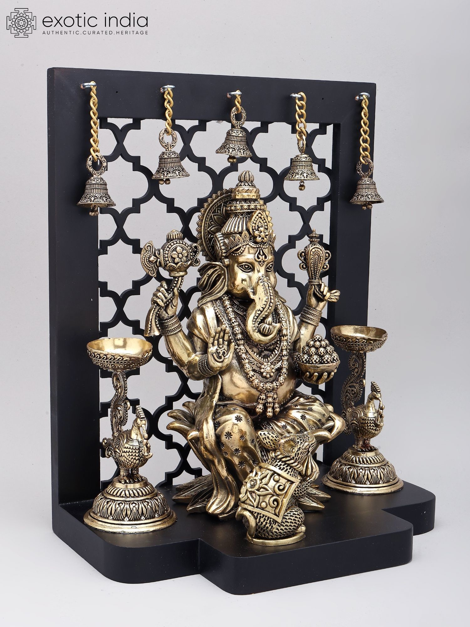 12" Chaturbhuja Lord Ganesha with Lamps and Bells | Brass Statue on Wood Base