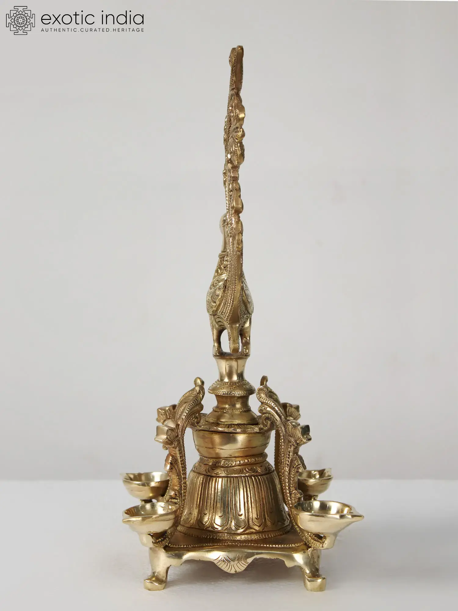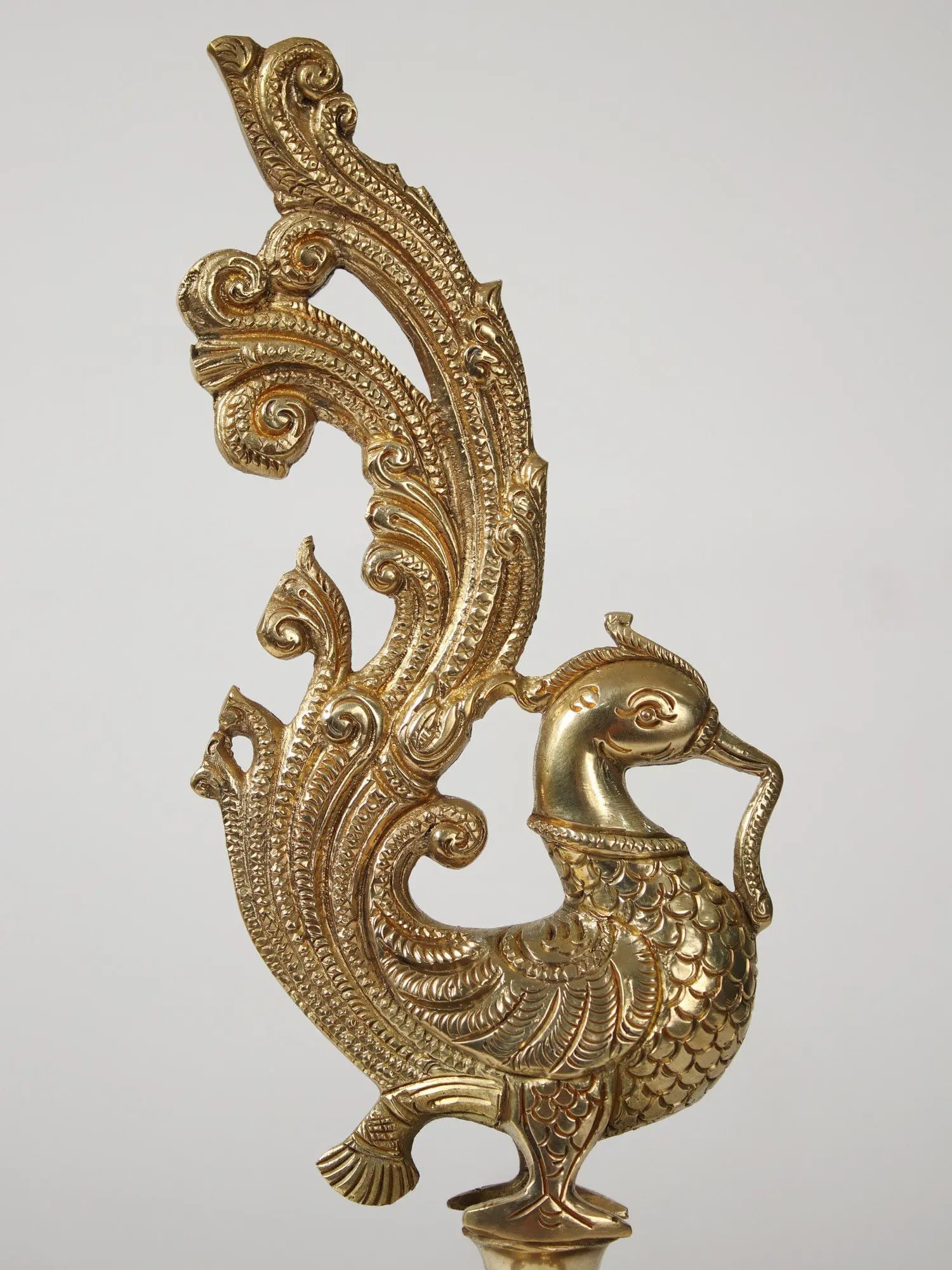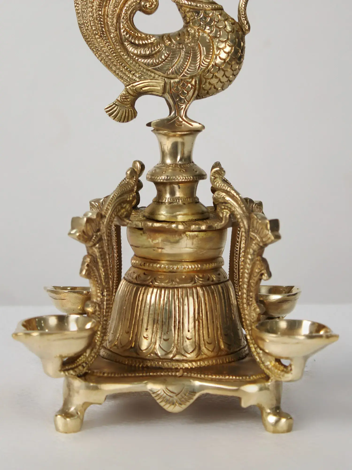 Mayura, or peacock, is the Sanskrit name for the beautiful bird that has long been revered in India. Mayura motifs are specifically placed in Hoysala architectural marvels to emphasize the bird's royal position. Mayura is a celestial vehicle for deities like Kartikeya and Saraswati. Poems and old writings describe peacocks' elegance and the magnificent sight of their dance when they find clouds. One such wonderful rendition of the huge bird is this brass lamp in Hoysala style, with magnificent filigree on the stand. The branches have four lights attached to them. Both the bird and the branch indicate growth. Because it combines all heavenly characteristics in one spot, this light is a great complement to a personal worship area.