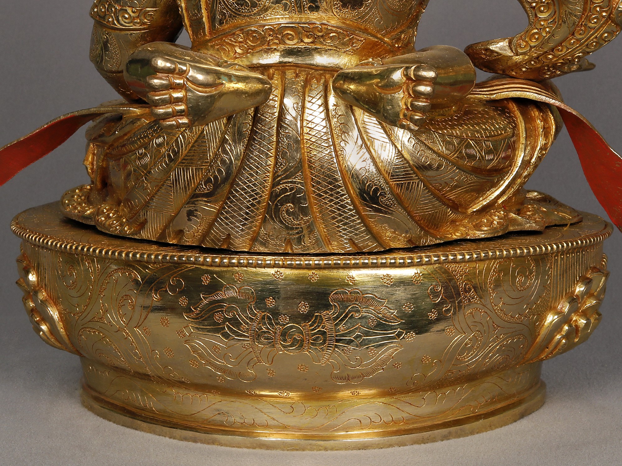 Padmasambhava is typically depicted at the thangka's center, seated with a crossed leg, holding a vajra in his right hand, and a skull cup filled with nectar in his left. This cup of longevity overflows with the elixir of deathless wisdom. The prominent eagle feather atop symbolizes his mastery of Dzogchen, the pinnacle of his Tantric teachings.