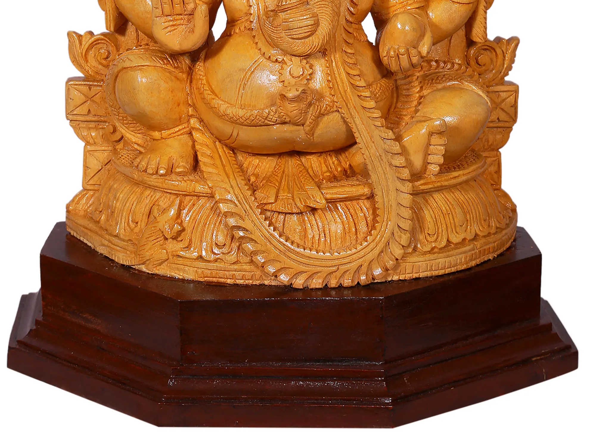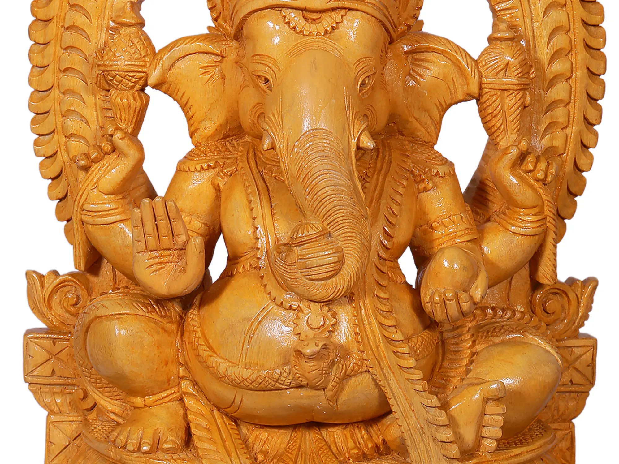 In the heart of sacred artistry, this wooden marvel emerges, capturing Lord Ganpati in divine splendor. Seated upon the “Kirtimukha throne”, his aura radiates majesty. With grace, his front right hand extends in the “Abhaya Mudra”, bestowing blessings and dispelling fear. His coiled trunk balances a Modak, symbolizing the sweetness of life’s offerings. Ganpati carries a goad and a noose to guide and protect. A serpent, a symbol of Kundalini energy, gracefully encircles his big belly. This artwork embodies Lord Ganpati’s omnipotent presence, offering solace, protection, and a reminder of the cyclical nature of existence.