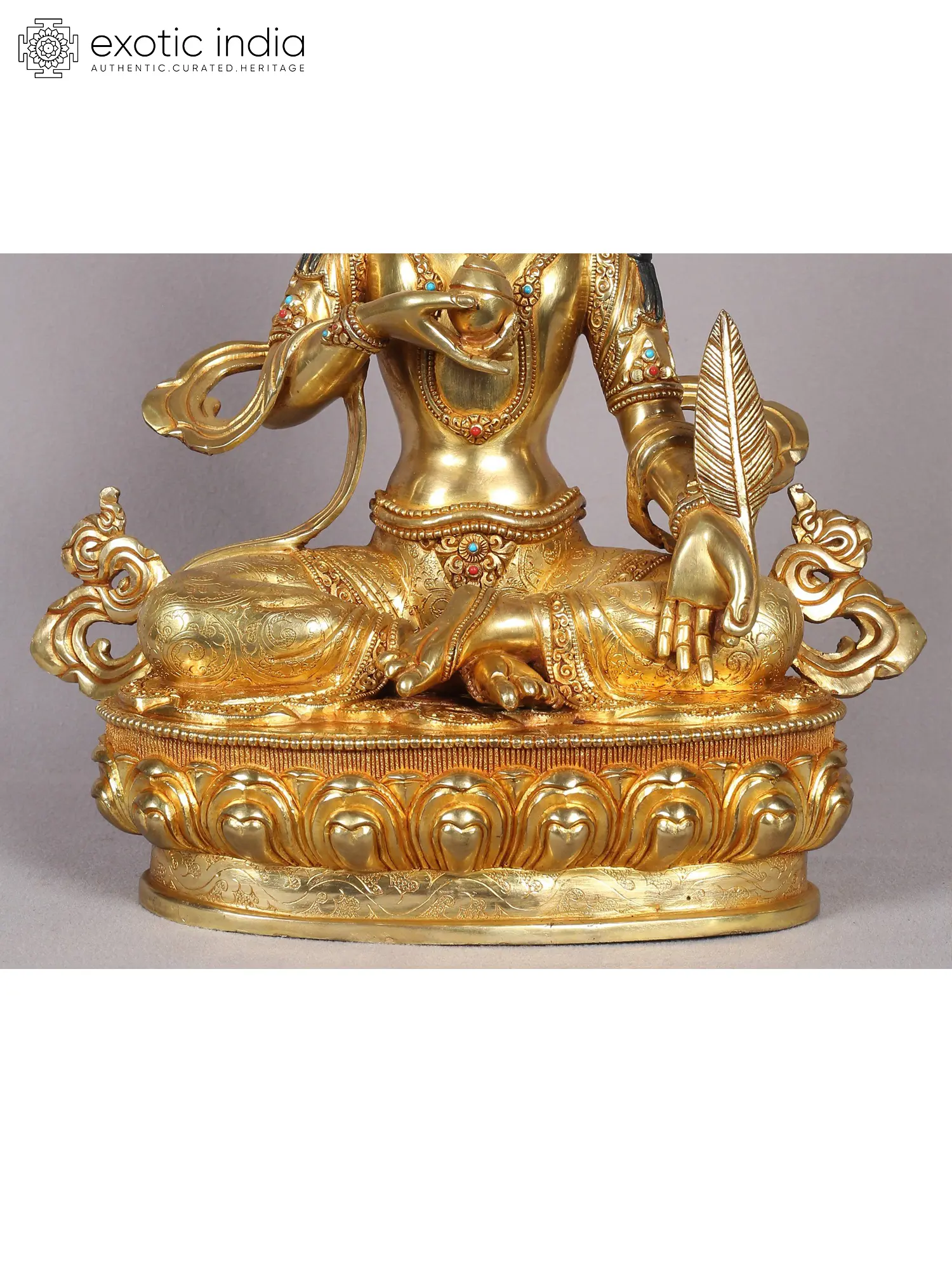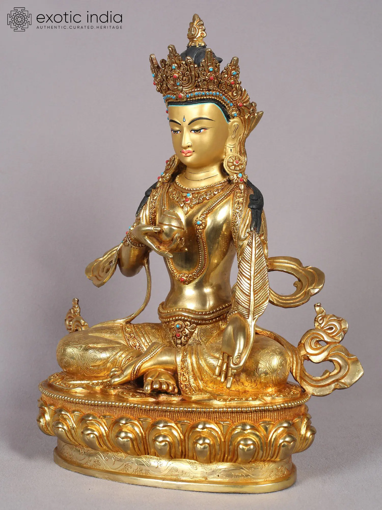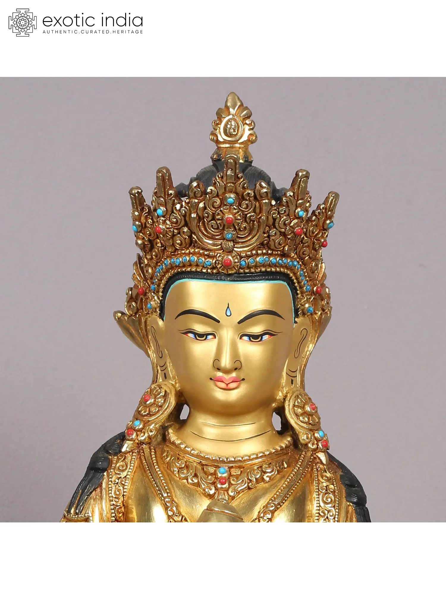 Now comes the most important part of Nepalese art which is gold gilding. This is done by the traditional fire gilding method. A mixture of mercury and 18K gold is applied on the surface of the statue and heat is applied using a flame torch. The result is that mercury evaporates along with impurities, leaving a pure 24K gold finish.