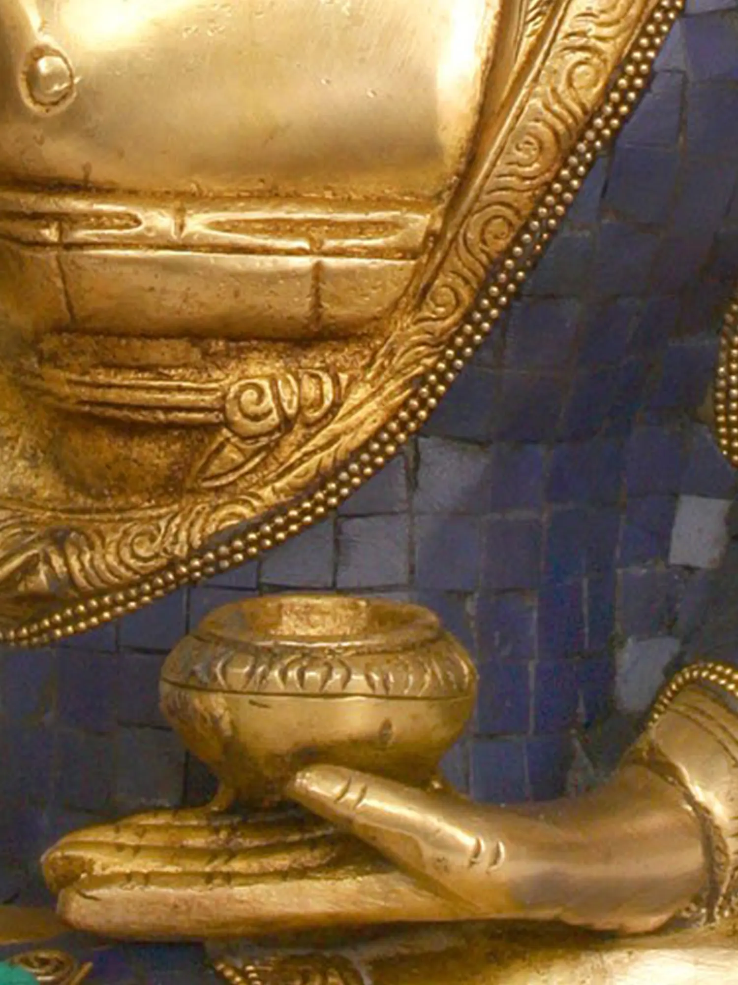 In his left hand, the Medicine Buddha holds a bowl containing healing nectar. This bowl represents the boundless source of healing energy available to all beings. It symbolizes the importance of nurturing ourselves and others with compassion, kindness, and the wisdom to overcome suffering. The details of the bowl, like the patterns decorating his robe, highlight the level of detail and craftsmanship imbued in the piece.