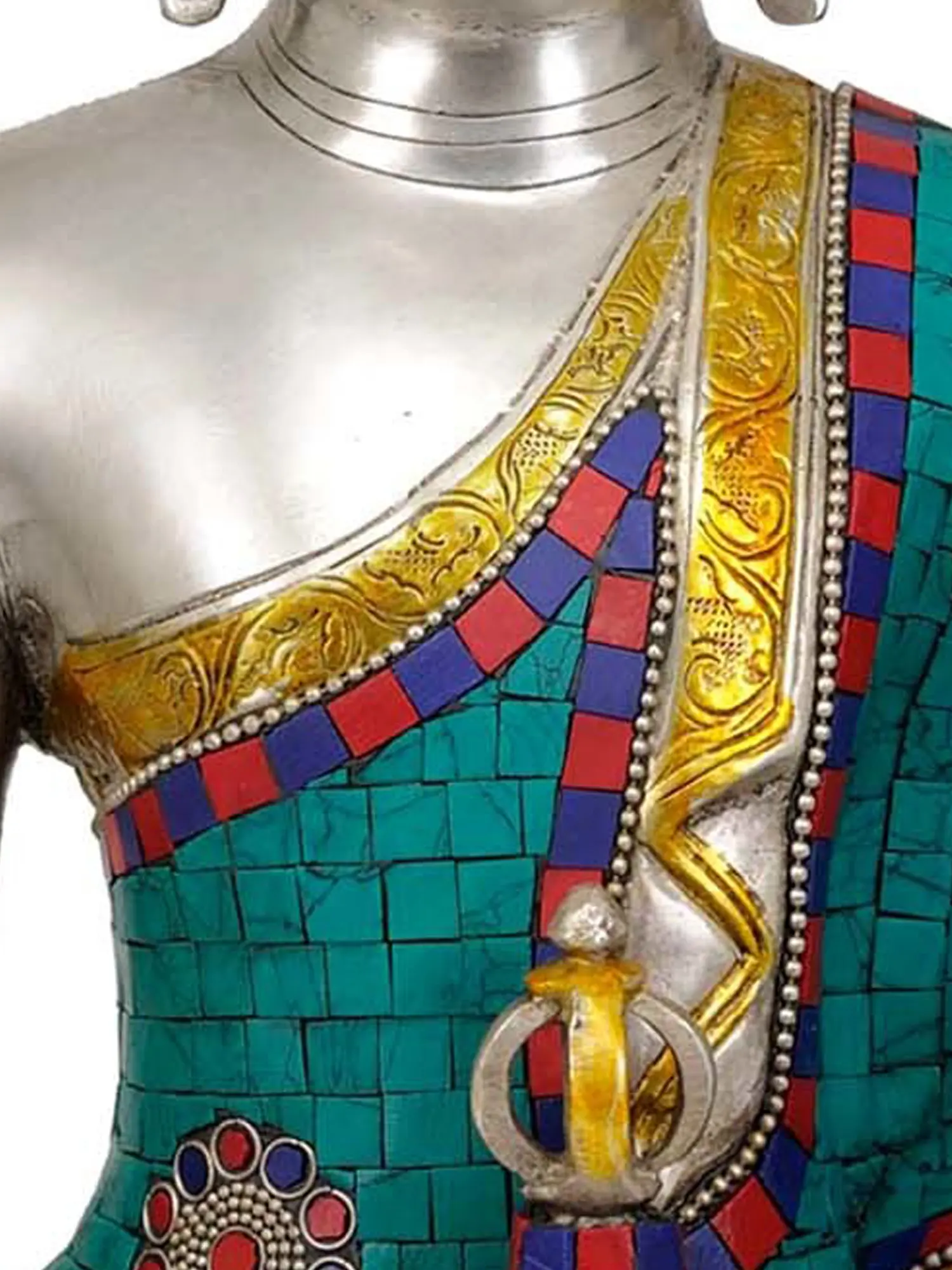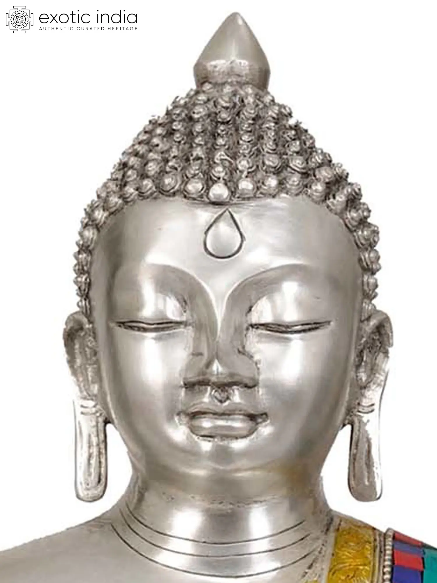 Immerse yourself in the profound peace and wisdom of Lord Buddha with this exquisite brass statue, meticulously handcrafted in India. Standing at a commanding 14 inches tall, this artwork captures the serene countenance of the awakened one, seated in a meditative posture that radiates tranquility. The luminous brass body, polished to a gentle sheen, serves as a canvas for the vibrant inlay work that adorns the Buddha's robes. ––––––––––––––––––