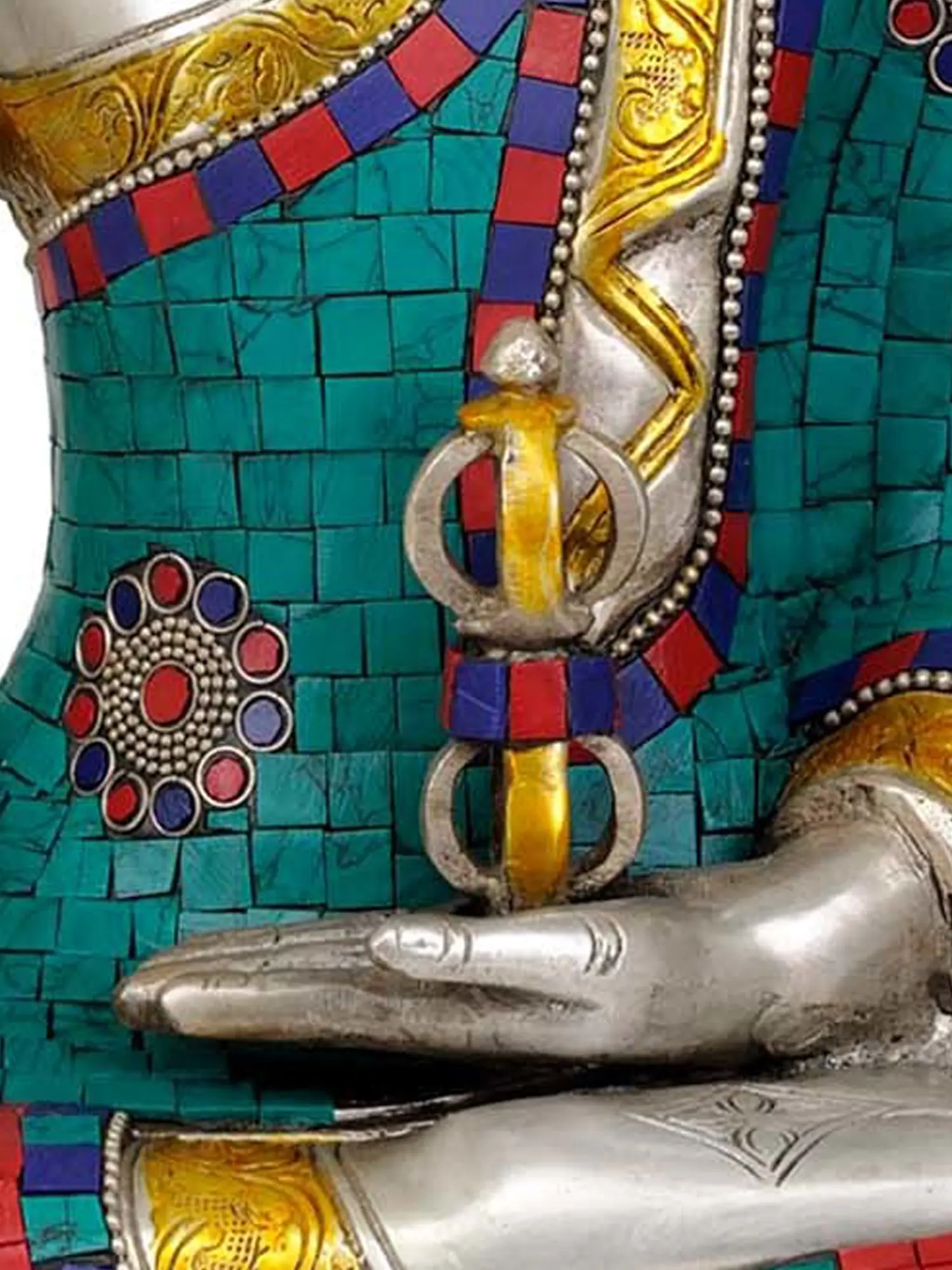 The robes are a breathtaking spectacle, composed of countless small, precisely cut pieces of vibrant turquoise and carnelian, arranged in a striking checkered pattern. This rich tapestry of color is further enhanced by intricate gold detailing along the borders and shoulders, evoking the opulence and sacred beauty of traditional Buddhist artistry. Each tessera of turquoise symbolizes the sky and the endless expanse, representing clarity and enlightenment, while the carnelian, a stone associated with vitality and courage, brings a grounding warmth. The central motif of a circular medallion, featuring concentric rings of blue, red, and turquoise stones, suggests the mandala – a sacred geometric configuration representing the universe. At the heart of the robes, the Buddha holds a dorje, also known as a vajra. This ancient symbol, often translated as "thunderbolt" or "diamond," represents indestructibility, spiritual power, and the enlightened mind that can cut through ignorance and illusion. Its presence signifies the Buddha's ultimate victory over suffering and his ability to offer unwavering spiritual guidance. ––––––––––––––––––