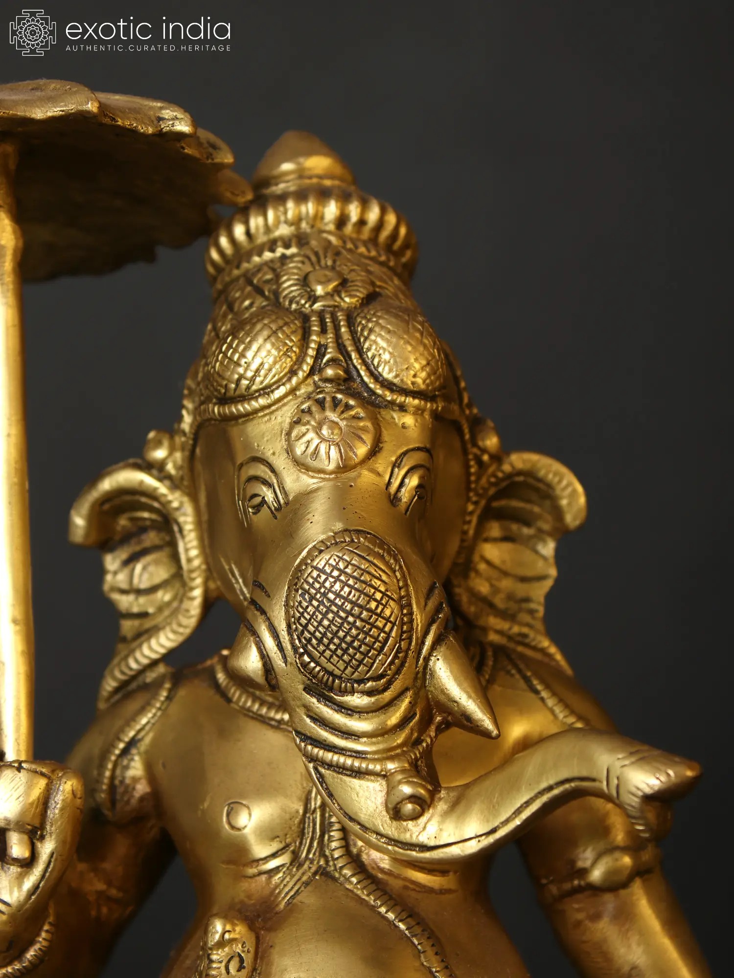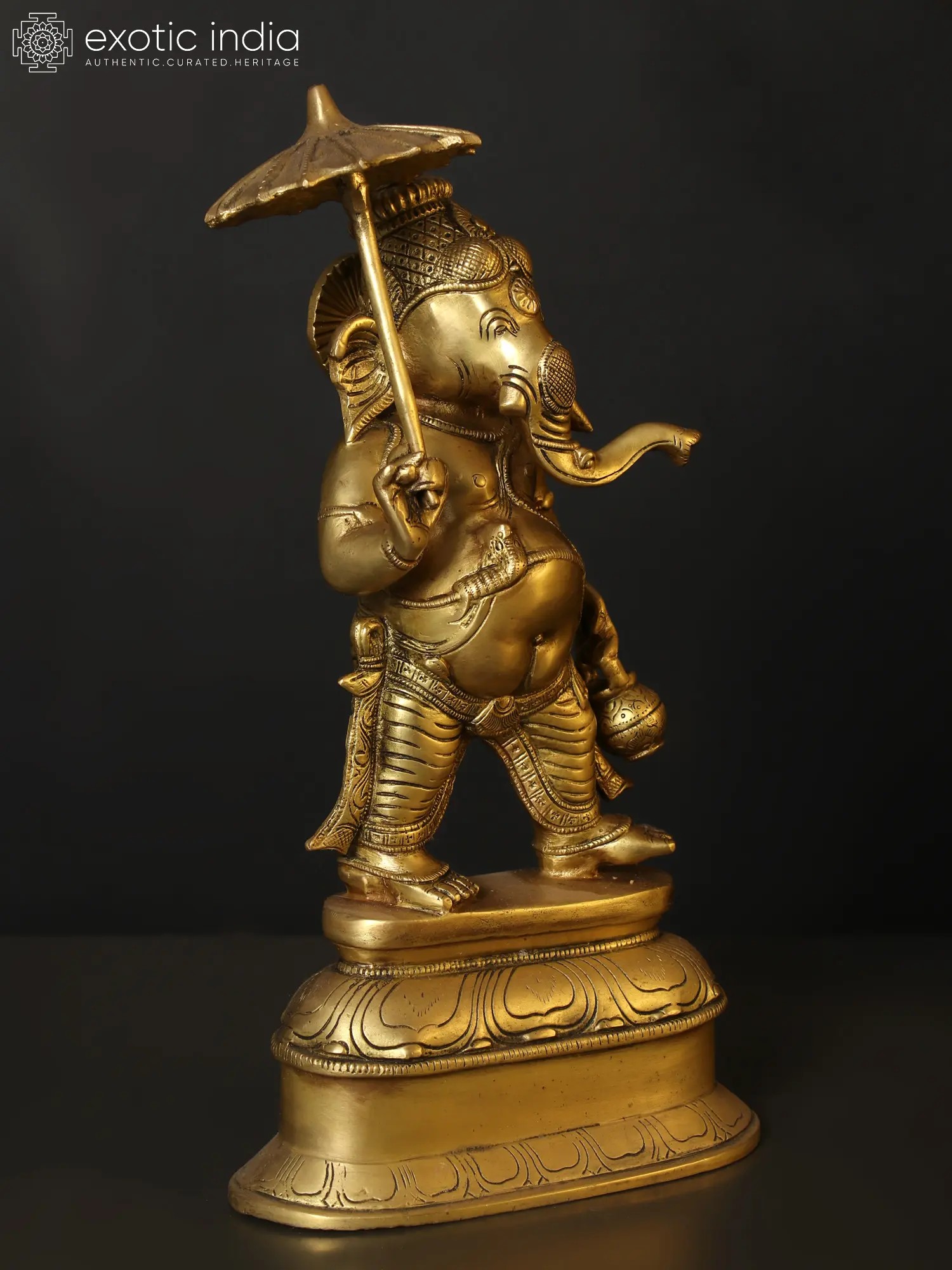 Many craftsmen represent Lord Ganesha as the Mappilai Ganesha. Mappilai (bridegroom) Ganesh is Lord Ganesh who is depicted with an umbrella and a container of water. As part of the Brahman marriage ceremony, the bridegroom (mappilai) must carry an umbrella and a water pot. This Lord Ganesha with Umbrella Brass Statue is in one of his most charming forms.