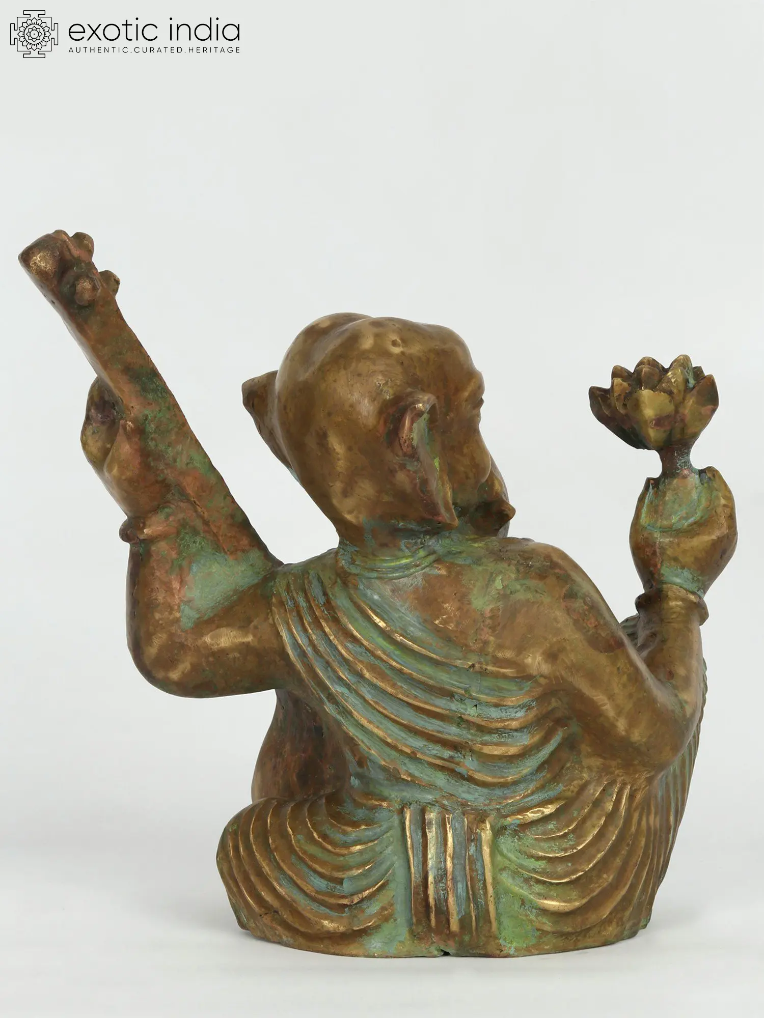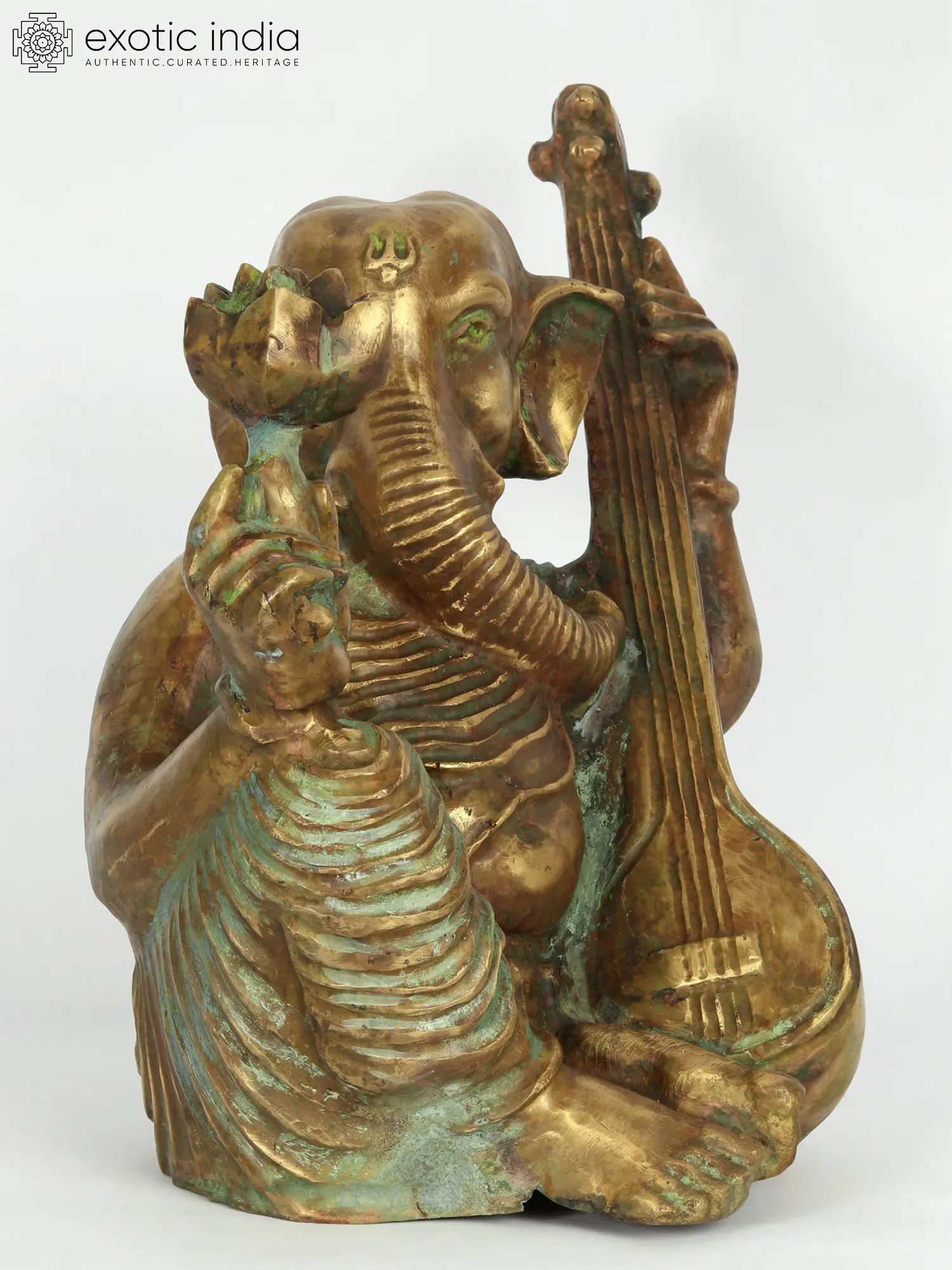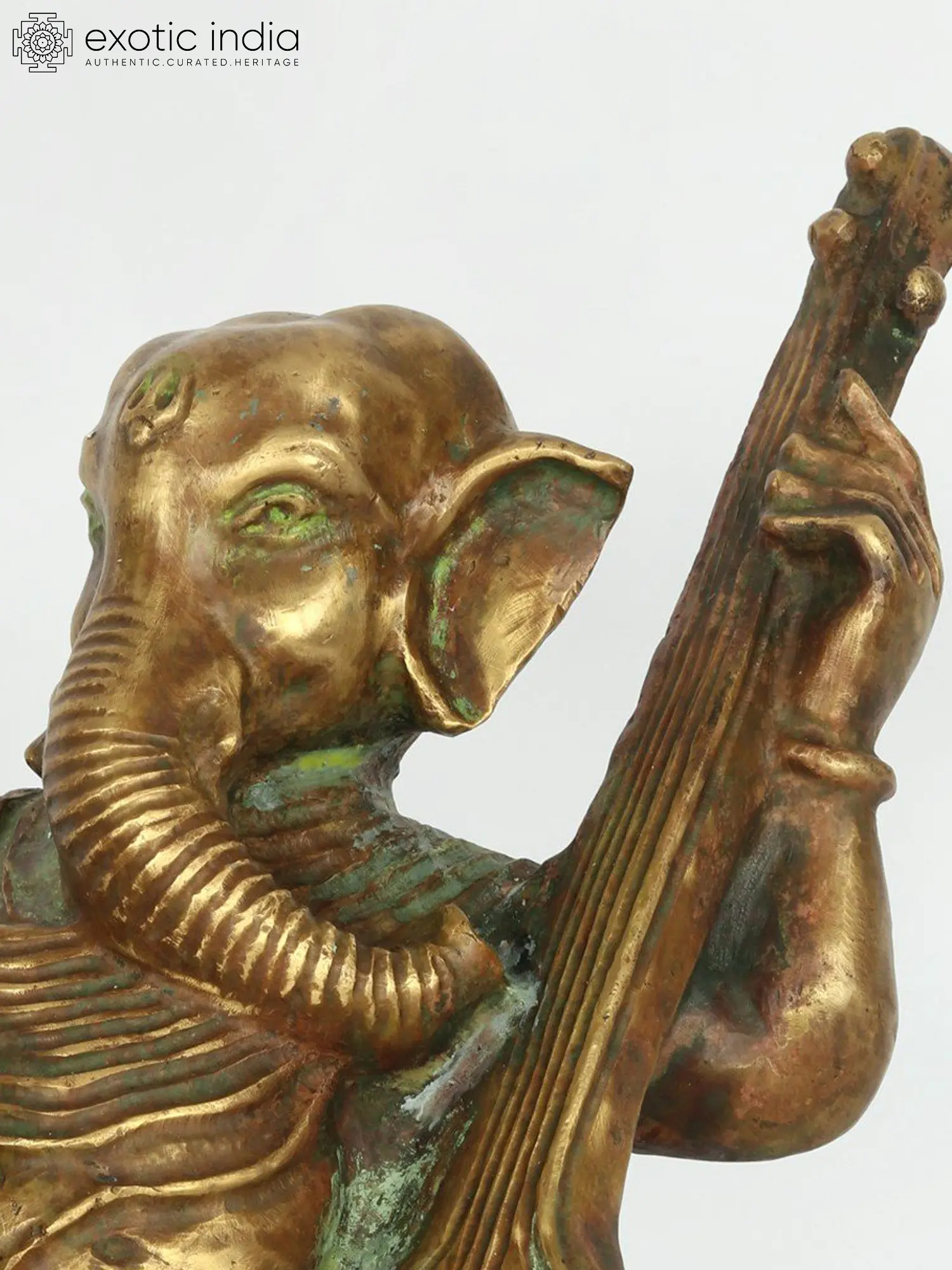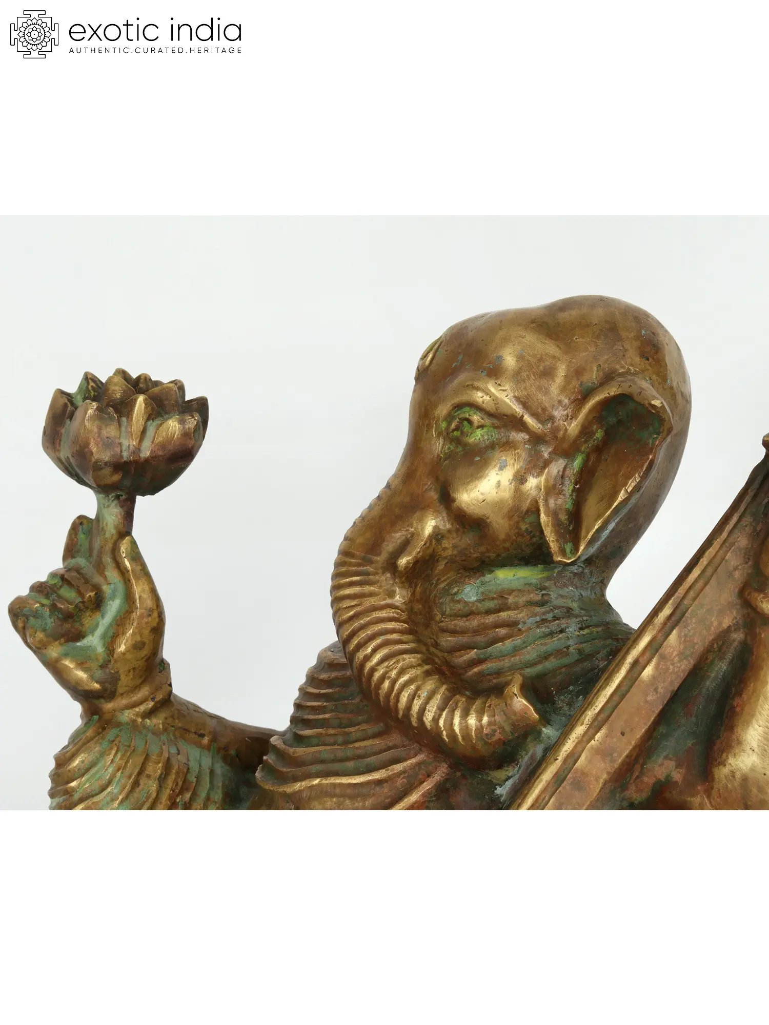 In a rather amusing representation, carved in the Panchaloha bronze - is this idol of Lord Ganesha. Seated in ease, his feet are adjoined as Ganesha places the Sitar on the support of his left thigh. Facing the side, his forehead is adorned with a Trishula Tilak representing clarity, logic, and wisdom. Holding a Padma in his right hand, his body is covered with a simple yet layered garb. Ganesha who’s Vighnaharta, is a patron of joy and arts in this avatar.