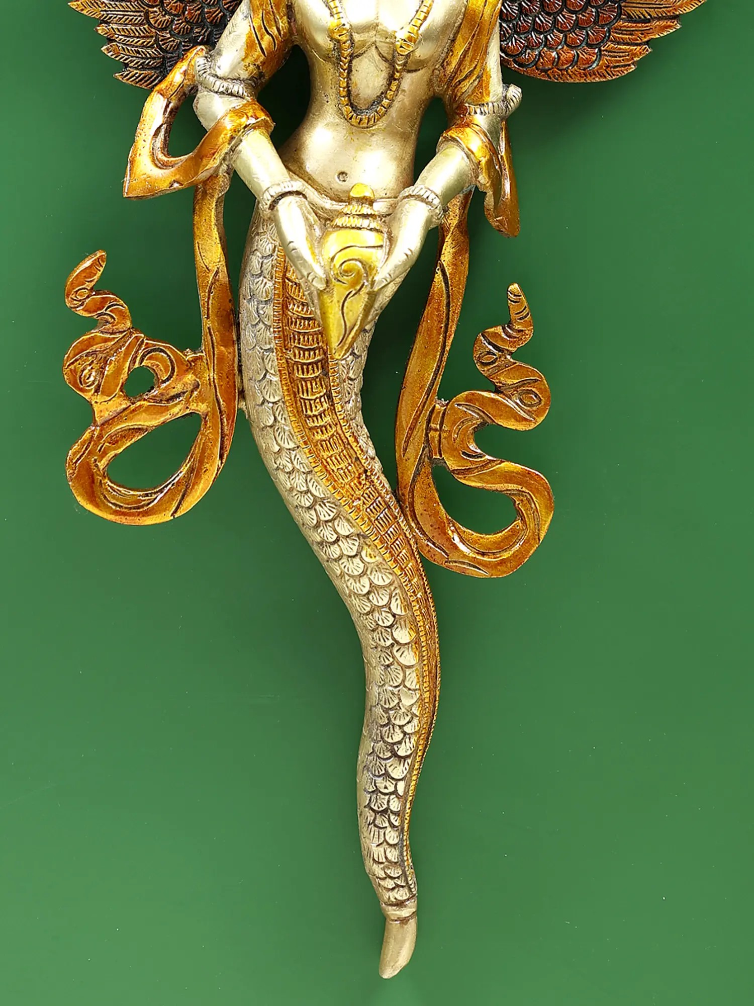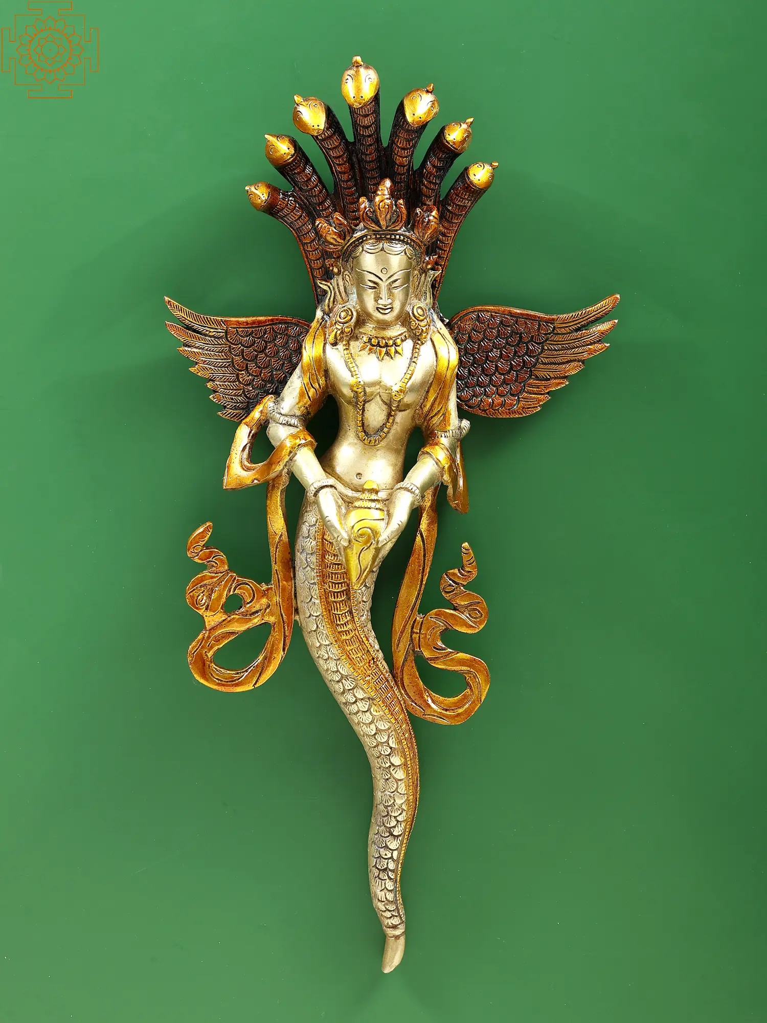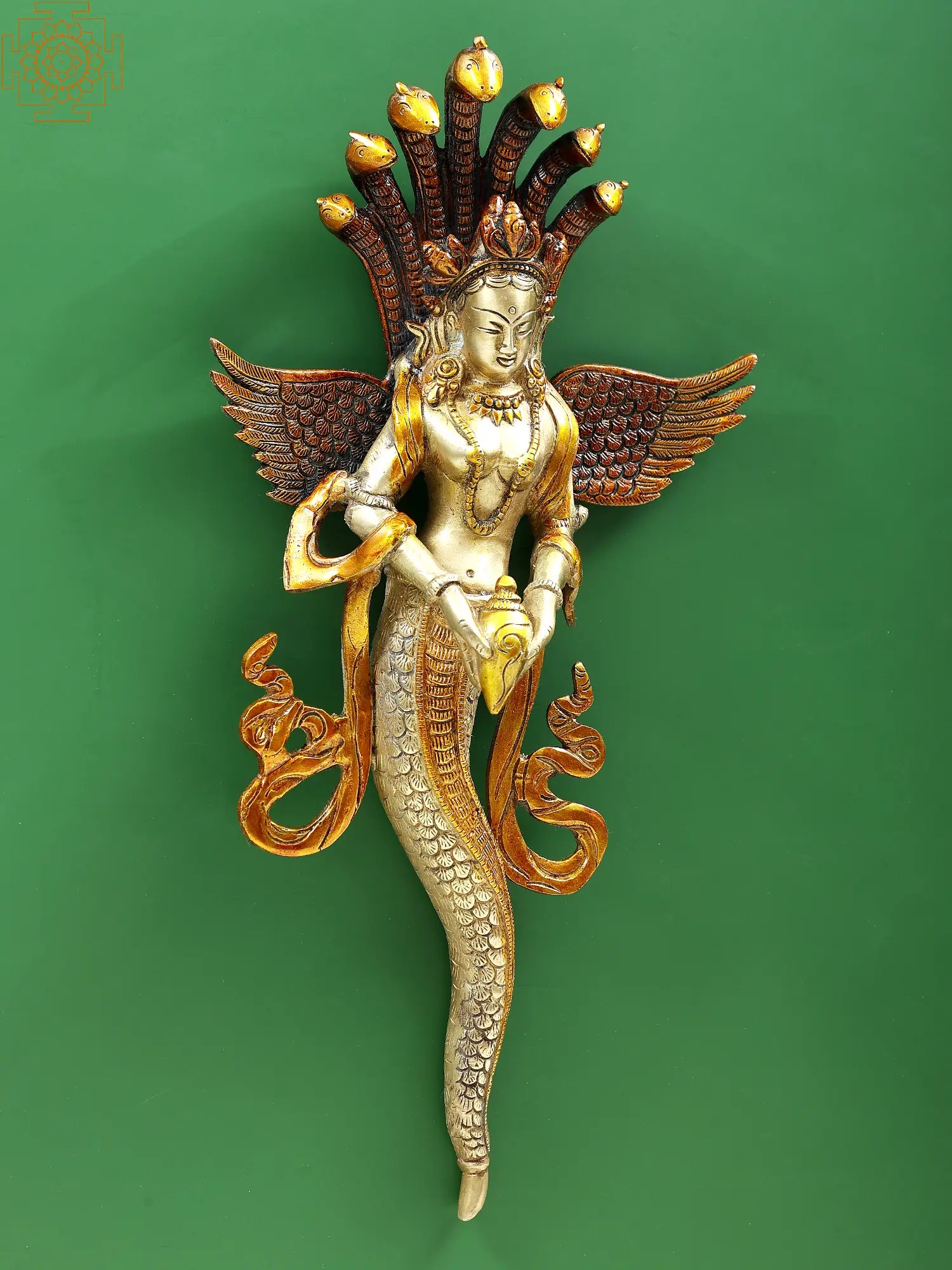 This brass wall hanging depicts the Naga Kanya with Garuda wings and a conch, symbolizing the awakening to a higher level of enlightenment.