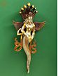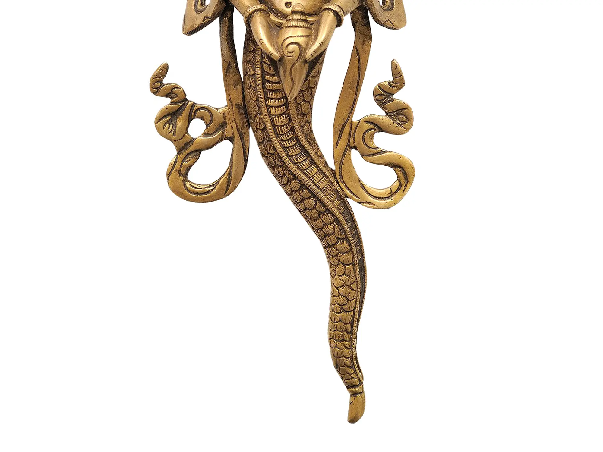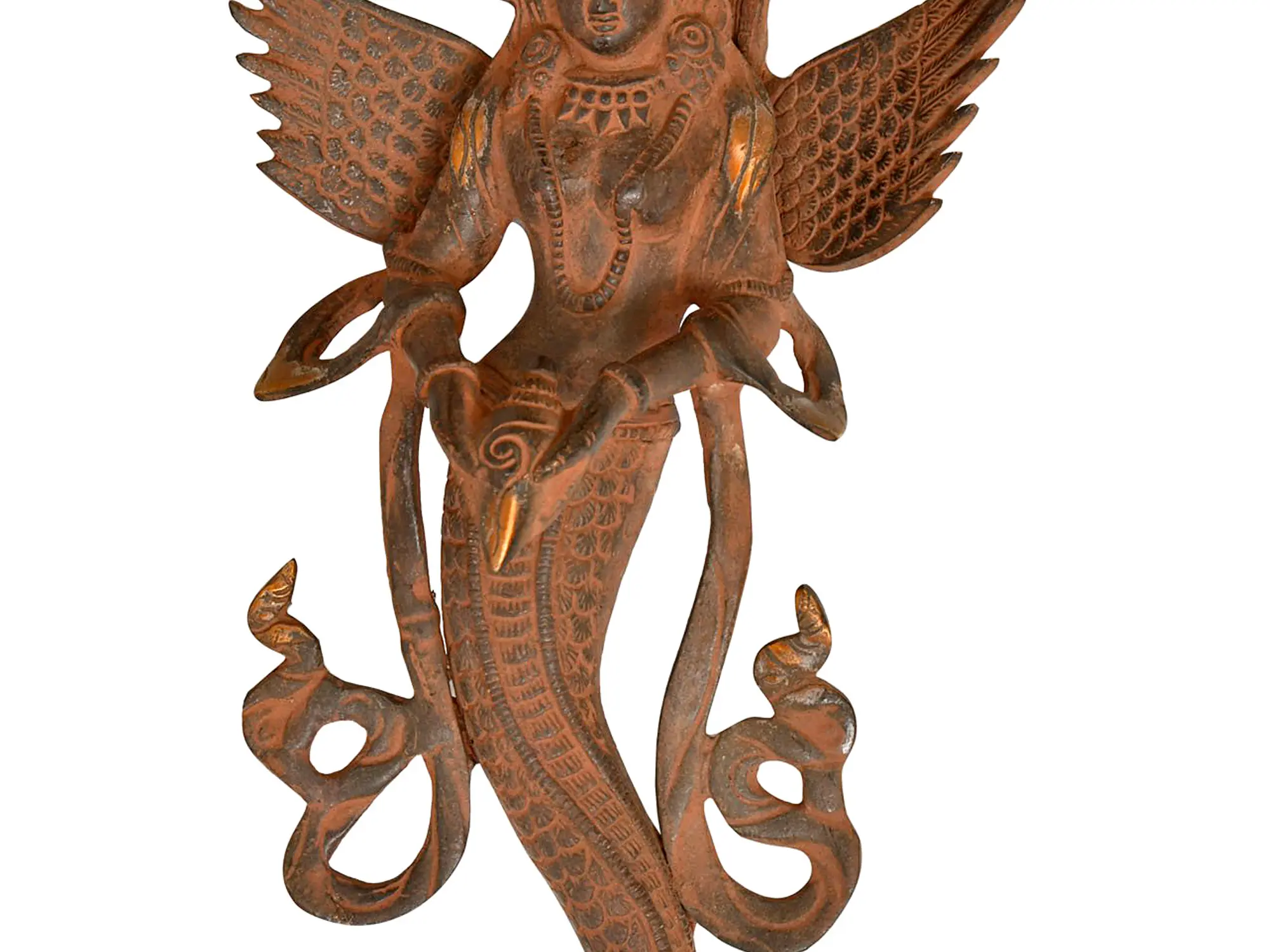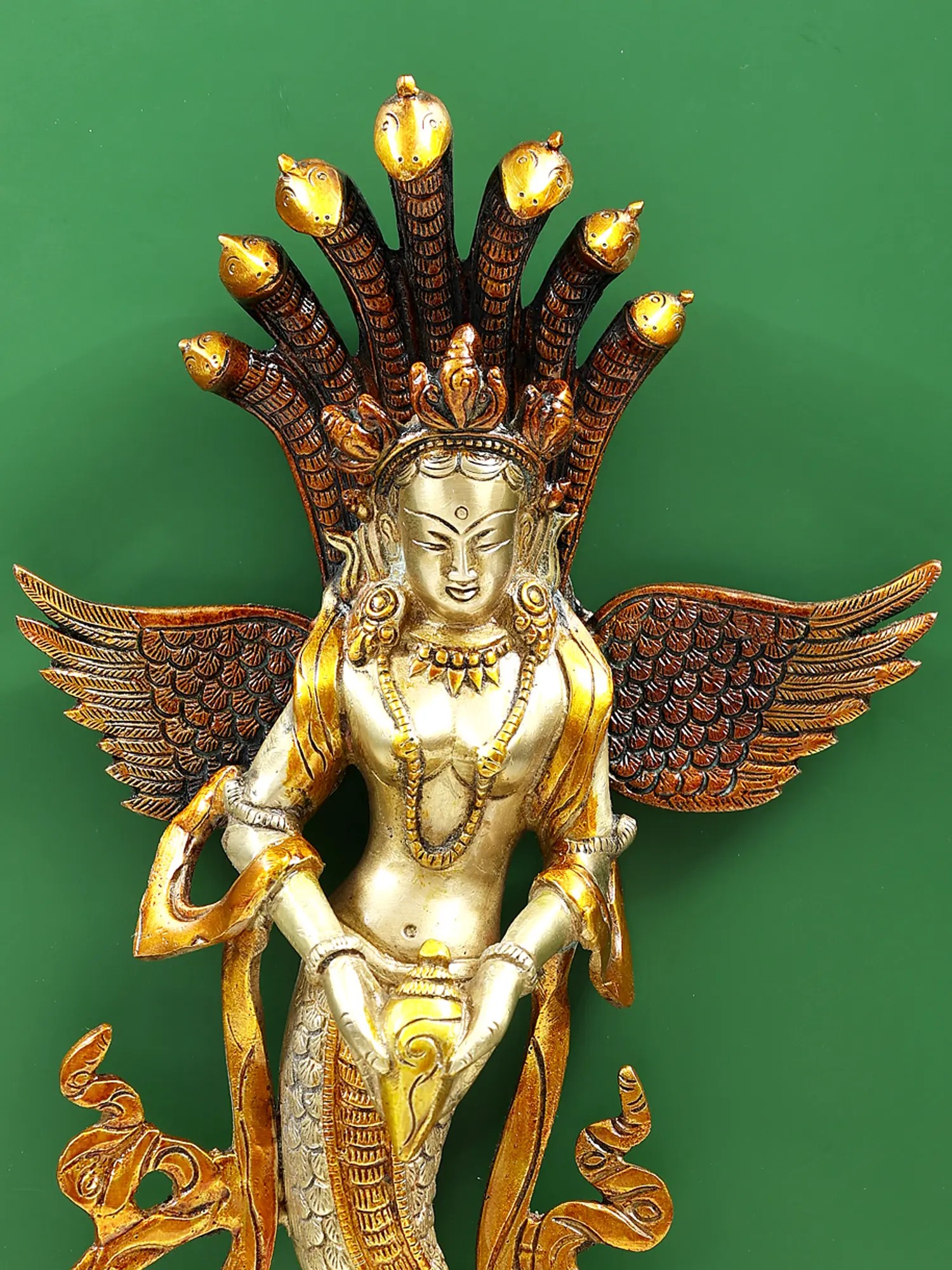 This brass wall hanging depicts the Naga Kanya with Garuda wings and a conch, symbolizing the awakening to a higher level of enlightenment.