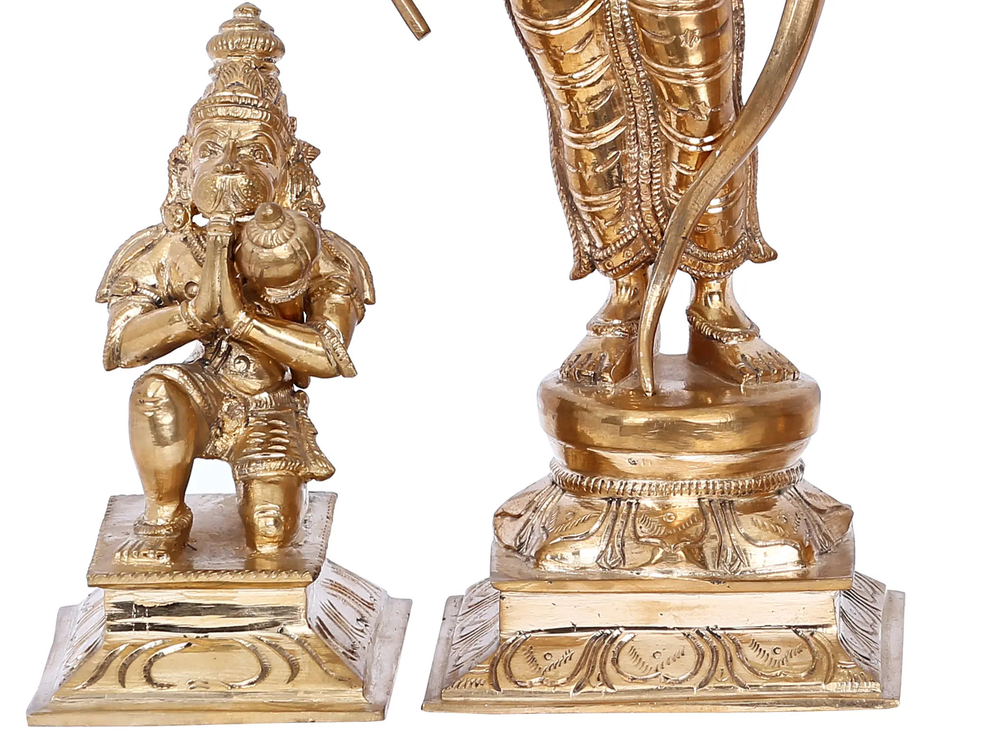 Immerse your sacred space with the divine energy and timeless elegance of this exquisite Rama Durbar. This magnificent bronze ensemble captures the essence of devotion and righteousness, bringing the beloved figures of Lord Rama, Sita, Lakshmana, and Hanuman to life. Crafted using the ancient Madhuchista Vidhana (lost-wax) technique by master artisans in Swamimalai, renowned for their centuries-old tradition of temple bronze casting, this piece is a testament to unparalleled craftsmanship and spiritual artistry. The central figure of Lord Rama stands tall, embodying grace and strength, with his ever-present bow and arrow signifying his role as the protector of dharma. Beside him, Sita radiates compassion and serene beauty, a symbol of unwavering loyalty and virtue. Lakshmana, the devoted brother, stands guard, ever vigilant and ready to serve. Completing this divine tableau is Hanuman, the epitome of selfless devotion and strength, depicted here in a posture of profound reverence. Together, they form the revered Rama Durbar, a depiction that resonates deeply within Hindu culture, symbolizing ideal relationships, duty, and the triumph of good over evil. The Panchaloha bronze, a sacred alloy traditionally comprising five metals, imbues these figures with a mystical aura and enduring presence. The intricate detailing, from the flowing garments and ornate jewelry to the serene expressions on their faces, speaks volumes about the meticulous skill and spiritual connection of the creators. Each curve, each contour, is a whisper from ancient tales, a visual representation of the epic Ramayana, which continues to inspire millions across generations. This sculpture is more than just an object of art; it is a conduit for spiritual energy, a focal point for meditation, and a beautiful reminder of the virtues espoused by Lord Rama and his divine companions.