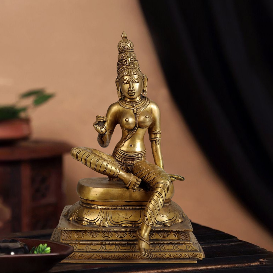 In this brass Uma statue the goddess is placed on an upturned lotus pedestal which is kept on another square platform. With one leg folded and another dangling, the goddess is in the posture of royal ease, known as Lalitasana.