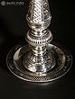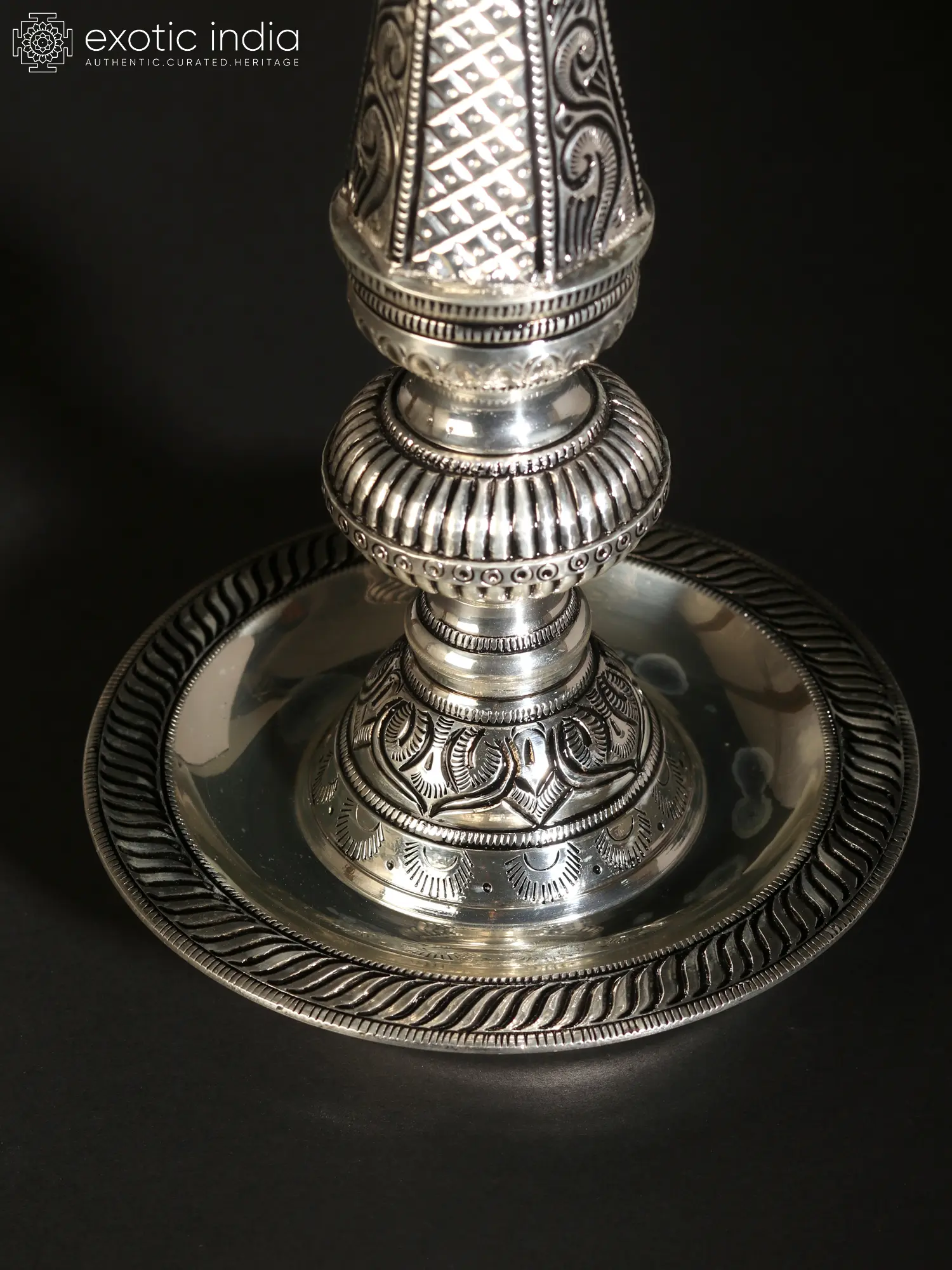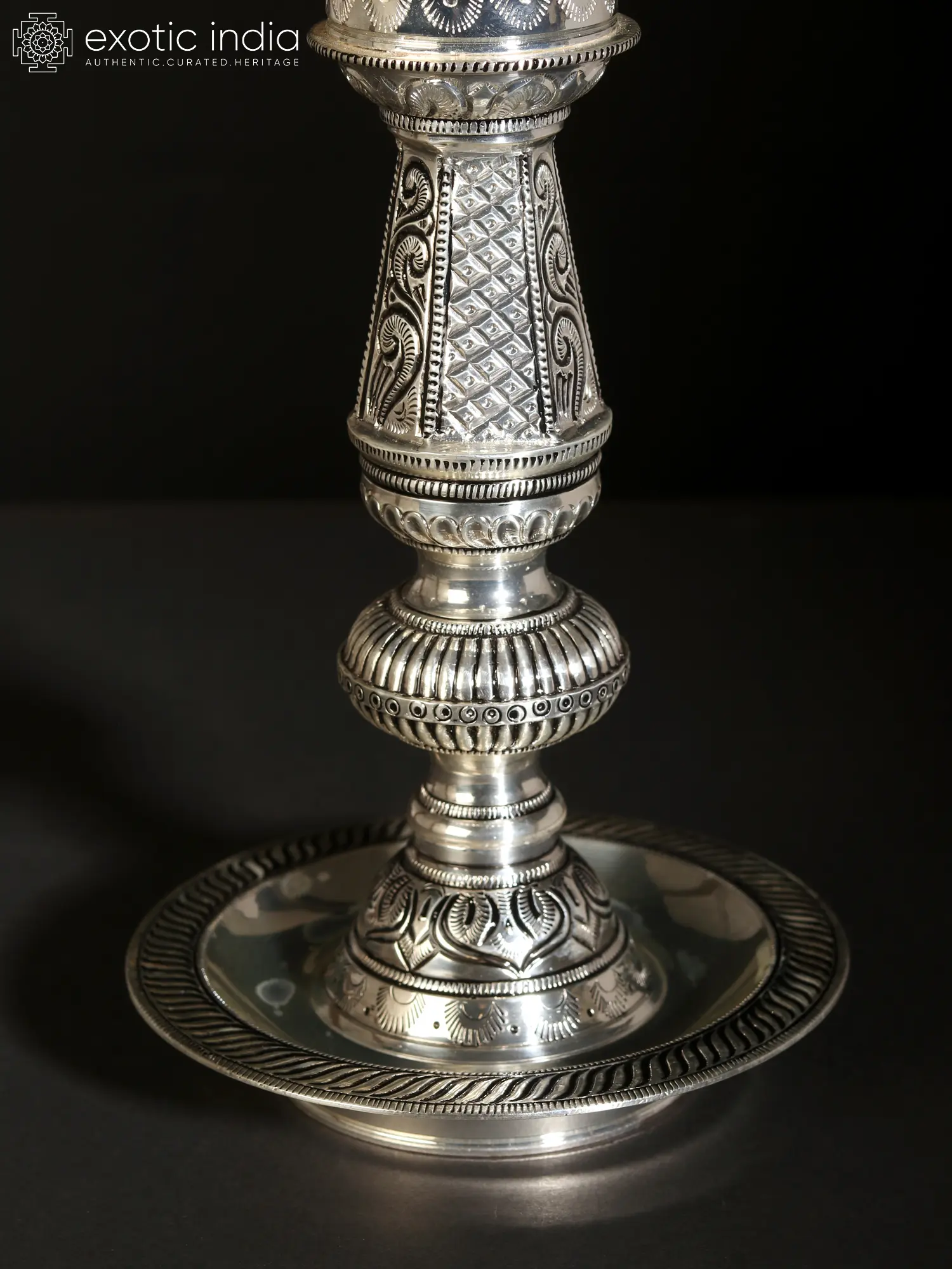 The lamp's silver plating imparts a regal charm, while the ornate brass embossing on the stem adds intricate detailing. With five wicks, the lamp provides ample illumination, and the disc at the bottom collects dripping oil. Beyond its functional role, this lamp becomes a ritual object, embodying cultural aesthetics and spiritual significance, connecting the present to a rich heritage of temple lighting and religious practices.