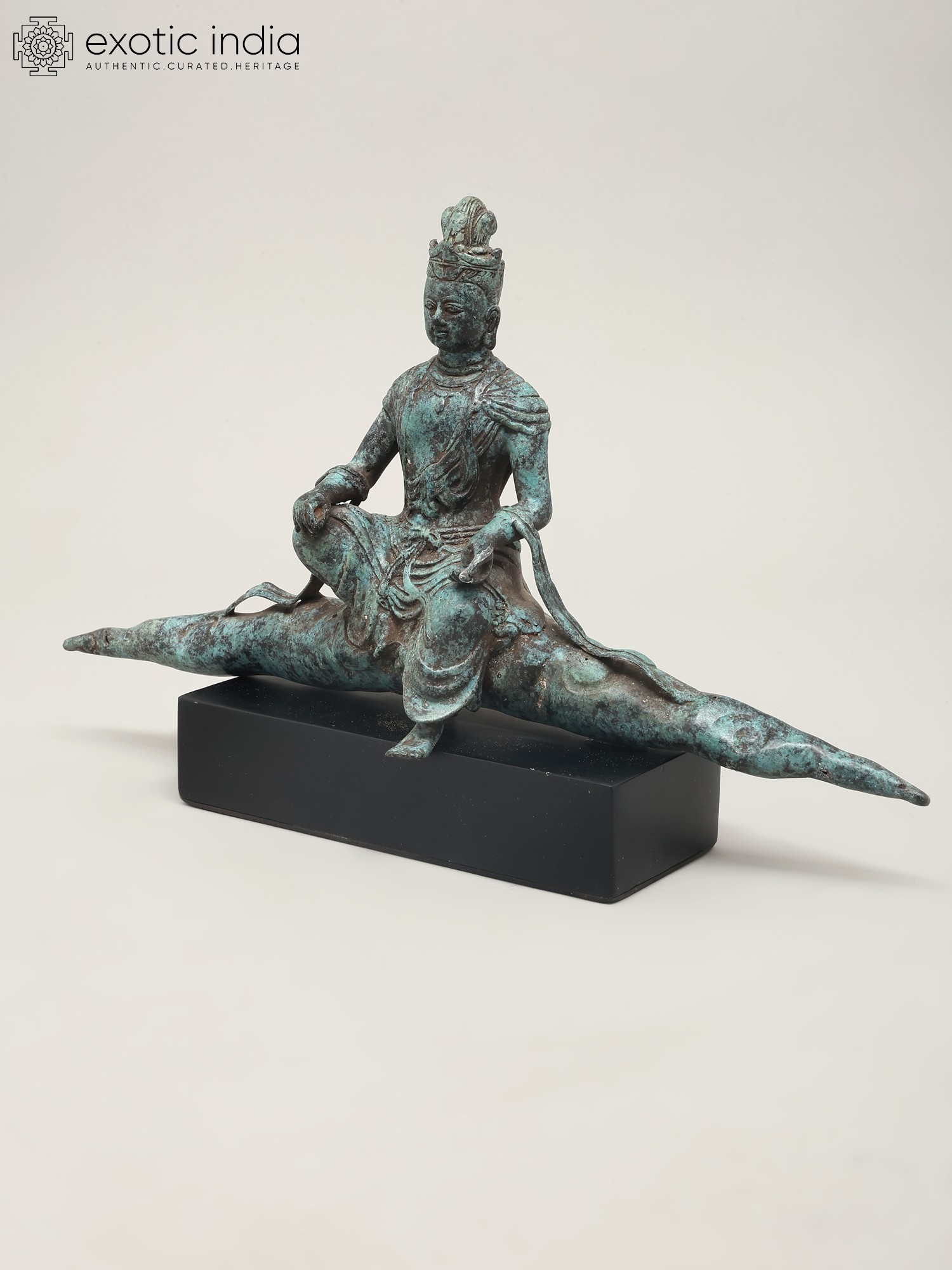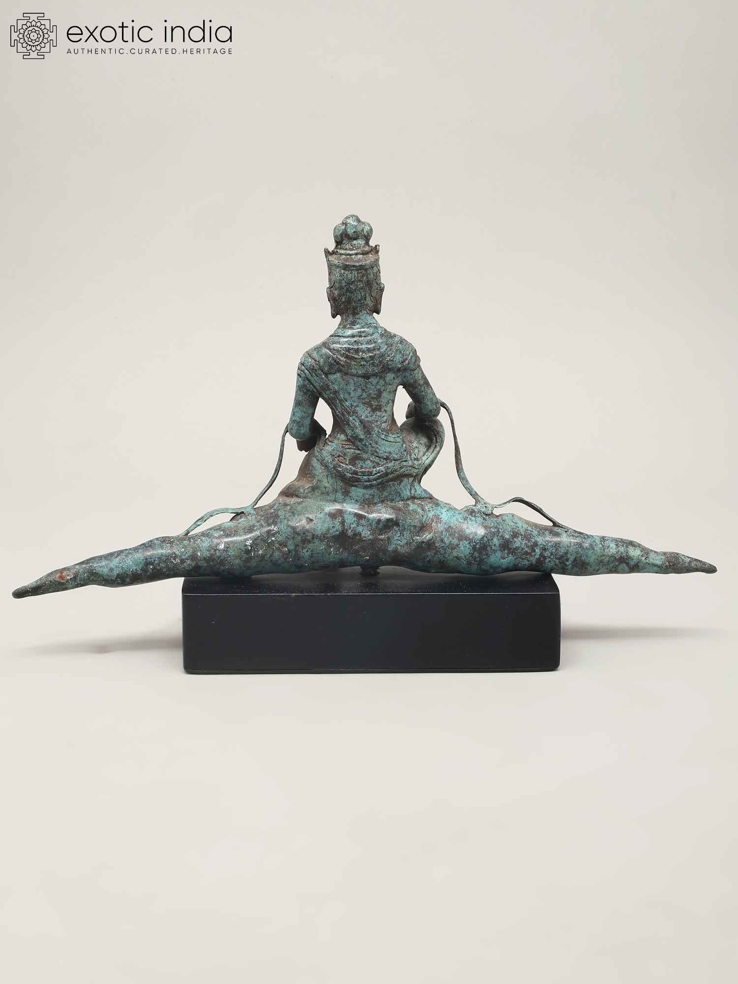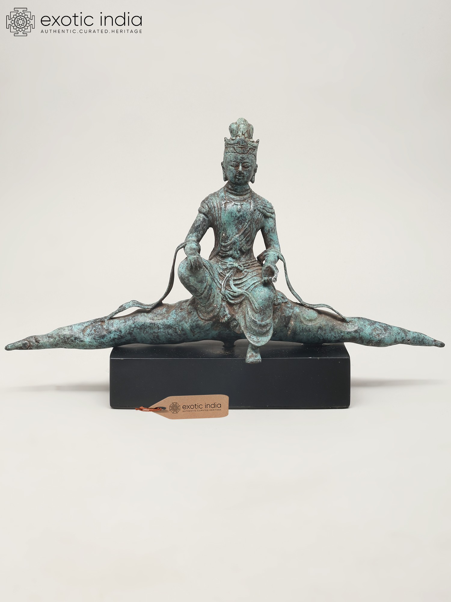 This captivating statue, originating from Indonesia, is an artful representation of Lord Indra. It is a testament to the enduring legacy of Indonesian craftsmanship, drawing inspiration from the rich artistic traditions of the region. The statue’s unique pose showcases the god seated with his legs extended, each resting on its own support. The wood stand provides a solid and elegant base, accentuating the beauty of the sculpture. This piece is created using the lost wax method, a time-honored technique that results in intricate detailing and a high level of precision. Molten brass is poured into a meticulously crafted wax mold which is then melted away, leaving behind a solid brass sculpture. The finish is a captivating patina, giving it the appearance of an ancient artifact.