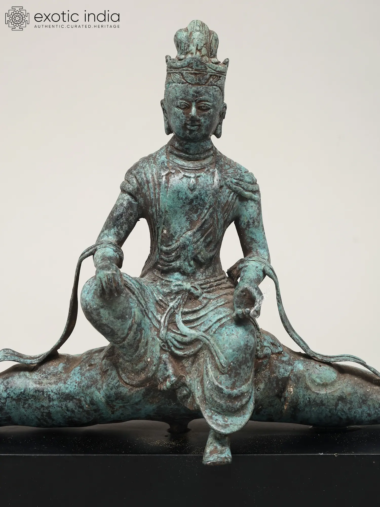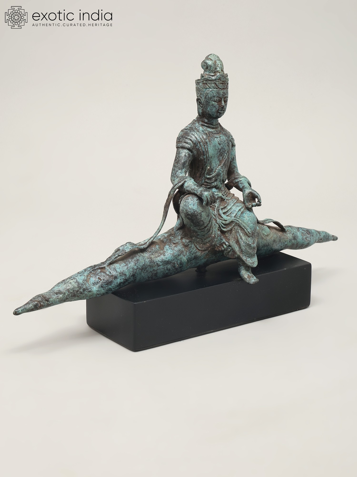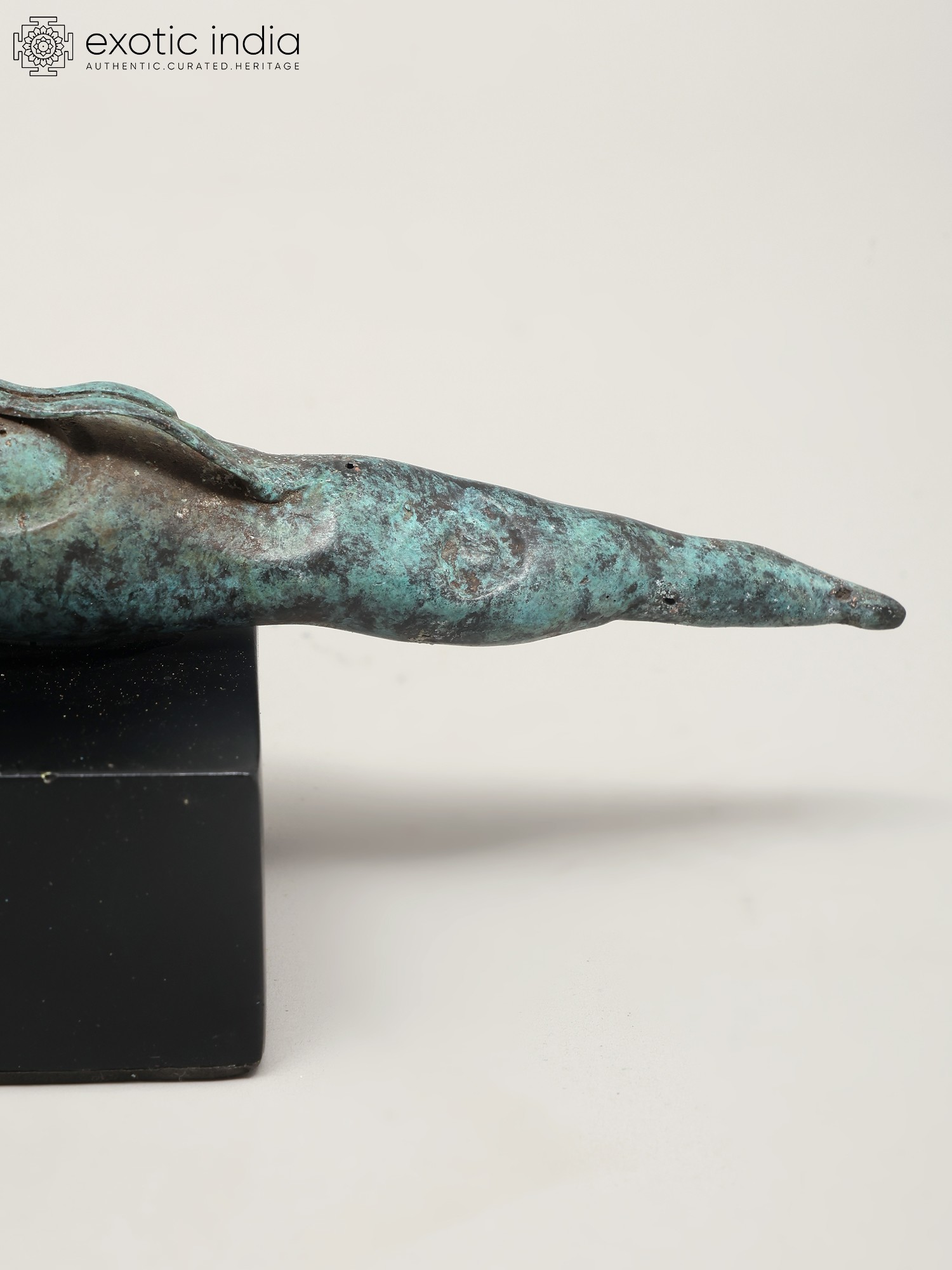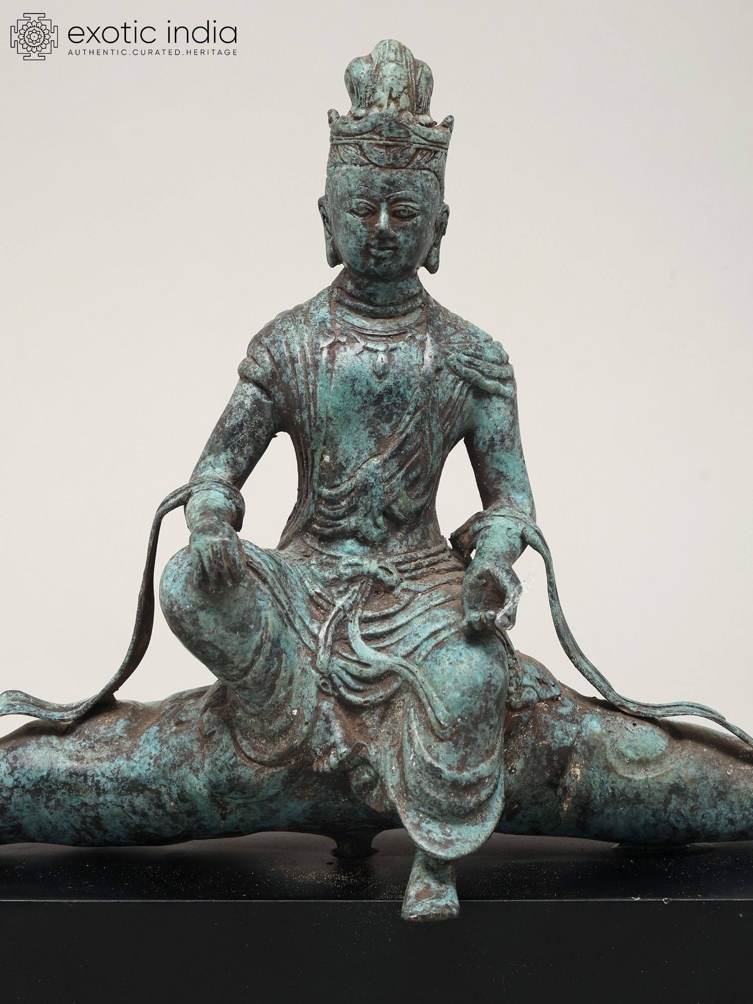 This captivating statue, originating from Indonesia, is an artful representation of Lord Indra. It is a testament to the enduring legacy of Indonesian craftsmanship, drawing inspiration from the rich artistic traditions of the region. The statue’s unique pose showcases the god seated with his legs extended, each resting on its own support. The wood stand provides a solid and elegant base, accentuating the beauty of the sculpture. This piece is created using the lost wax method, a time-honored technique that results in intricate detailing and a high level of precision. Molten brass is poured into a meticulously crafted wax mold which is then melted away, leaving behind a solid brass sculpture. The finish is a captivating patina, giving it the appearance of an ancient artifact.