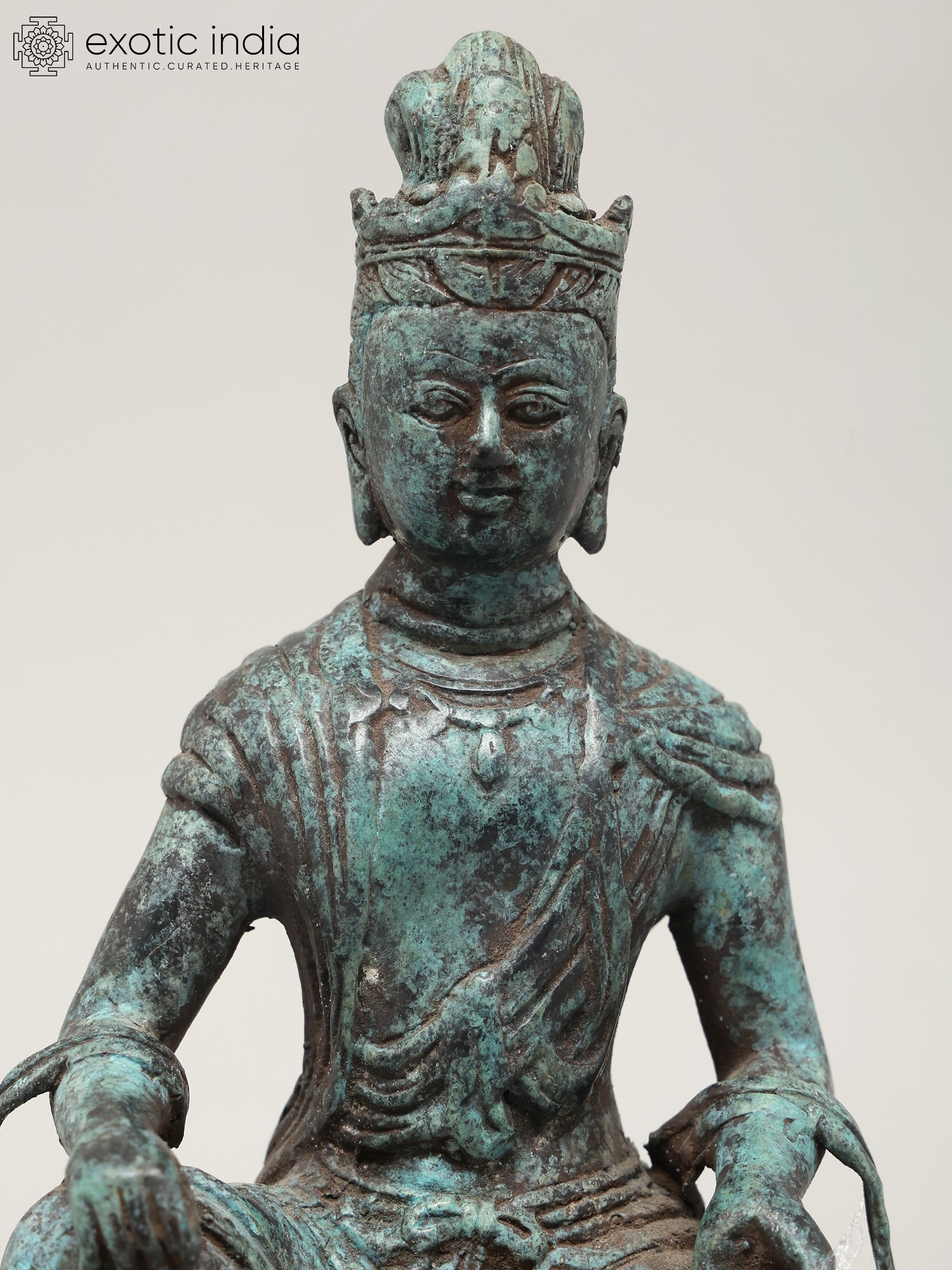 This representation of Lord Indra is more than just a decorative piece; it's a profound symbol of balance, power, and protection. The unique asana in which he sits represents control, mastery over the elements, and a grounding presence. He sits above the world, calm, collected and benevolent. Displaying this statue in your home or sacred space can serve as a reminder of Indra's qualities, inspiring strength, courage, and a commitment to maintaining harmony. Its intricate details and aged finish make it a striking addition to any collection of artifacts or religious iconography, inviting contemplation and a connection to the divine.