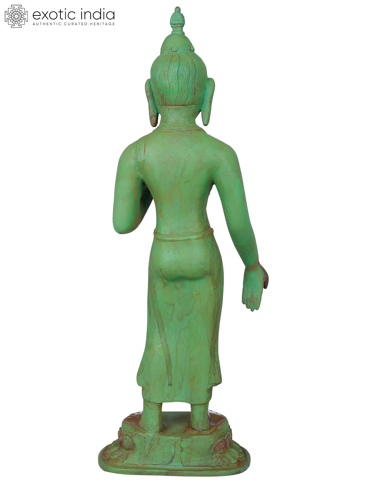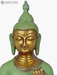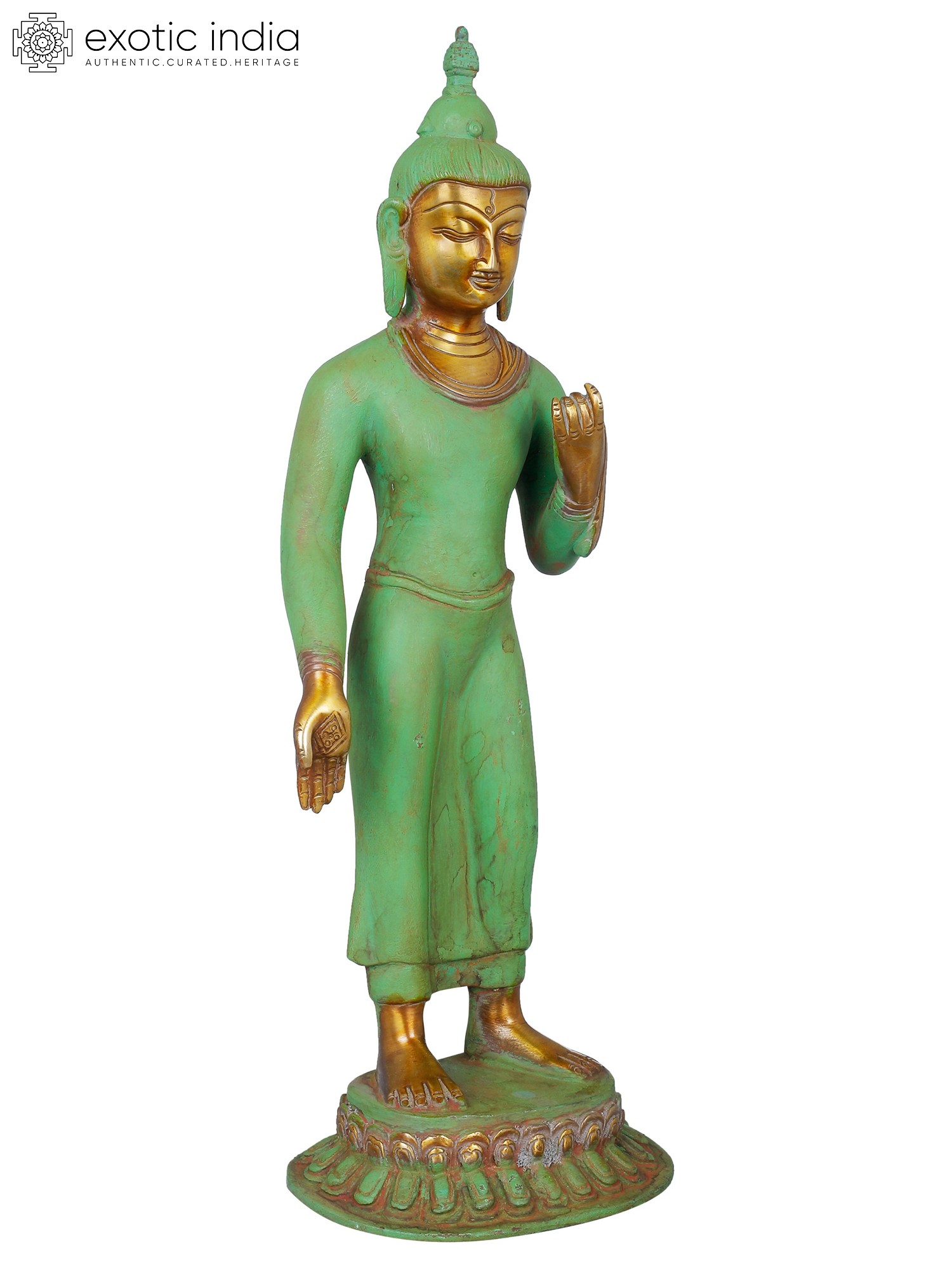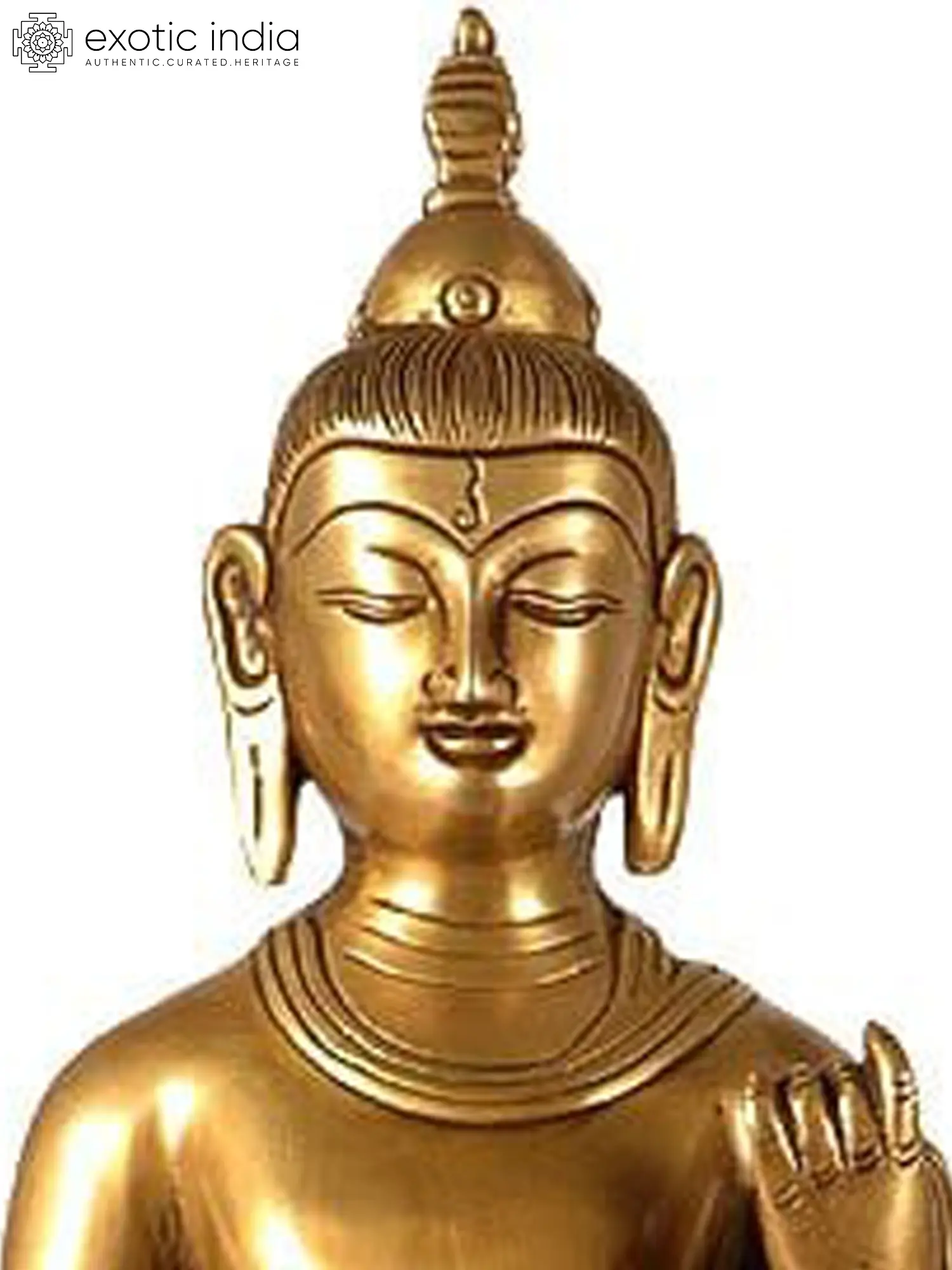Crafted by skilled artisans in India, this brass sculpture is more than just a decorative piece; it is a testament to generations of artistic tradition and deep devotional practice. The meticulous attention to detail, from the urna on the forehead, symbolizing spiritual insight, to the ushnisha, a cranial protuberance representing his awakened mind, speaks of a profound understanding of Buddhist iconography. The cool, earthy tones of the robe contrast beautifully with the golden sheen of the face and hands, creating a visual harmony that is both striking and calming. Each sculpture is a unique work of art, carrying with it the spirit and dedication of its maker, and offering a tangible connection to the spiritual heritage of India. ––––––––––