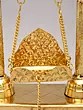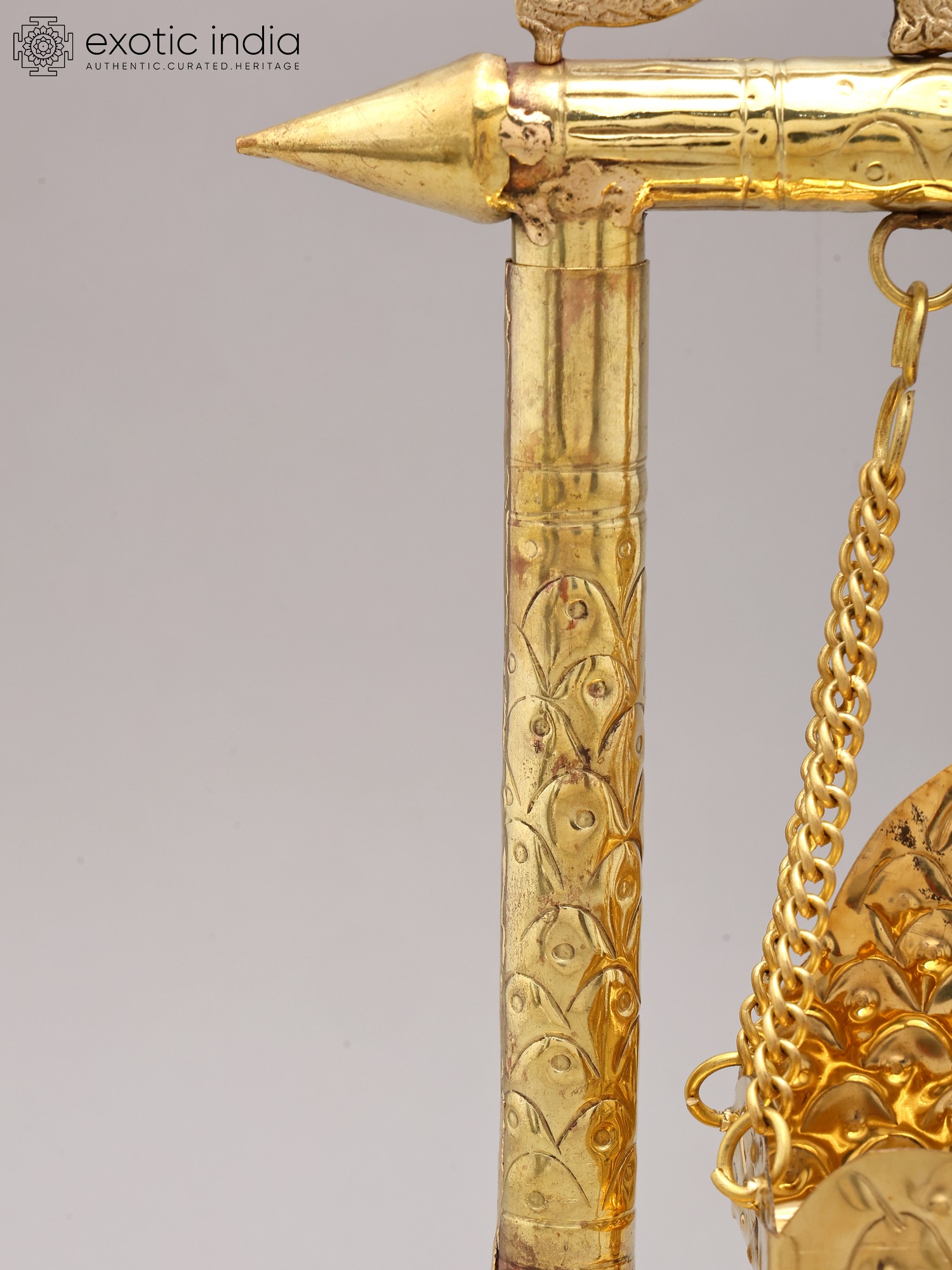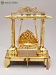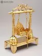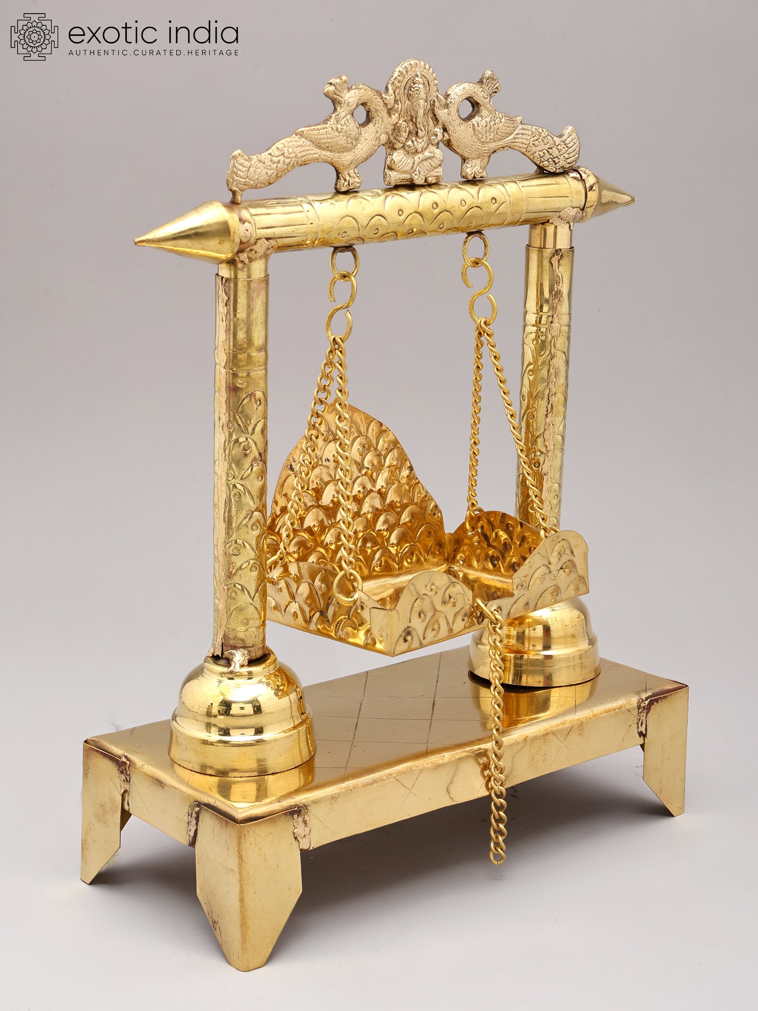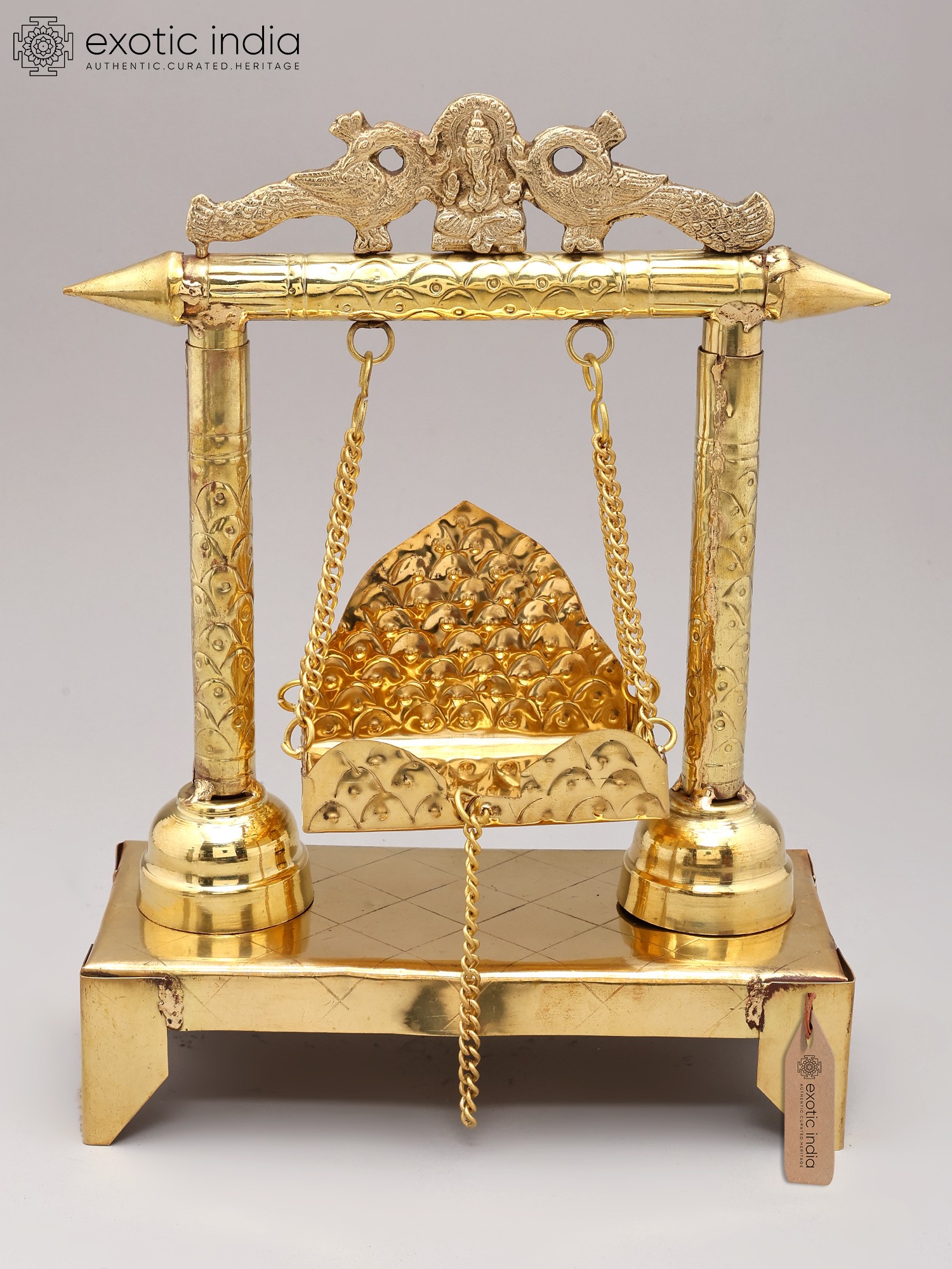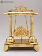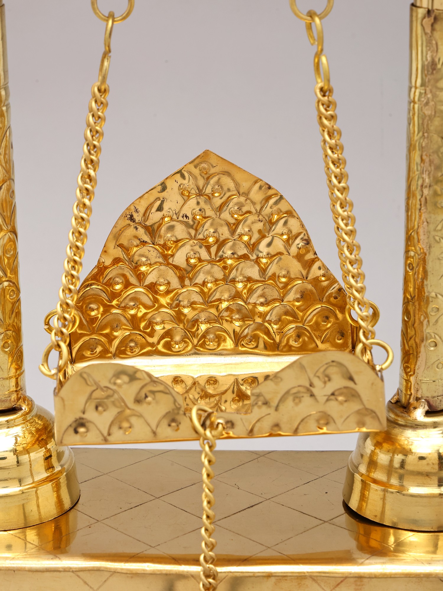 The carefully decorated seating area becomes a throne for the beloved deity, inviting moments of serenity and worship. This brass masterpiece is more than a swing; it's a visual symphony of devotion, evoking a sense of cosmic embrace.
