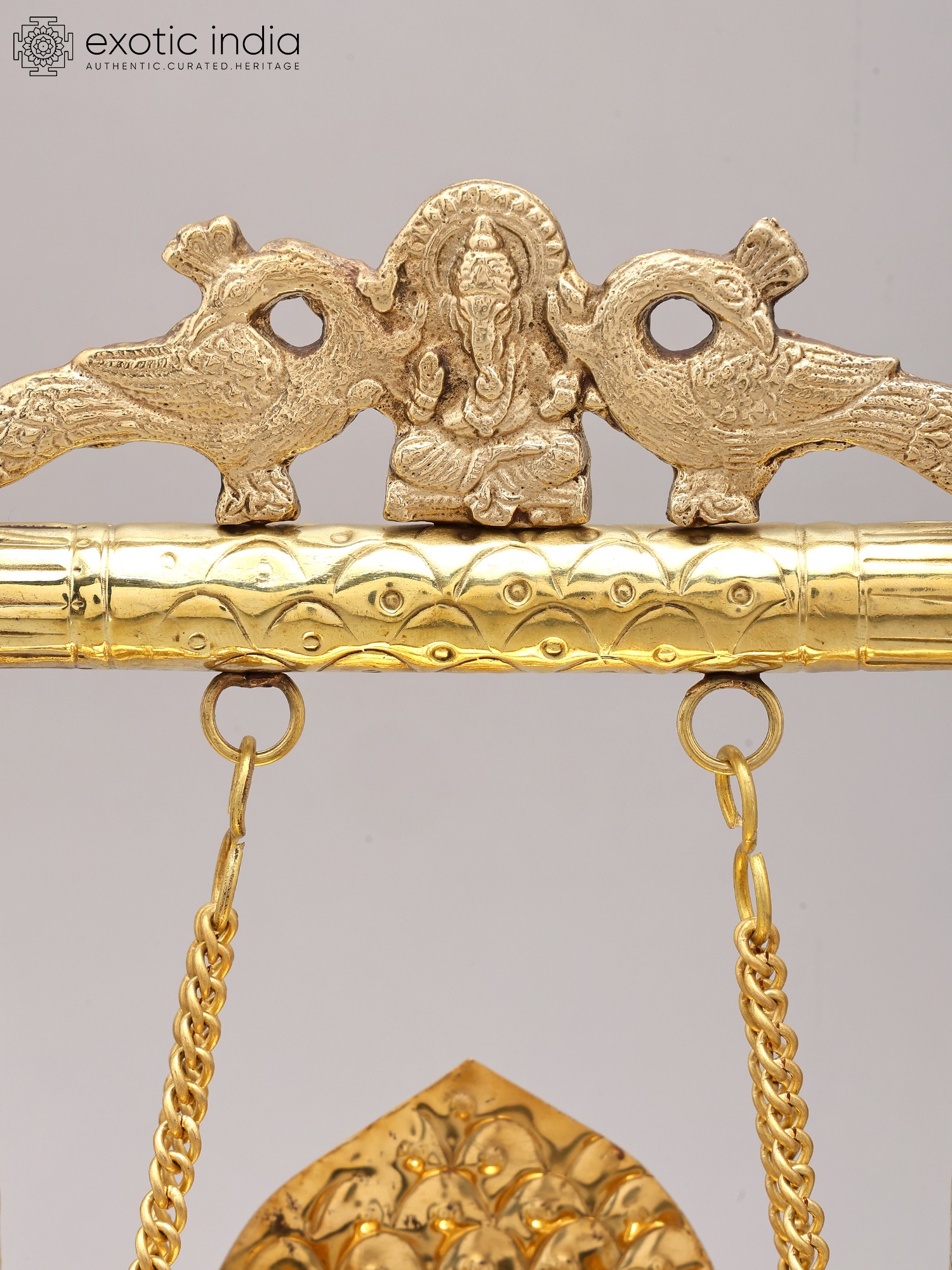 This Swing for Your Favourite Deity in Brass transforms your sacred space into a haven of divine love and protection. At its pinnacle, the image of Radha Krishna radiates celestial affection, overlooking the favorite deity with grace. Two regal pillars, adorned with ornate details, frame the setting, creating an atmosphere of grandeur. Images of peacocks on either side add symbolic beauty, symbolizing love and fidelity.