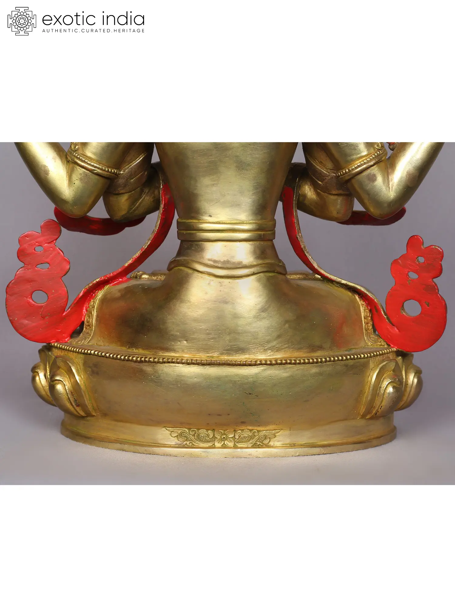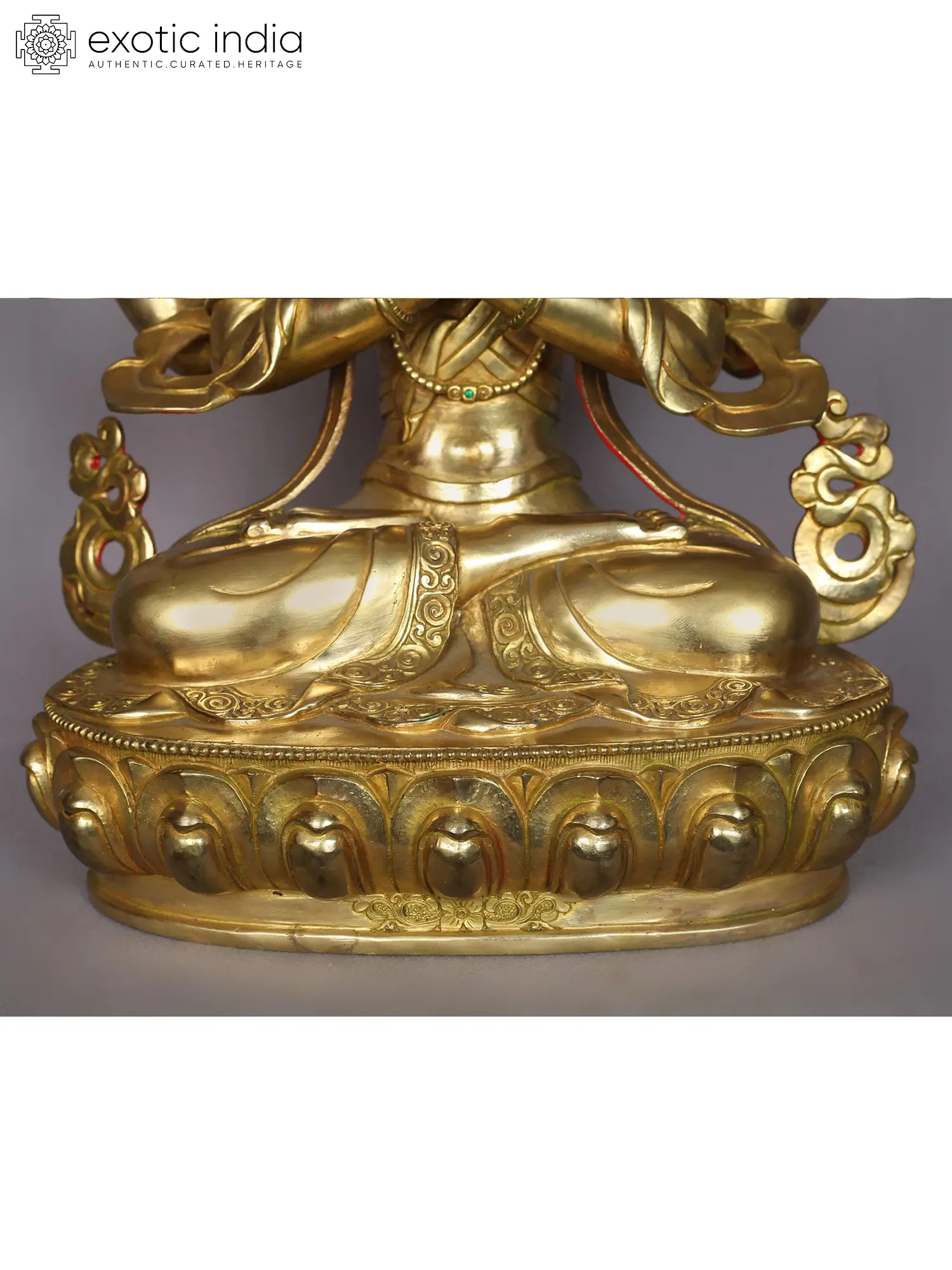 His attire consists of resplendent golden silks and ornaments befitting a Bodhisattva, symbolizing his extraordinary qualities. Chenrezig radiates a subtle warm smile brimming with profound understanding, love, and boundless compassion, as his eyes gaze benevolently upon all sentient beings.
