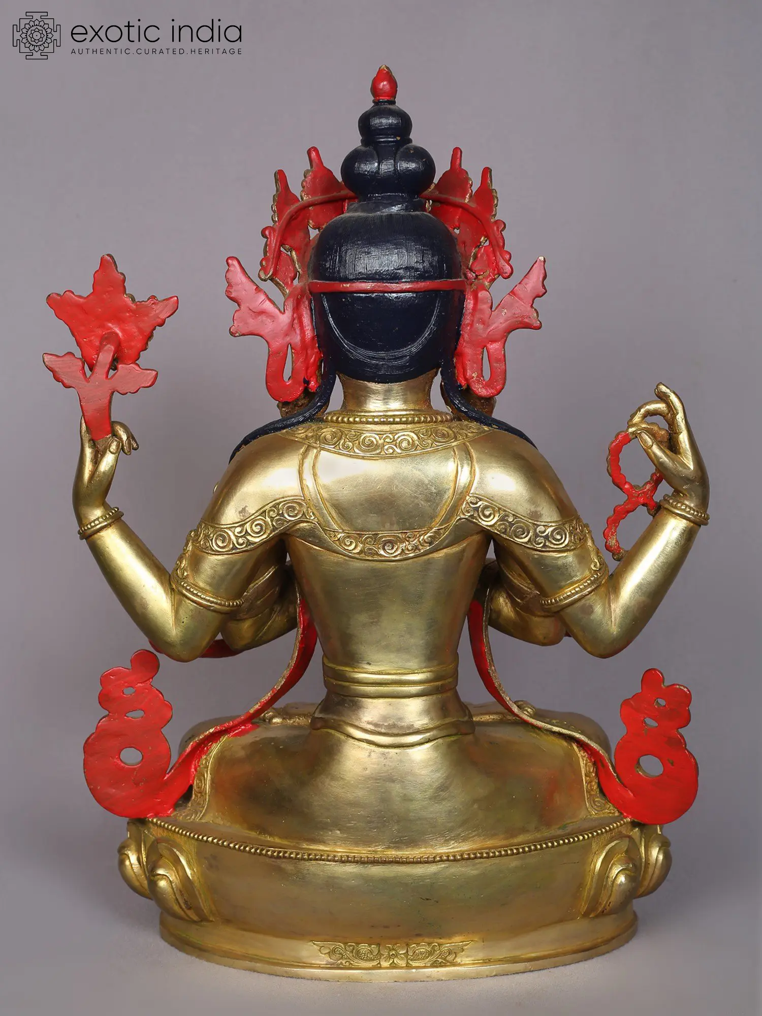 Chenrezig, also known as Avalokitesvara, is the most venerated among Bodhisattvas, embodying the boundless compassion of all Buddhas. He is seated atop a lotus, resting on the flat crescent moon. Among his four arms, two are clasped together in a prayerful gesture, holding the wish-fulfilling gem. In his left hand, he delicately cradles a lotus blossom, while in his right, he holds a crystal mala (rosary) for counting the repetitions of his mantra, "Om Mani Padme Hum."