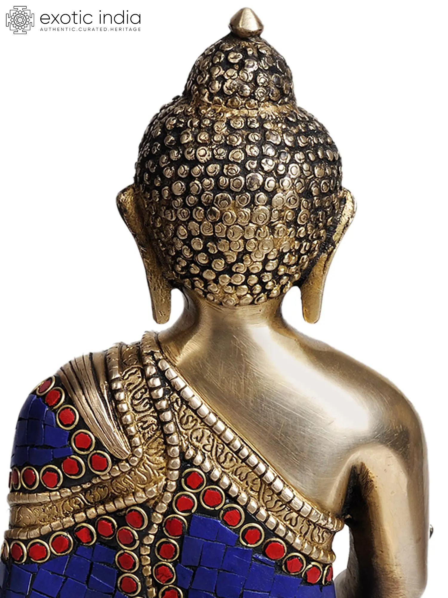 Encounter a tangible representation of healing and wisdom with this meticulously crafted statue, hand-made in India. More than just a decorative piece, this statue embodies the compassionate essence of the Medicine Buddha, revered across Tibetan Buddhism for his power to heal both physical and mental ailments. The fine detailing reflects the dedication and skill of the artisans who poured their heart and soul into bringing this sacred image to life. The intricate inlay work highlights the beauty of the sculpture.