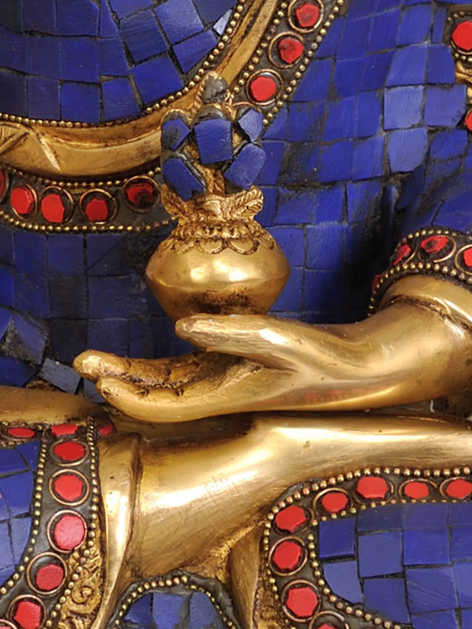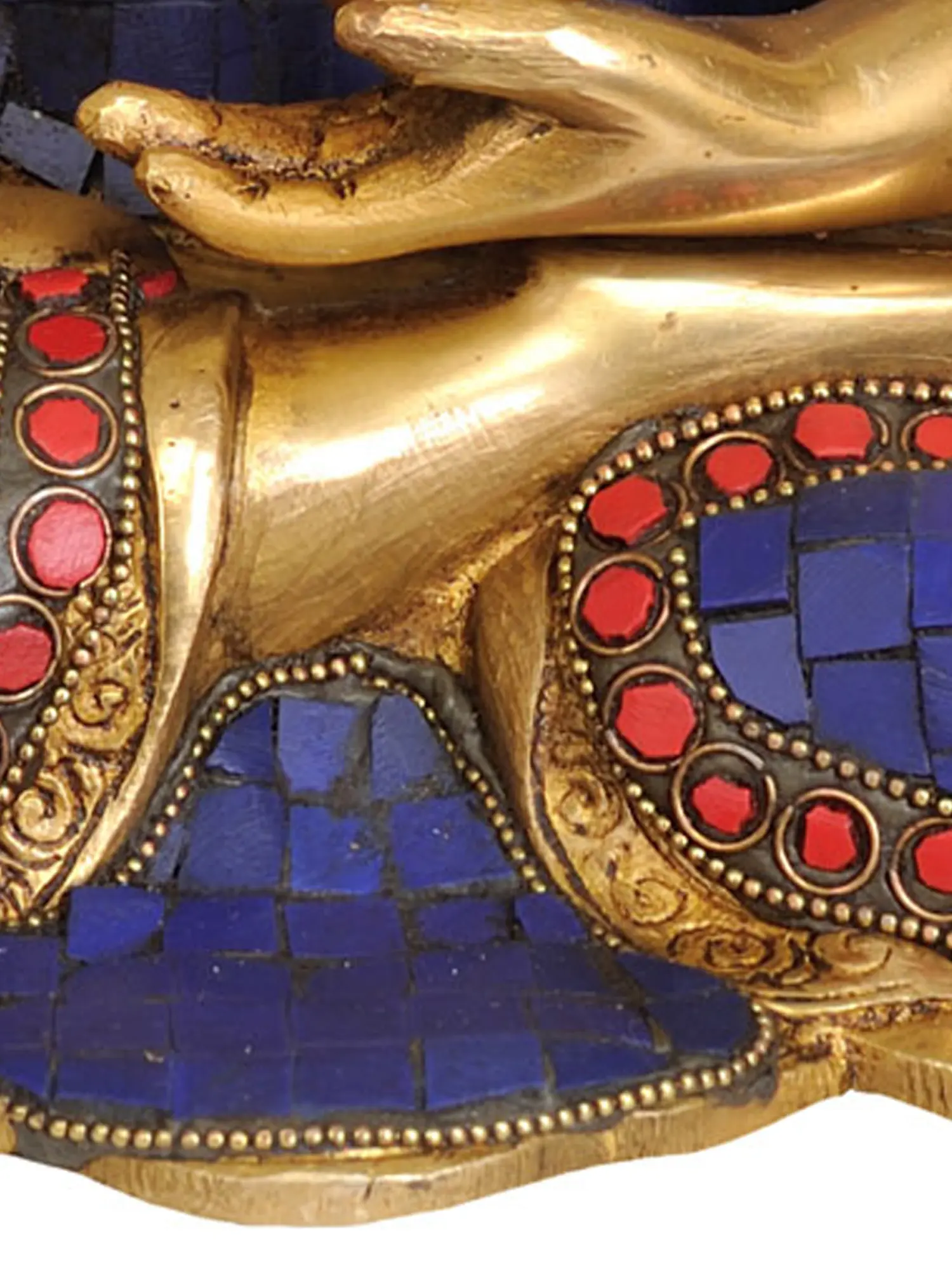 Behold a magnificent brass sculpture, a radiant embodiment of the Buddha's serene presence and profound wisdom. This striking piece, meticulously handcrafted in India, depicts the enlightened one in a tranquil seated posture, radiating an aura of peace and spiritual elevation. The warm, lustrous sheen of the brass serves as a divine canvas for the exquisite inlay work that adorns the deity's robes. The robes themselves are a spectacle of vibrant Lapis Lazuli, a stone revered for its deep celestial blue hue, believed by ancient cultures to represent the heavens and the divine. In many traditions, Lapis Lazuli is associated with healing and protection, its rich color thought to bring clarity of mind and inner peace. The intricate patterns are further enhanced by tiny, crimson carnelian stones, adding a touch of fiery energy and accentuating the regal beauty of the Buddha's attire. These stones are set with remarkable precision, forming borders that mimic the flowing folds of fabric, each tessellation a testament to the artisan's skill.