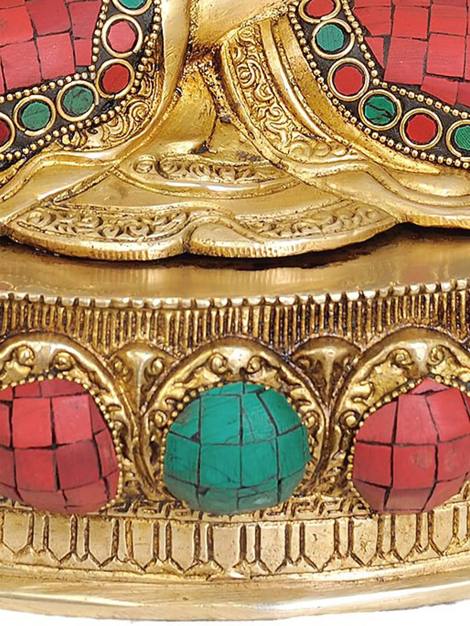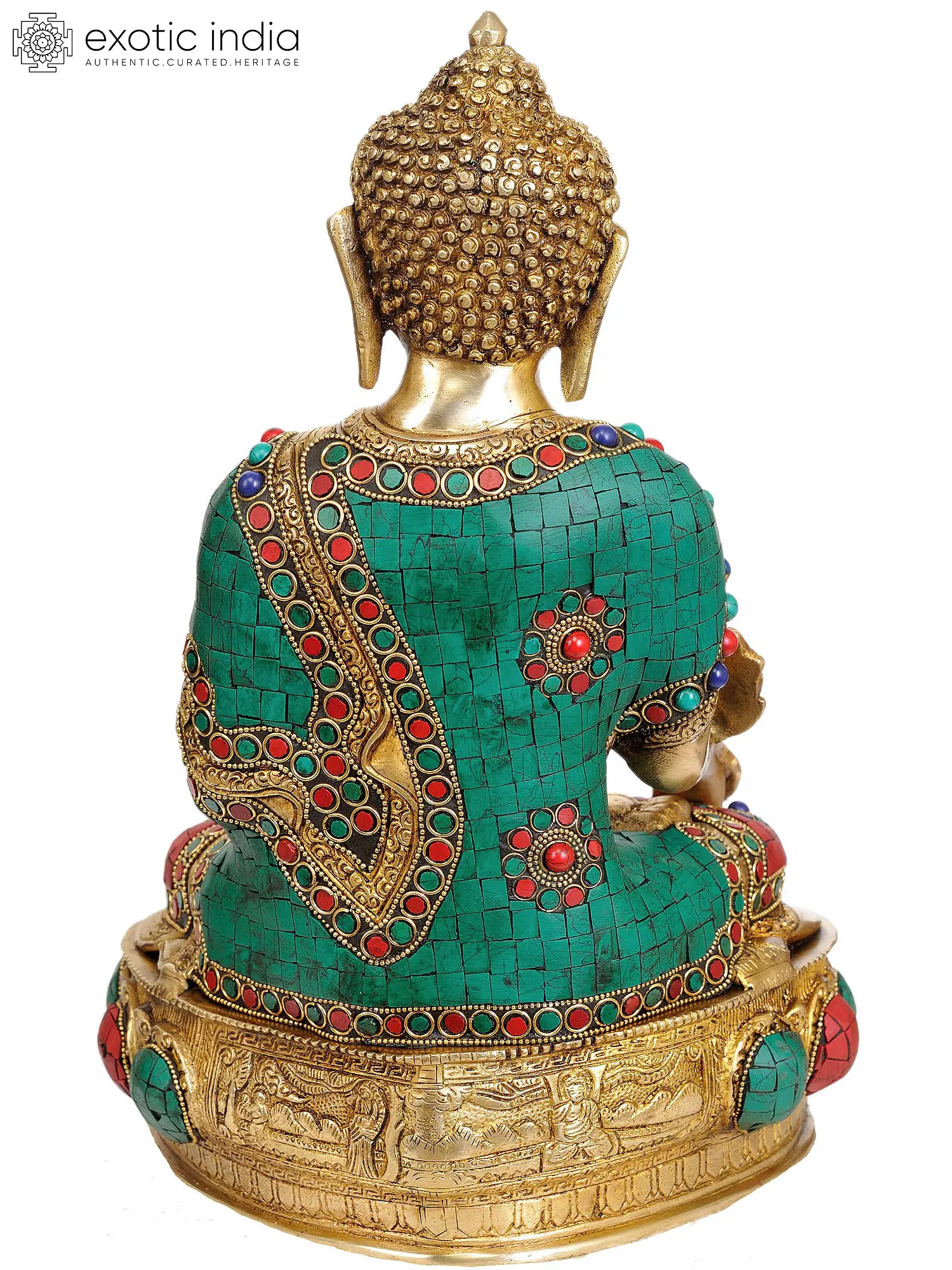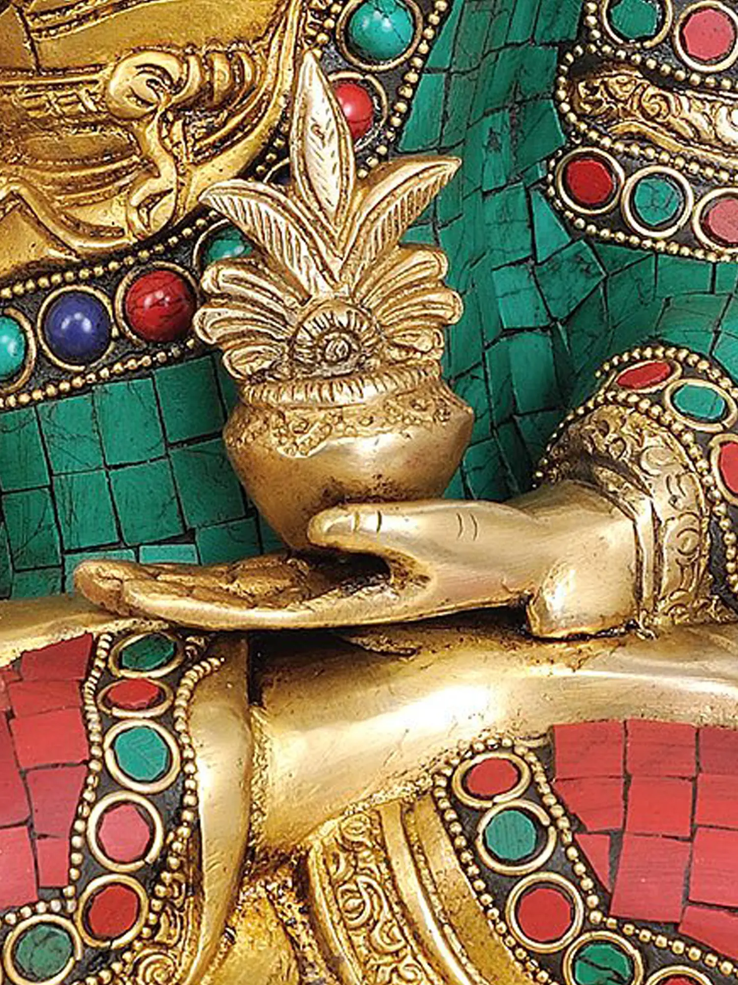 This magnificent statue is a testament to the artistry and spiritual devotion of Indian artisans. Handcrafted from high-quality brass, it possesses a lustrous sheen that speaks of its enduring beauty and value. The figure is adorned with vibrant inlays of precious and semi-precious stones, creating a rich tapestry of color. The robe is richly decorated, featuring a striking combination of red and green stones, interspersed with accents of blue and other hues, all meticulously set within ornate golden borders. These colors are not merely decorative; they hold symbolic significance in Buddhist art, representing various aspects of spiritual growth and enlightenment. The lotus base, a universal symbol of purity and spiritual awakening, further enhances the sacred aura of the sculpture. The posture of the Medicine Buddha in this sculpture is also significant. He is shown seated in the lotus position, a pose of deep meditation and stability. His left hand rests in his lap, palm upwards, often cradling a bowl of medicinal herbs or nectar, while his right hand is extended towards the earth in the *vitarka mudra* or the *abhaya mudra*, gestures symbolizing teaching or dispelling fear, respectively. This particular depiction often emphasizes his role as a protector and healer, offering solace and reassurance.