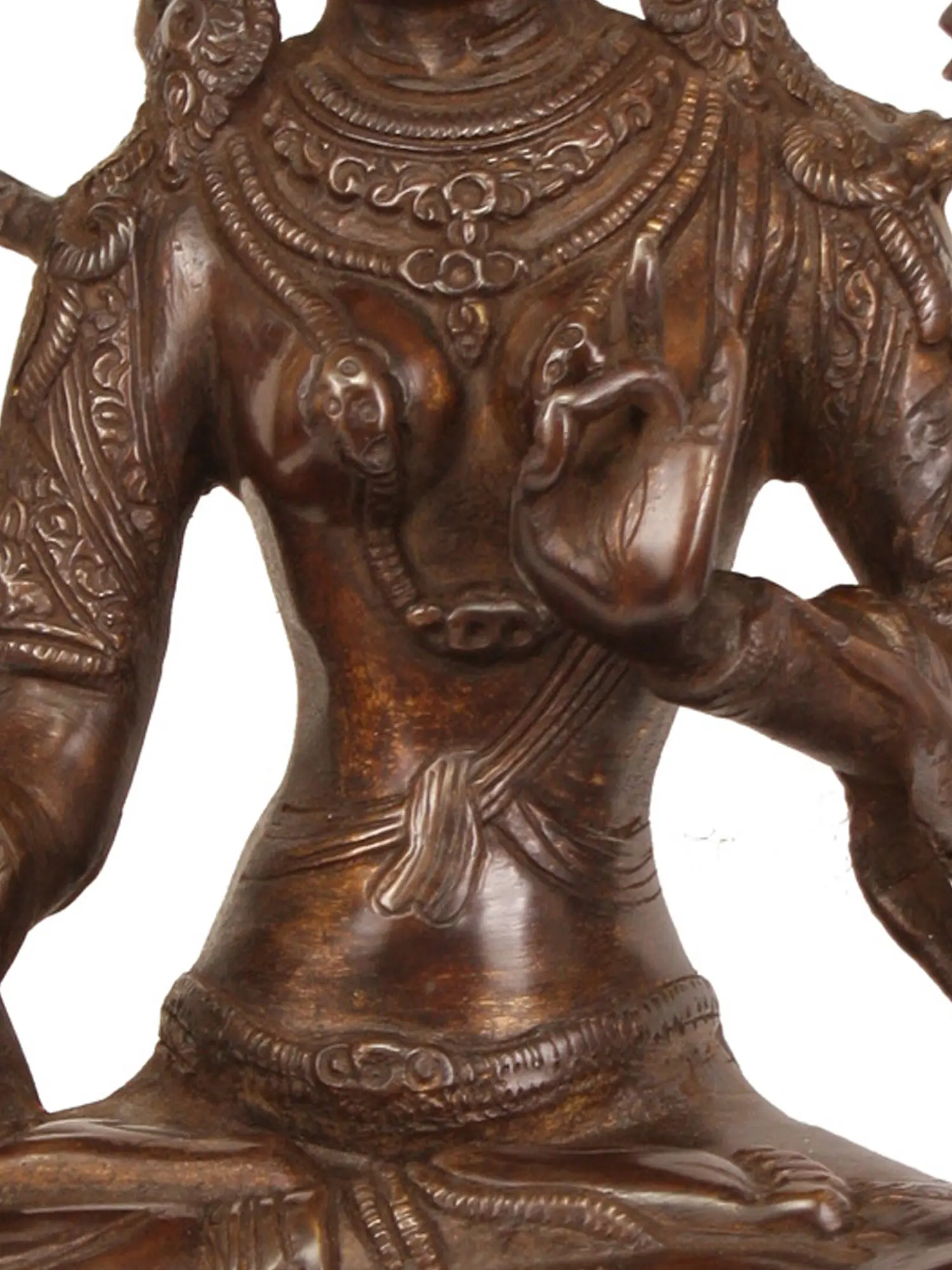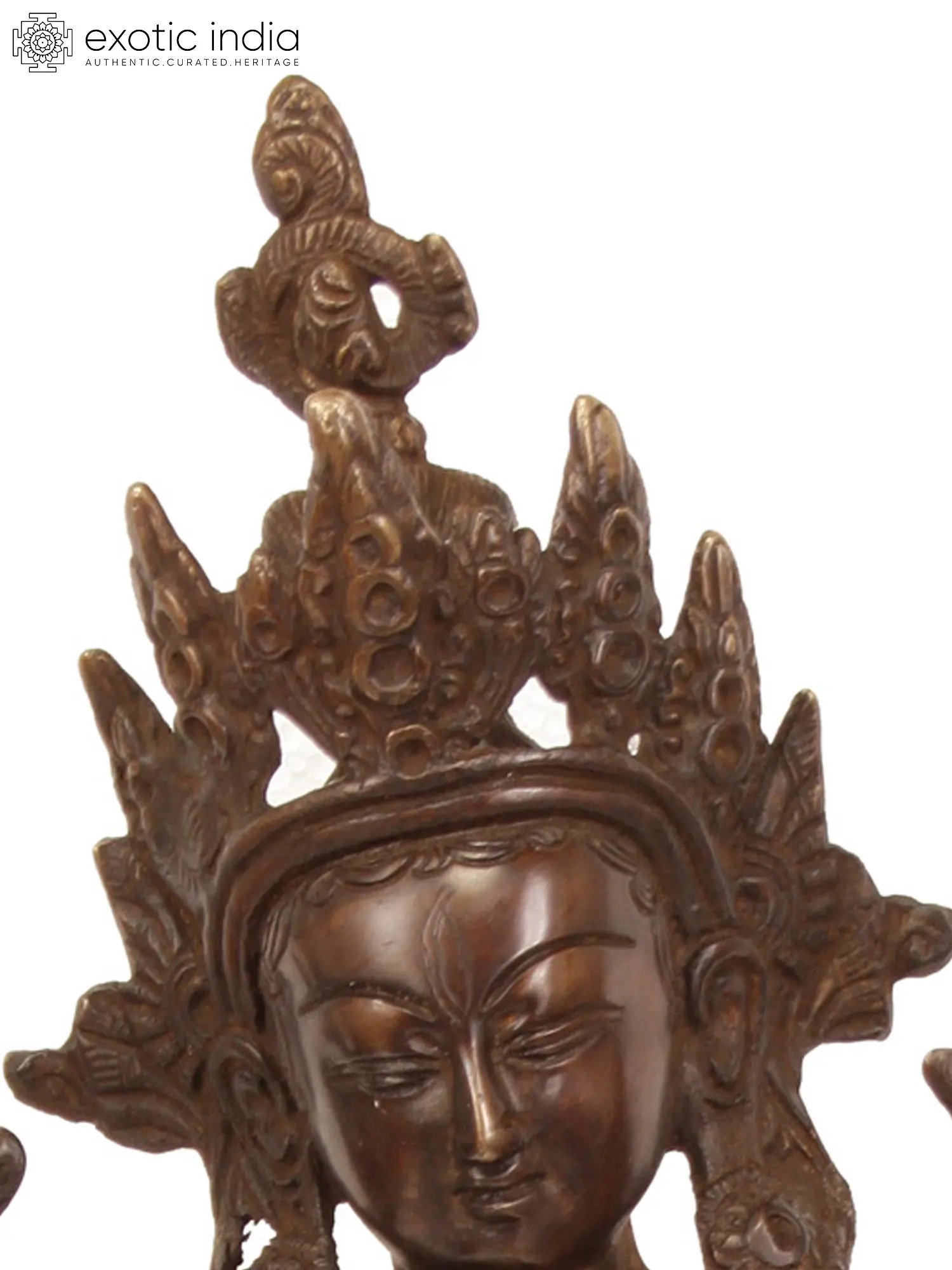 This exquisite brass statue depicts White Tara, a revered goddess in Tibetan Buddhism, known as the "Mother of Liberation" and the embodiment of compassionate action. Her serene countenance and graceful posture radiate an aura of peace and tranquility, inviting devotees to seek solace and blessings. The intricate craftsmanship, a testament to the artisanal heritage of India, brings this divine figure to life, capturing every delicate nuance of her form and symbolism.
