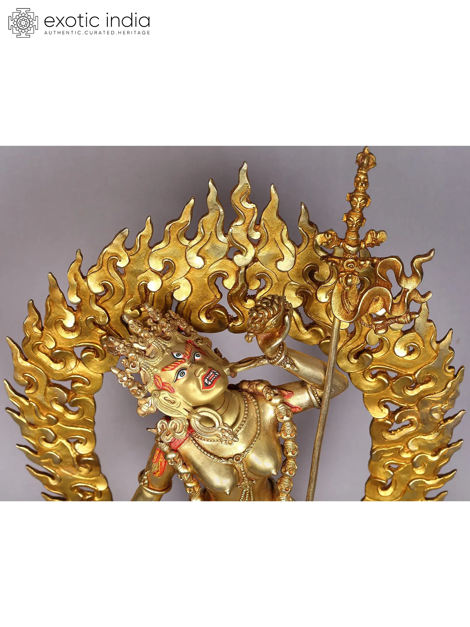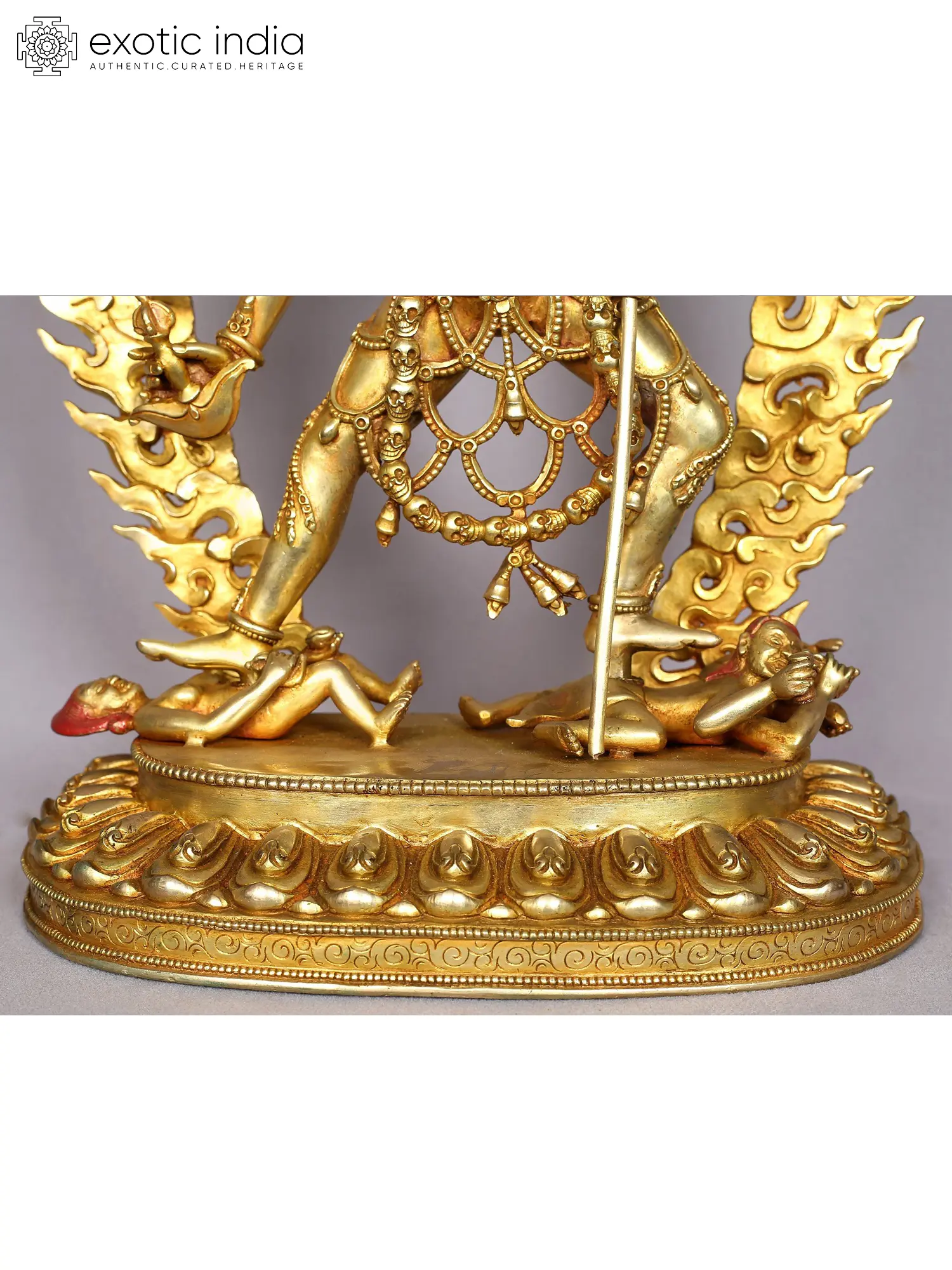 In her right hand, she holds a curved knife, while her left-hand cradles a white skull cup placed at her heart. Additionally, an upright khatvanga staff is positioned at the bend of her left elbow. Her attire is adorned with a tiara featuring five white skulls, green ribbons, and gold and jewel earrings. She wears a garland made of fifty freshly severed heads, another garland of flowers, a necklace of bones, and various bracelets and anklets. Draped around her shoulders is a long green scarf. These intricate details and symbols are all part of her powerful and symbolic representation in Tantric Buddhism.