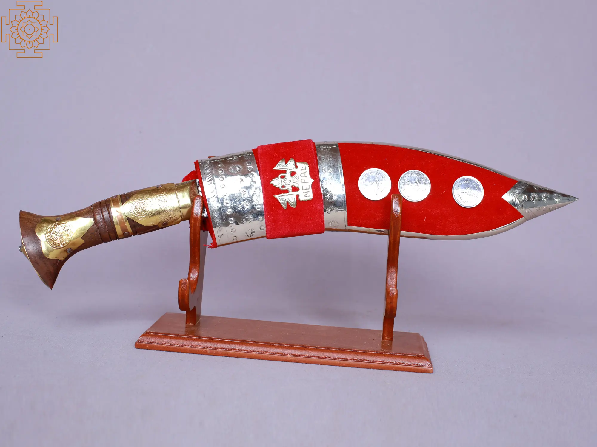 This exquisite Khukuri is meticulously crafted from high-quality iron, boasting a blade etched with delicate floral patterns, a testament to the skill and artistry of the Nepalese blacksmiths. The handle, fashioned from richly hued wood, is further enhanced with brass accents, lending an air of regal elegance. The sheath, a vibrant red velvet, is encased in hammered brass, its surface adorned with traditional Nepalese motifs and authentic Nepali coins, enhancing the heirloom quality of this exceptional piece. The combination of iron, wood, and leather creates a harmonious blend of strength, beauty, and practicality. The meticulous detail speaks volumes about the dedication and passion poured into its creation. This Khukuri is more than just a functional tool; it's a work of art.