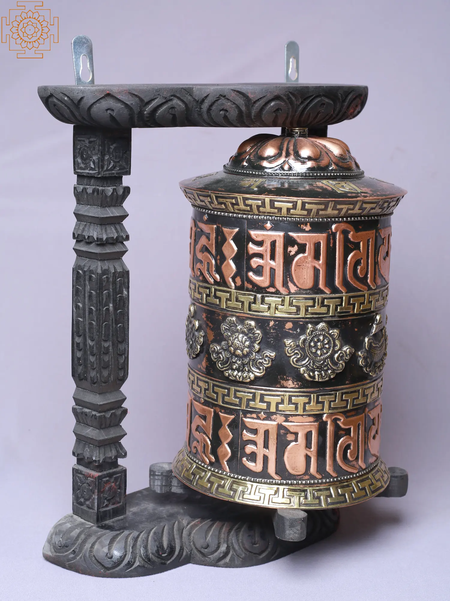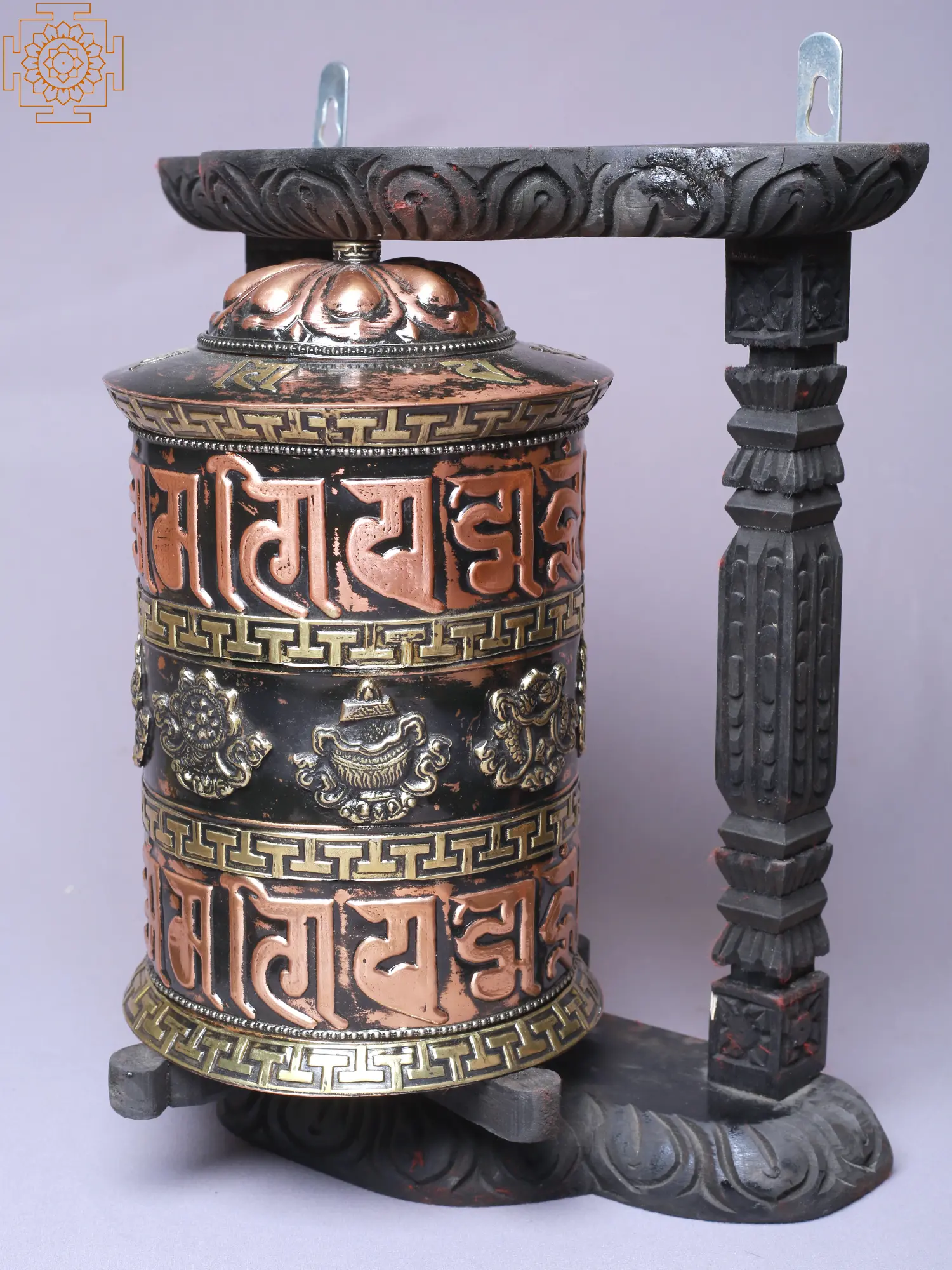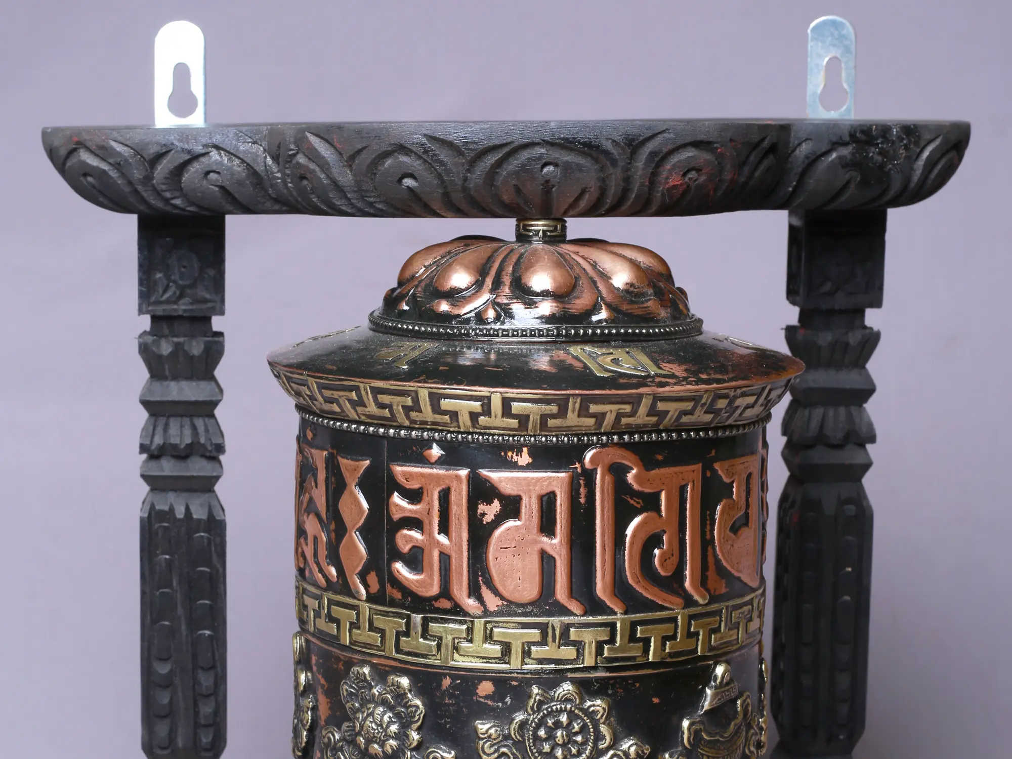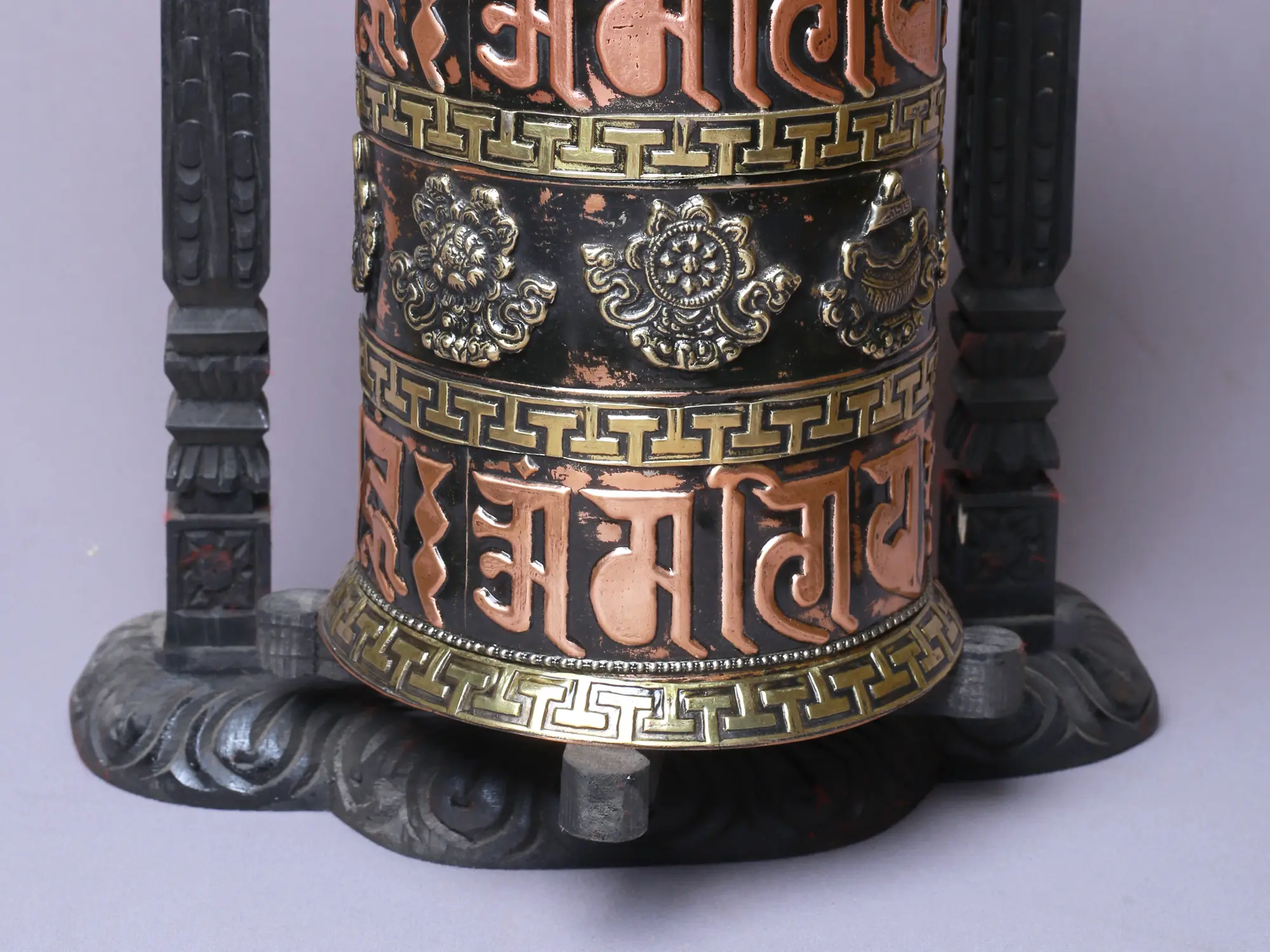 This prayer wheel embodies the rich artistic legacy of Nepal, a country renowned for its skilled artisans and deeply spiritual heritage. The intricate carvings on the wooden base and the precisely etched copper cylinder showcase the dedication and expertise passed down through generations. Every detail of this prayer wheel is carefully considered and beautifully executed, making it not only a functional item but also a piece of art reflecting the cultural identity and rich artistic heritage of Nepal. By acquiring this prayer wheel, you support Nepali artisans and perpetuate the tradition of creating such meaningful pieces of spiritual art. The subtle variations in craftsmanship are a testament to the uniquely human touch of the artisans.