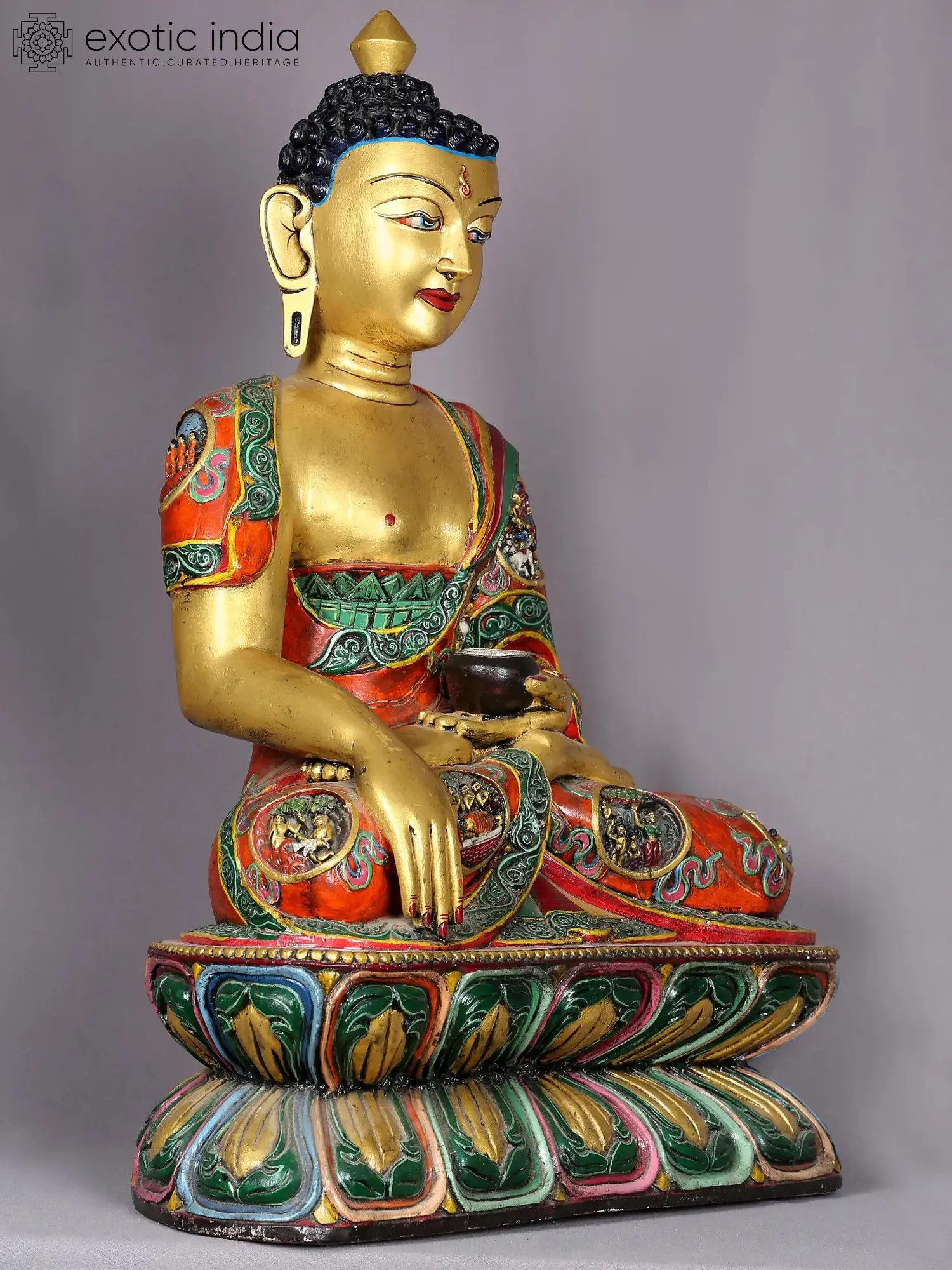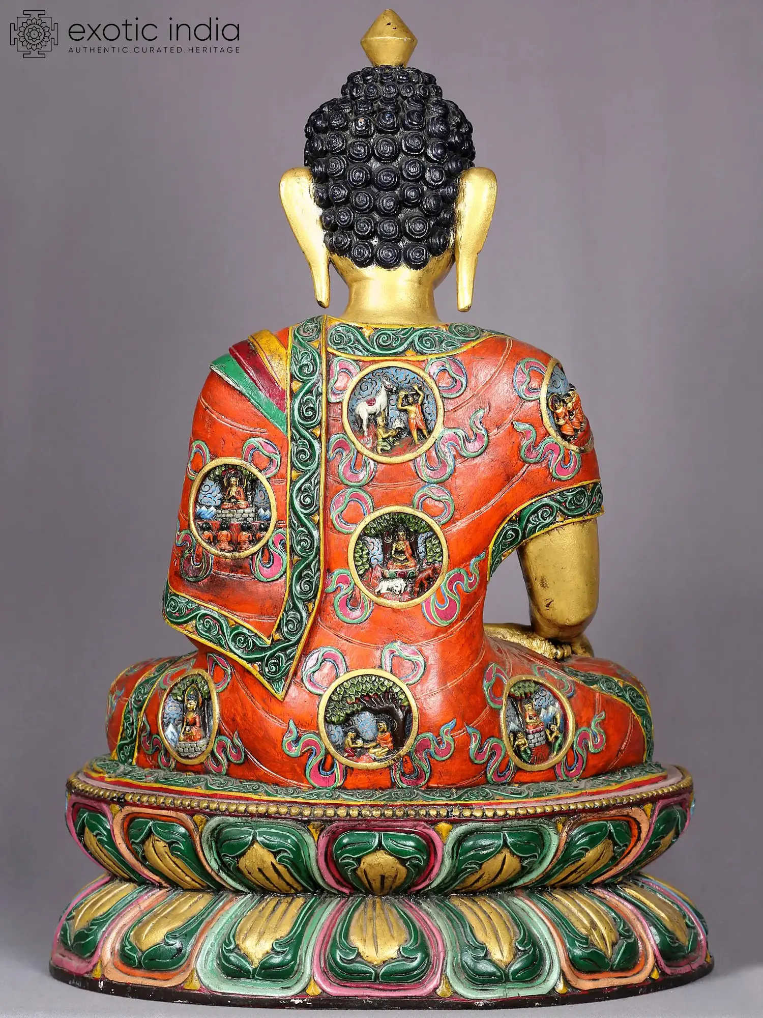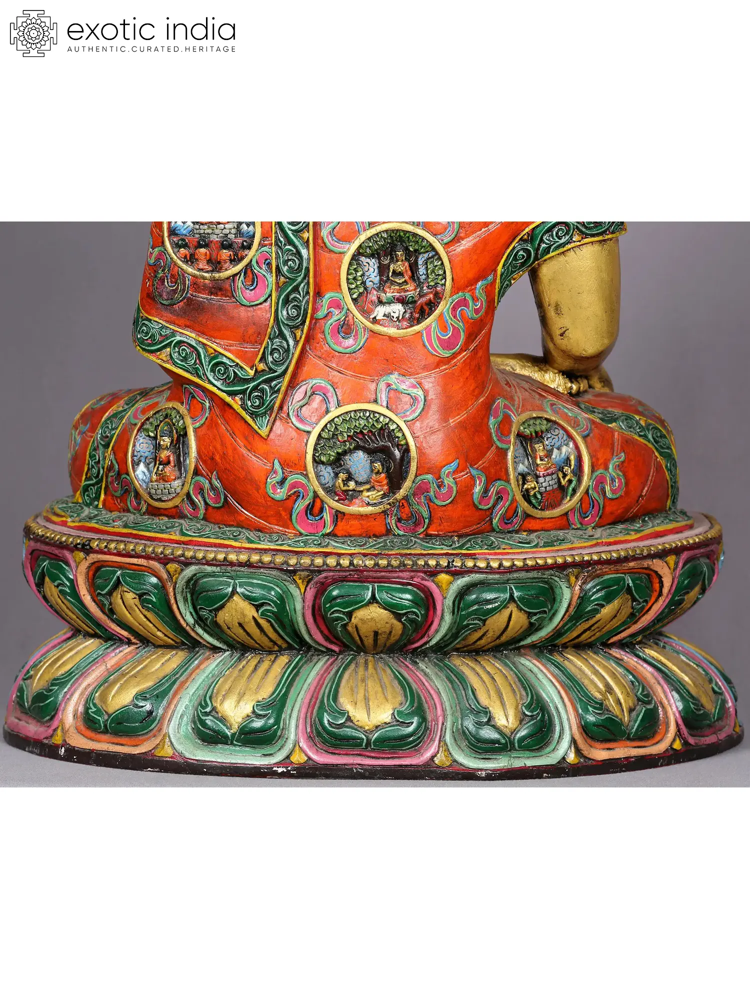 A unique and artistic representation of Tathagata and his glorious life, this wooden statue from Nepal depicts Buddha seated on a colorful lotus throne, with a magnificent carving of his life story in circular frames on the bright orange robe that enwraps him. Each composition on the robe has received ample attention, and every episode such as Buddha’s birth, Great Departure Dhammachakrapravartana and Mahaparinirvana are identifiable to anyone who is familiar with the life story of the Enlightened One.