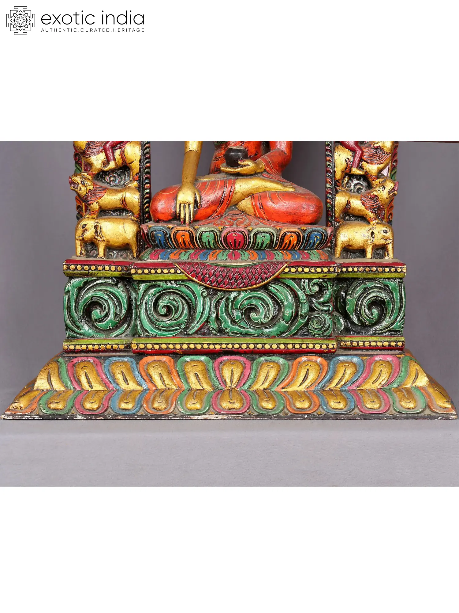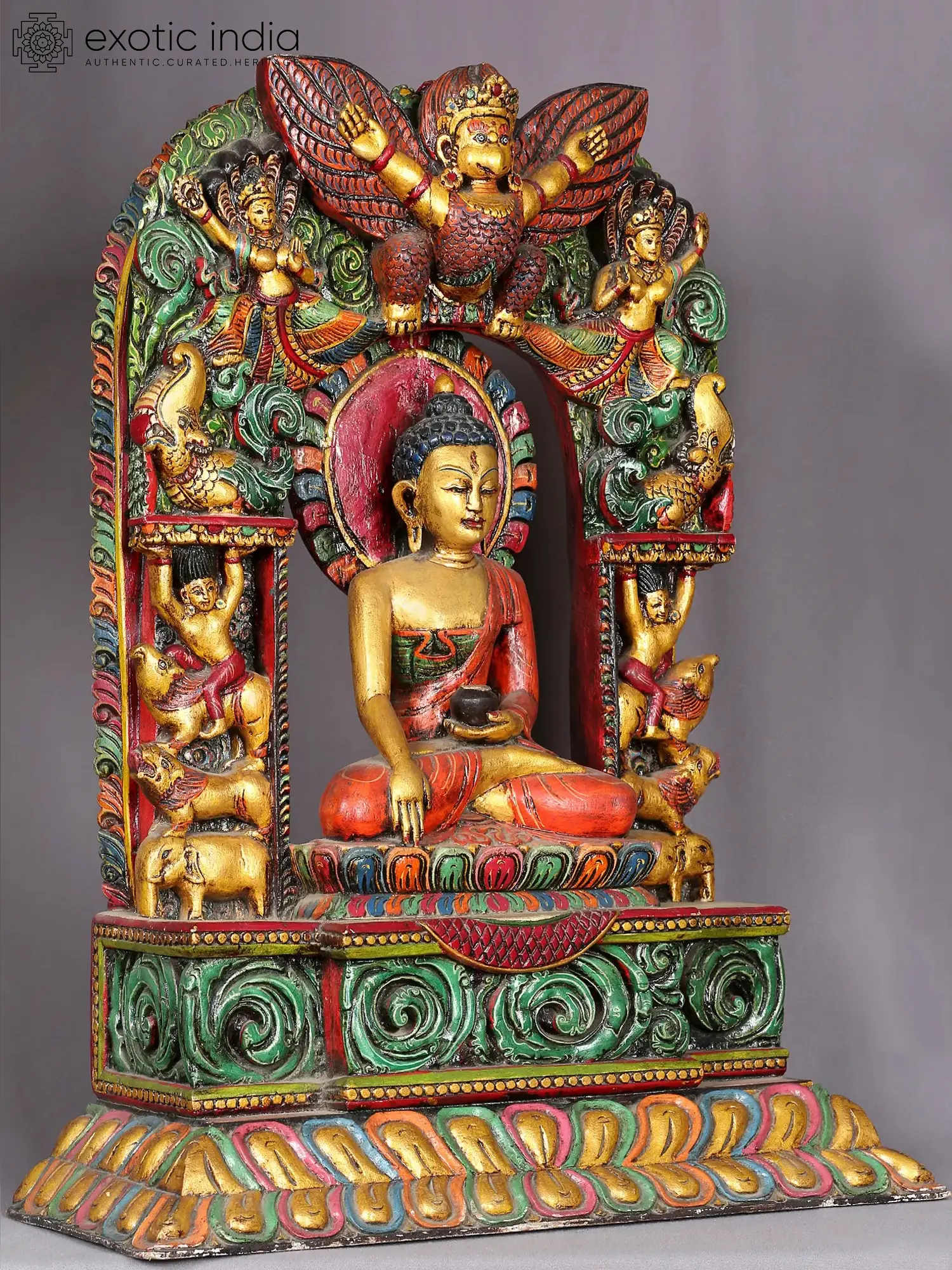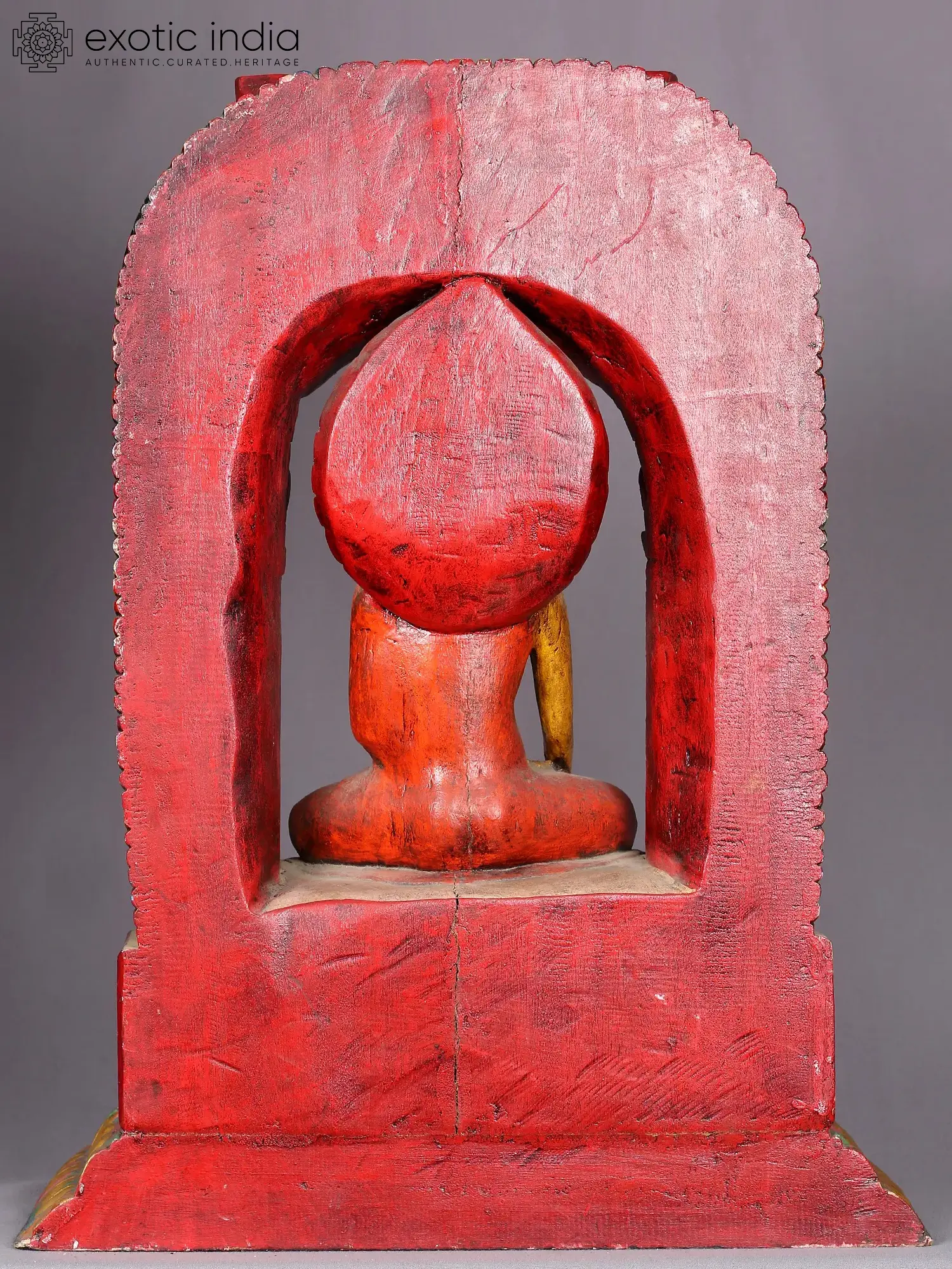 Shakyamuni Buddha's distinguishing physical attributes aid in his recognition. He rests in the meditative Padmasana, his spine straight and poised. Draped in a modest monk's robe, it drapes his left side and arm while baring his right.