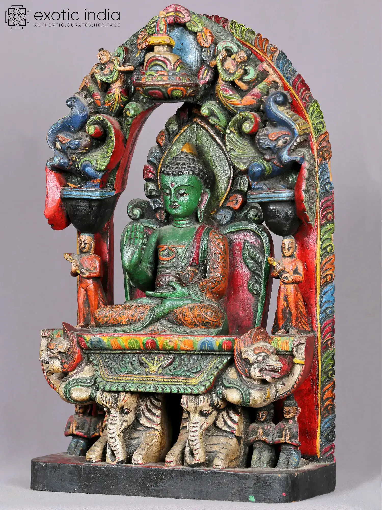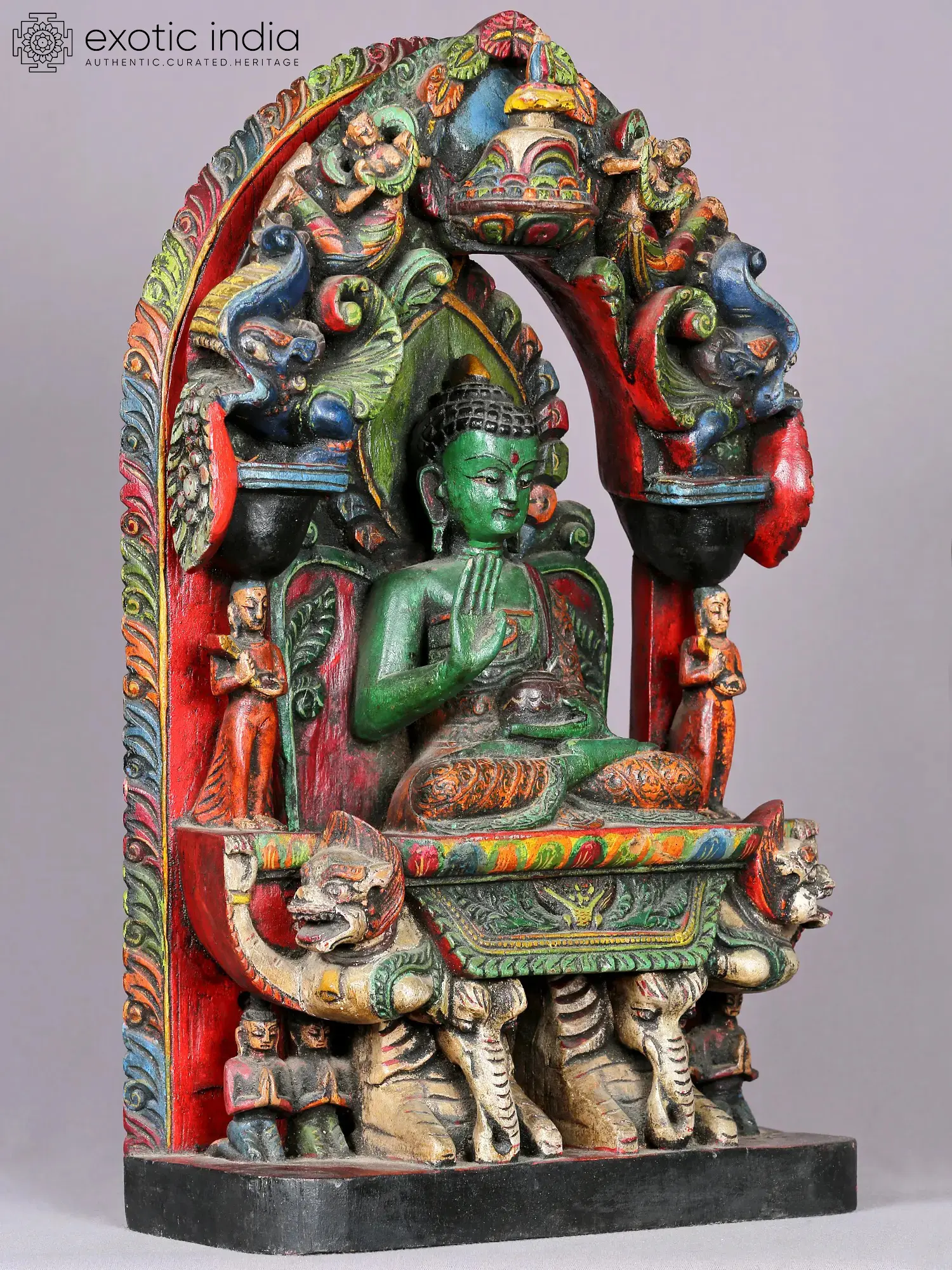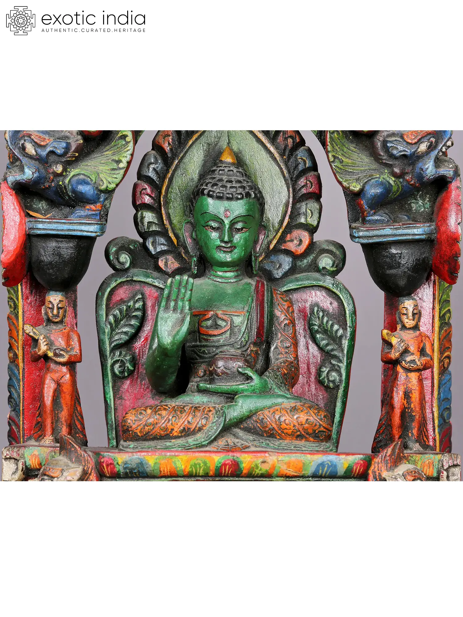Buddha Shakyamuni, the enlightened being of our fortunate era, embodies the culmination of inner realization, transcending limitations, and cultivating virtues. The Shakyamuni Buddha Statue captures his essence in the meditative Padmasana pose, legs elegantly crossed, and the intricately carved monastic robe adorned with auspicious symbols and floral motifs.
