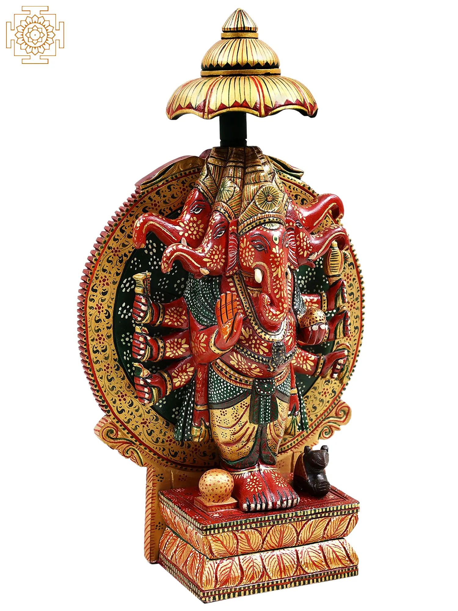 14" Wooden Panchamukhi Ganesha Standing on Throne