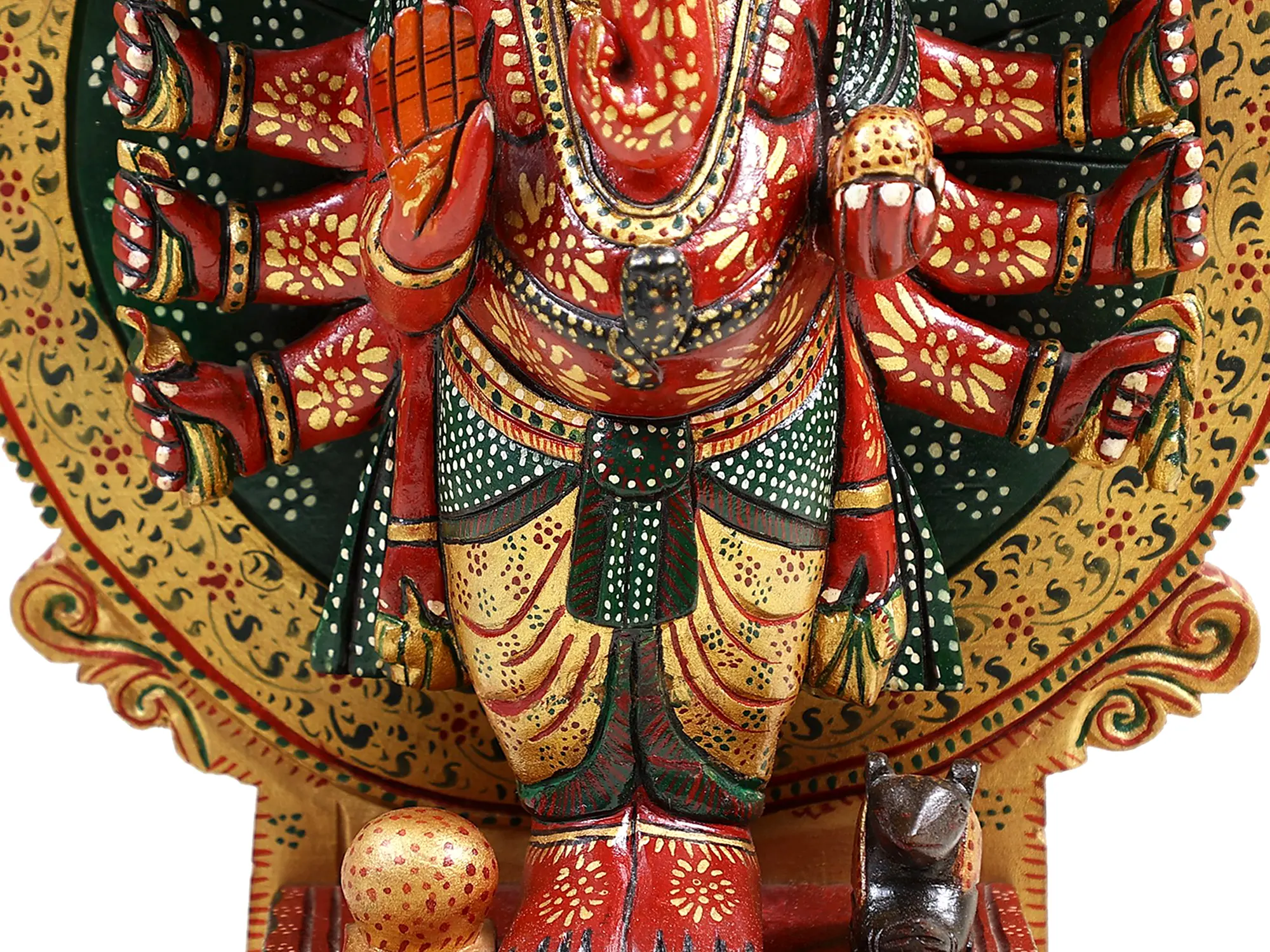 Invite the remover of obstacles and the bestower of wisdom into your home with this magnificent Panchamukhi Ganesha statue. Crafted from wood and standing upon an ornate throne, this piece is more than just a decorative item; it is a conduit for divine blessings and a testament to rich cultural heritage. The deity is depicted in his form with five faces, symbolizing his omnipresence and his ability to perceive all directions and aspects of existence. Each face offers a unique perspective, representing his multifaceted divine nature – the watchful eye, the compassionate gaze, the stern disapproval of negativity, and the serene wisdom.