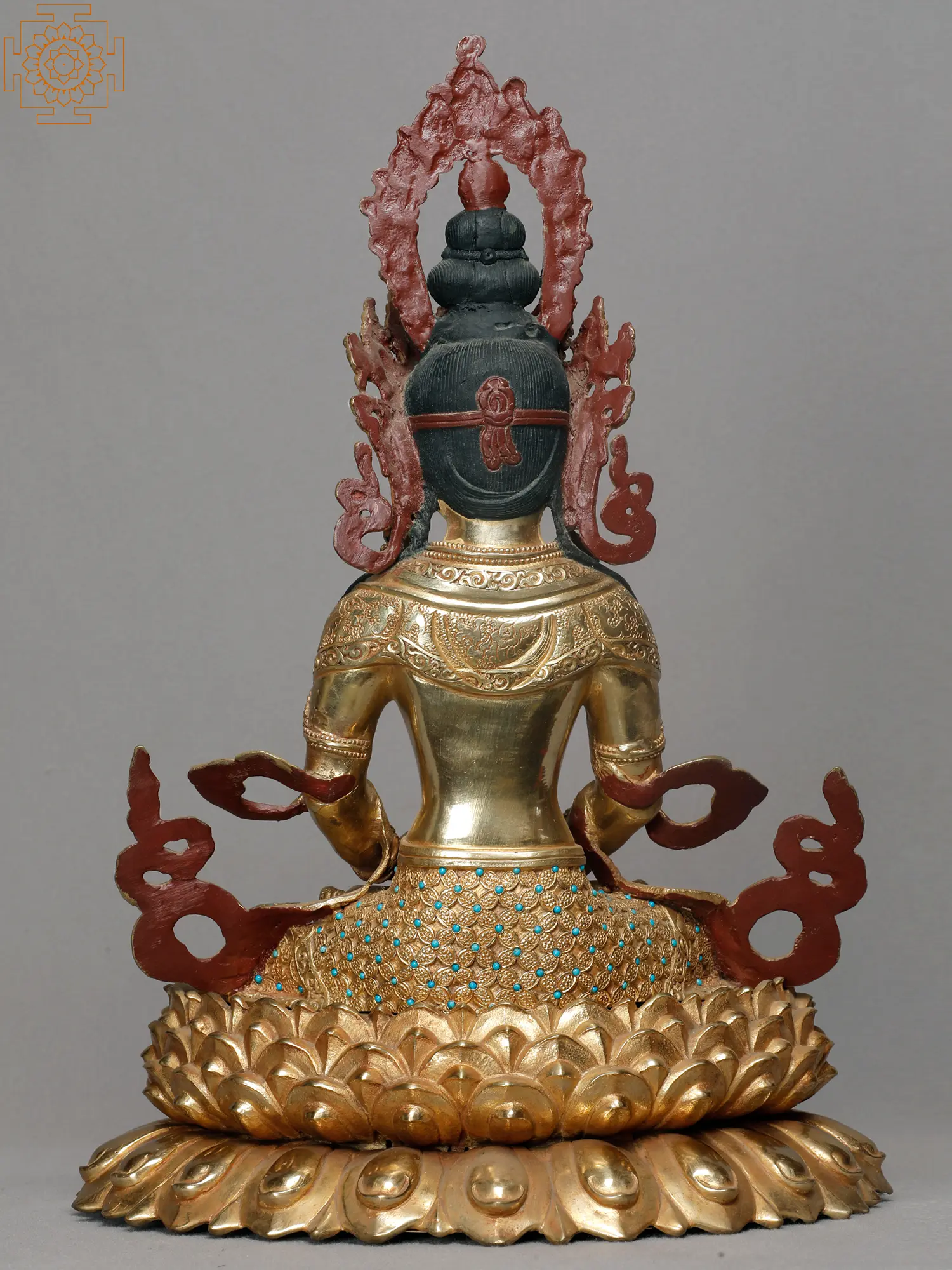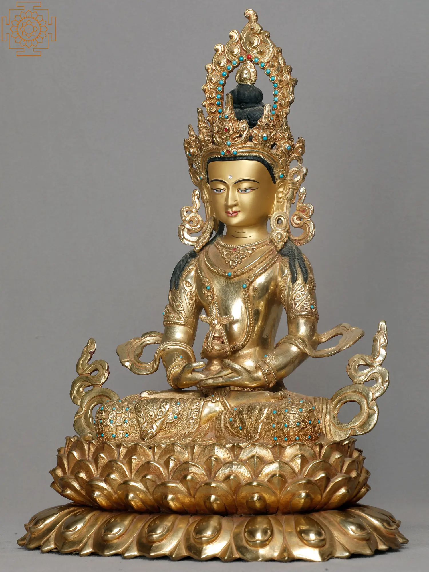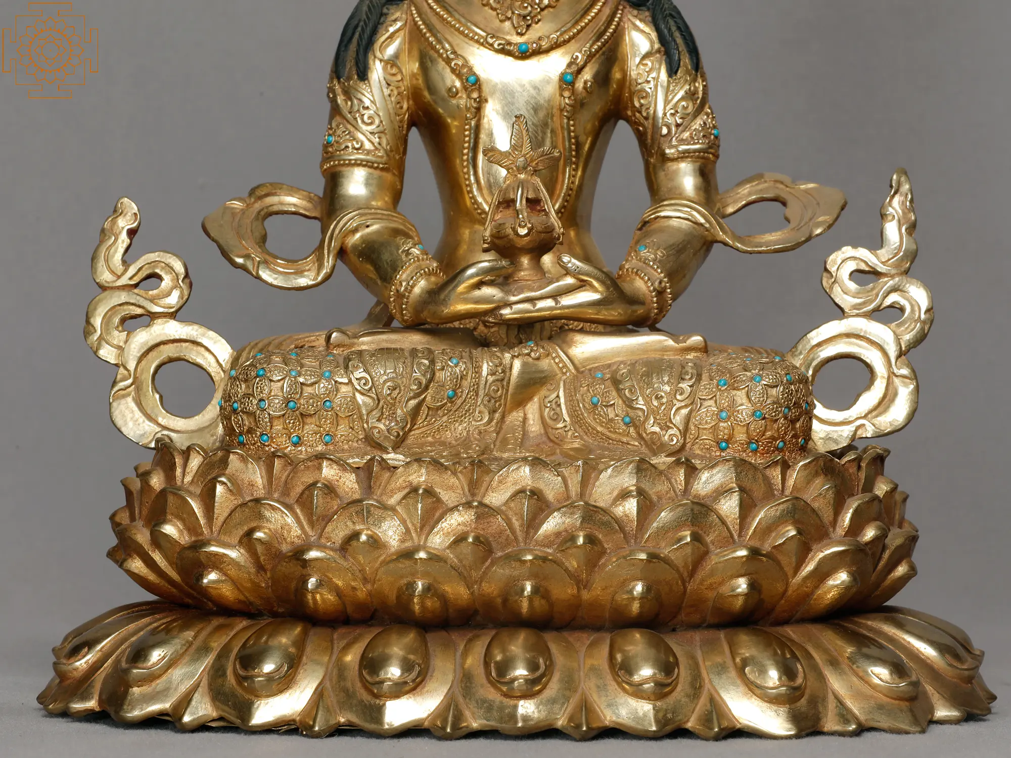 Amitayus a celestial being, also known as Amitabha mainly, is highly revered in Mahayana Buddhism, particularly within the Pure Land school. The name Amitayus translates to “infinite life,” symbolizing his embodiment of eternal existence and boundless compassion. Amitayus is depicted in his serene meditative posture, signifying his association with the bestowal of the long and purposeful life of devotees. The devotion to Amitayus is closely linked to Pure land teachings, where practitioners aspire to be reborn in Sukhavati, the blissful western pure land presided over by Amitayus.
