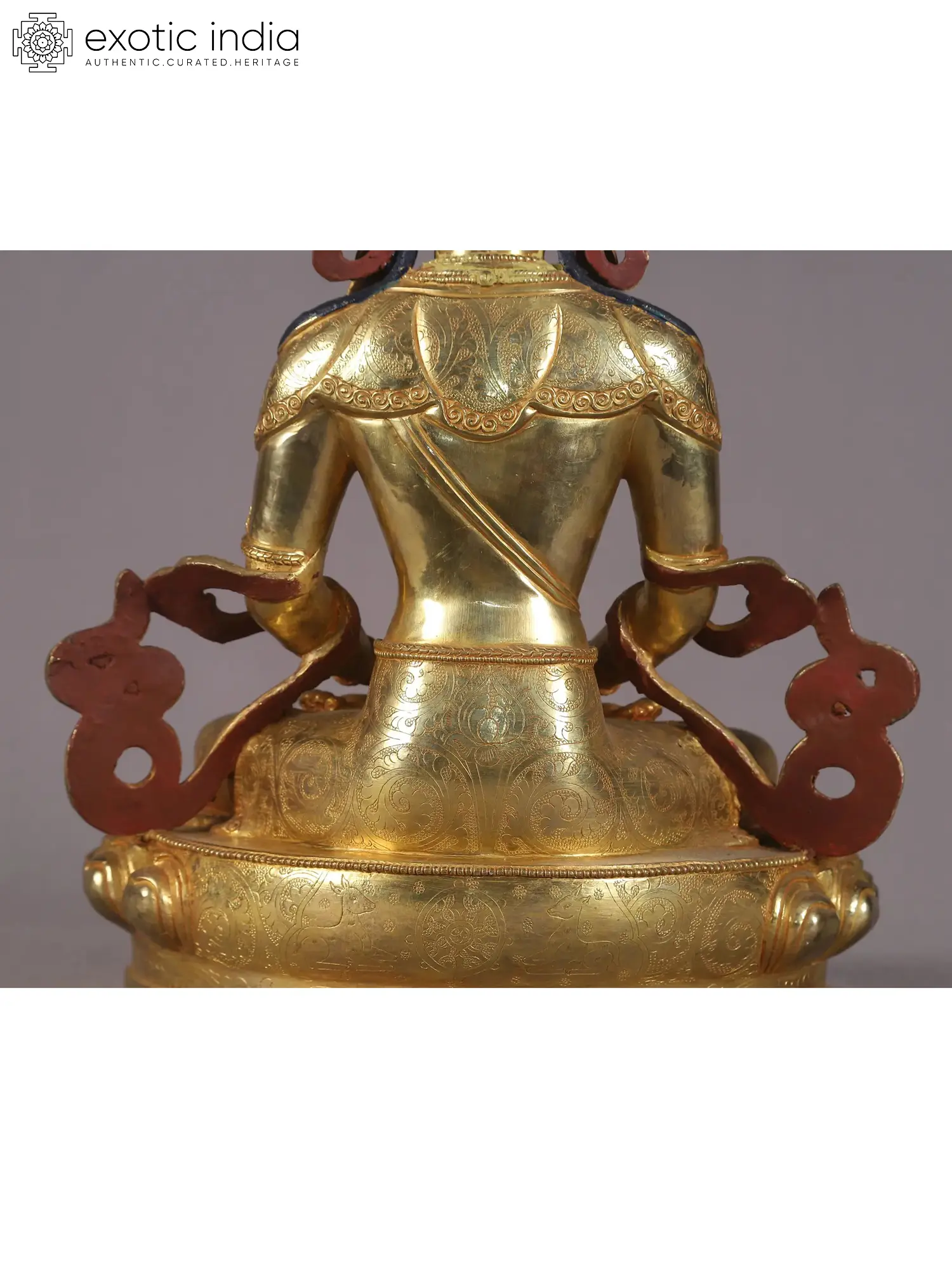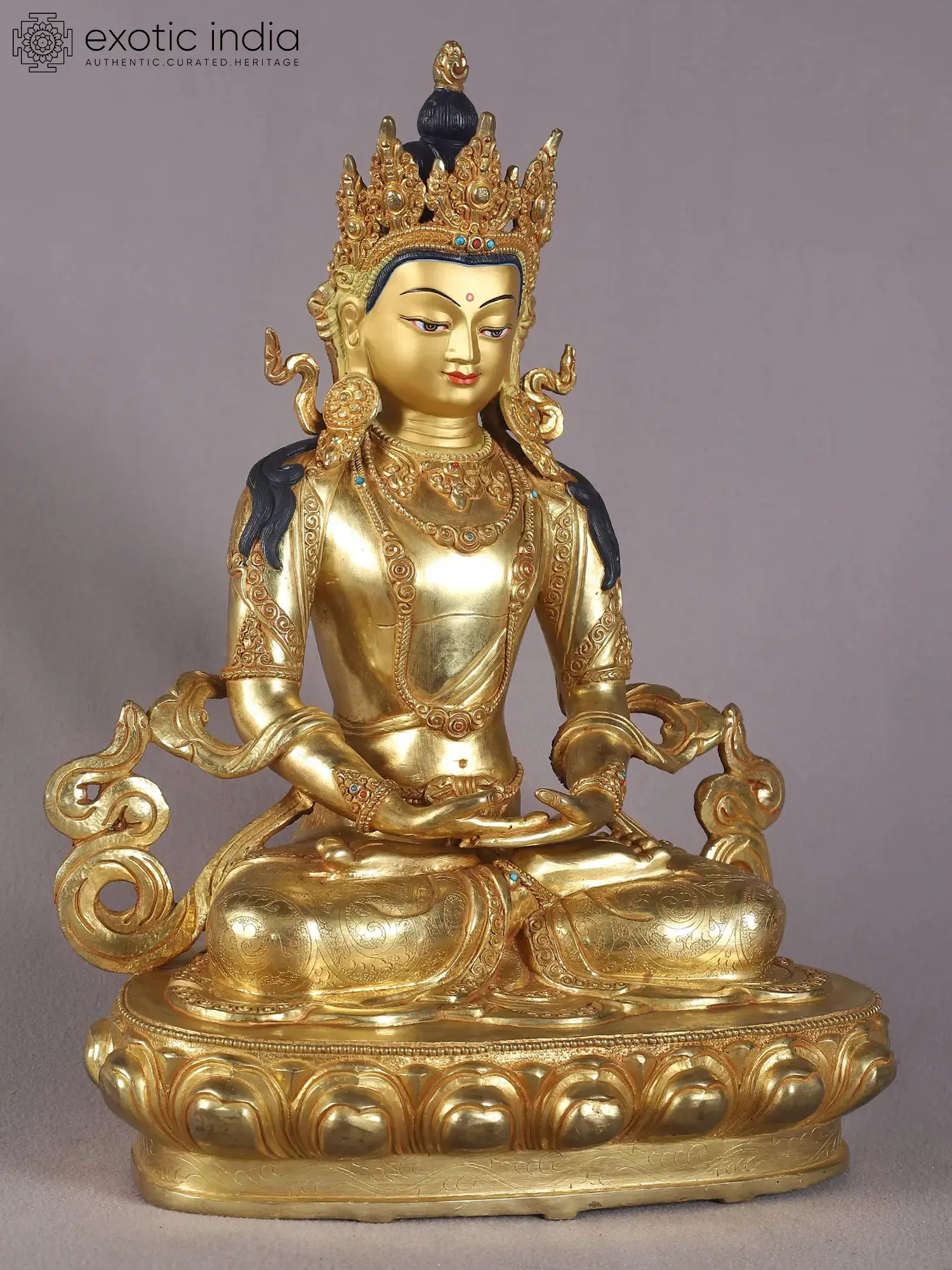 Lord Aparmita is revered as the Buddha of Infinite Light and Infinite Life, and he personifies kindness, purification, and enlightenment. In this unique representation, Aparmita is seated gracefully in the padmasana on a lotus pedestal with his right leg on top of his left. His hands are resting on his lap in the dhyana mudra (meditative gesture), symbolising the supremacy of the enlightened mind. Adorned in regal attire, he is dressed with heavy necklaces, anklets, bracelets, earrings, and a five-pointed crown inlaid with precious and semi-precious stones. Aparmita is referred to during rituals involving the prolongation of life as the giver of longevity. It is said that by chanting the sacred mantra of Buddha (“Om ami dewa hrih”) will shield you from obstacles and dangers.