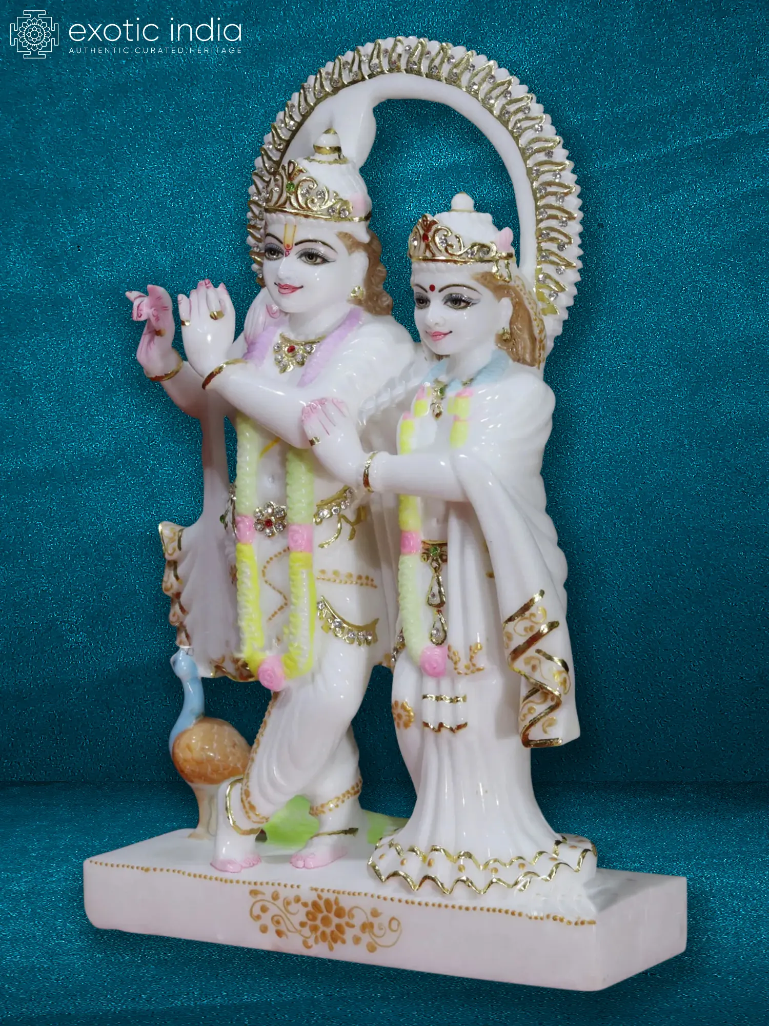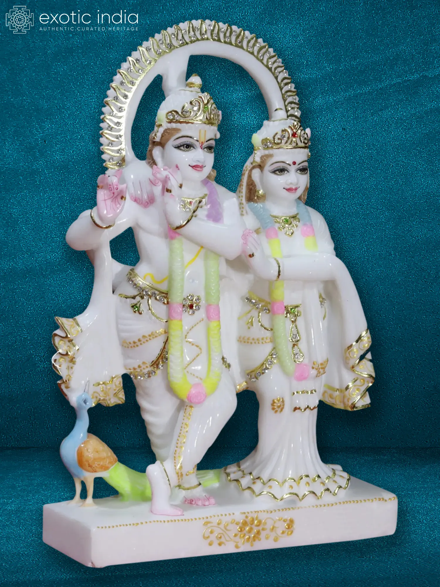 The statue showcases meticulous craftsmanship. Lord Krishna stands with his characteristic charm, one hand raised in a gesture of blessing or perhaps poised to play his divine flute. Radha stands beside him, her gaze gentle and adoring, their hands subtly intertwined, signifying their deep connection. The figures are adorned with delicate floral garlands, sparkling embellishments, and intricate golden work that highlights the flowing robes and ornate crowns. The graceful curves and delicate features of the idols speak volumes about the skill and devotion of the artisan who brought this sacred scene to life. The presence of a vibrant peacock at Krishna's feet, a creature sacred to him and a symbol of beauty and grace, further enhances the divine aura of the ensemble.