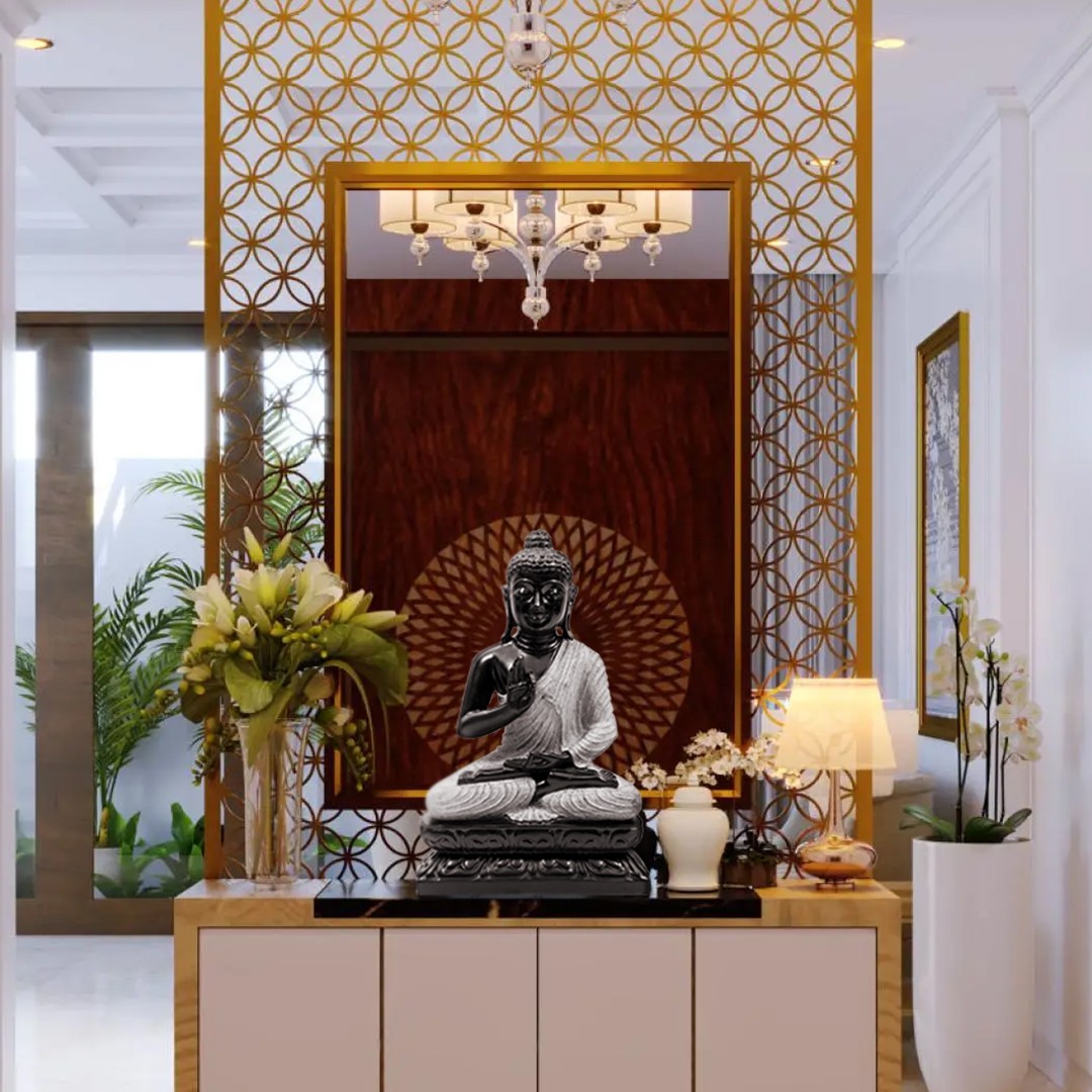 A one-of-a-kind bitone Buddha. Legs gathered in padmasana, hands in the dharmachakra mudra. While padmasana is the king of all asanas and the stepping stone to high-order yogic practices, the dharmachakra mudra stands for the cyclical nature of life and dharma. Both these elements are integral to the presence of the Buddha.