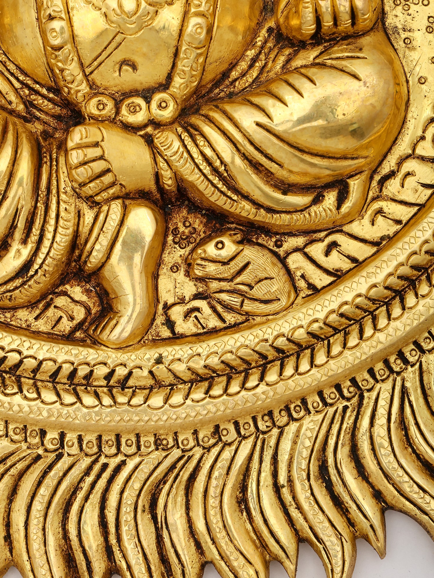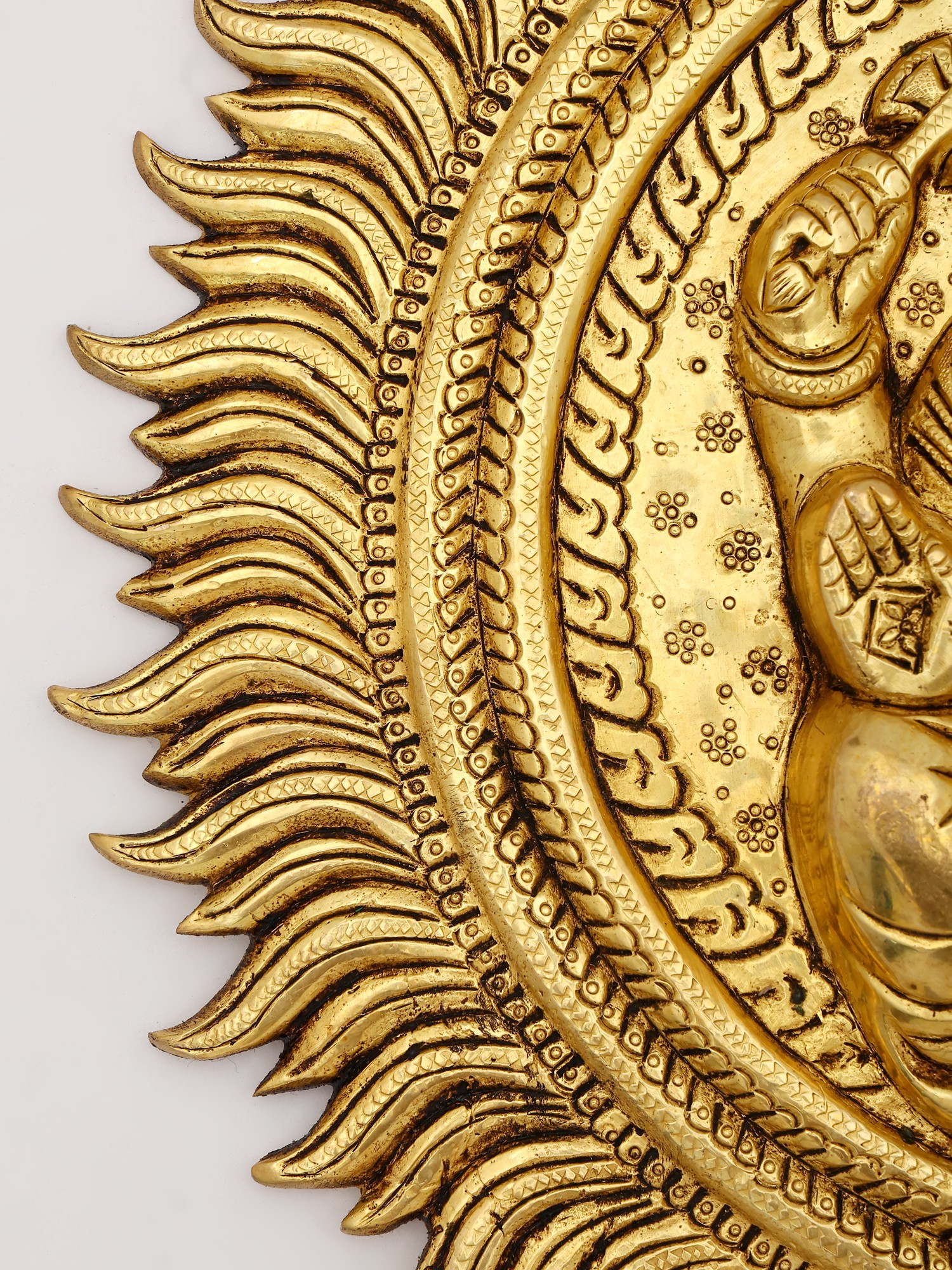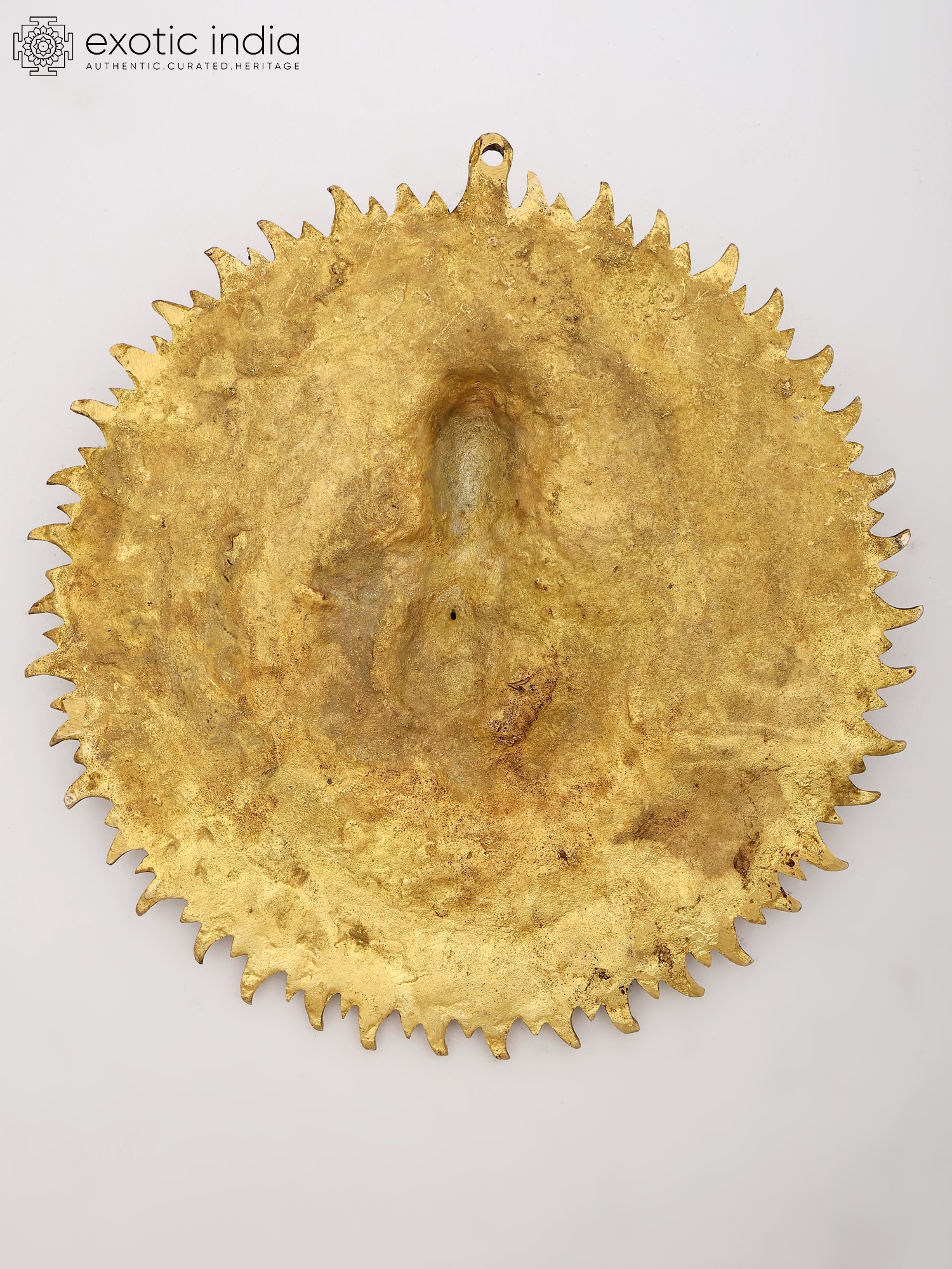 The central figure, depicted in a commanding yet benevolent pose, is encircled by a magnificent sunburst motif, each ray meticulously carved to convey a sense of dynamic energy. The deity's gentle smile and steady gaze are rendered with remarkable lifelikeness, while the subtle textures and deep patinas of the brass enhance its visual appeal. Its fifteen-inch diameter ensures it makes a statement without overwhelming your chosen setting, a testament to its balanced and harmonious design.
