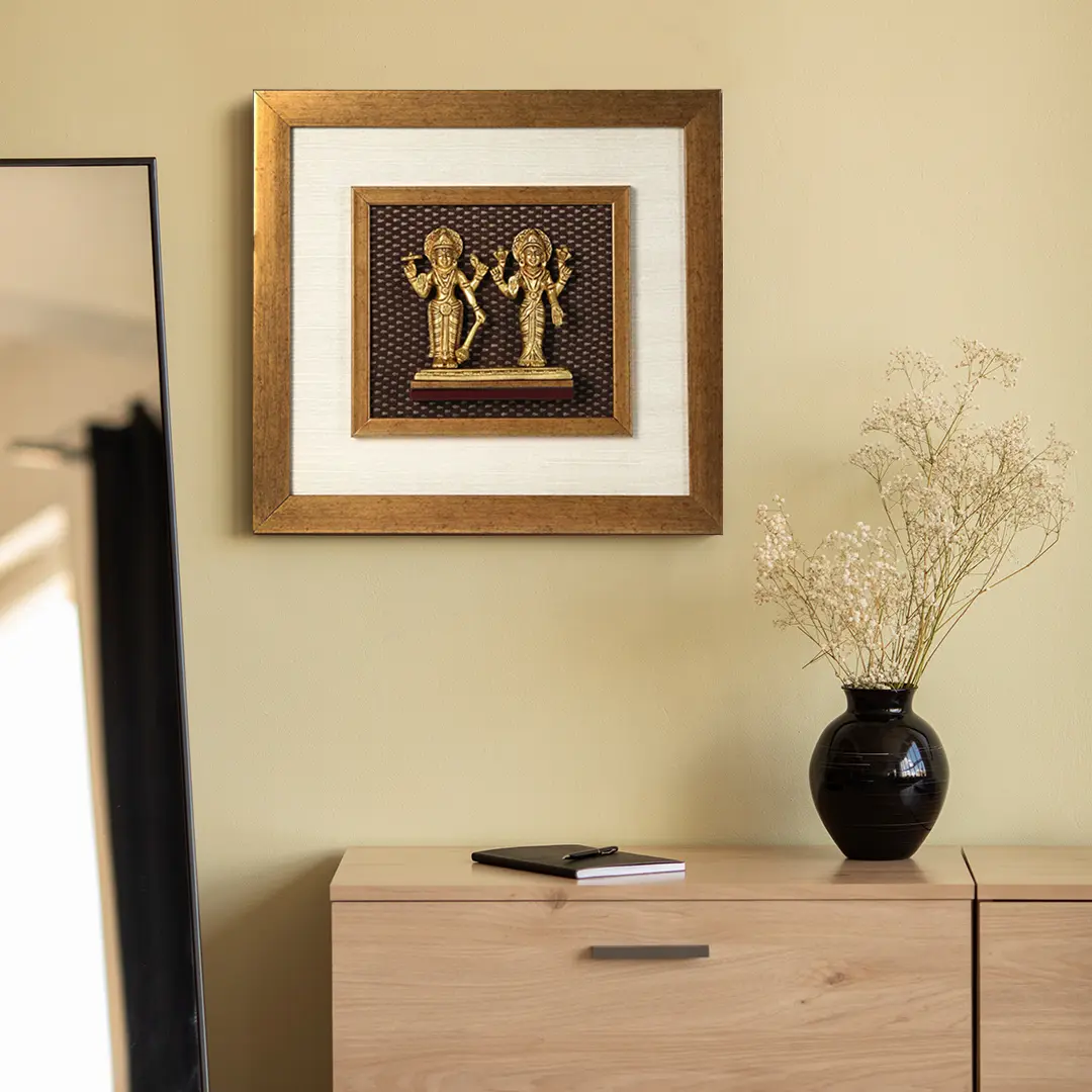 This Brass Lakshmi Narayana Idol in Wooden Framed exemplifies the allure of minimalistic elegance. The brass statue of Lakshmi Narayan, placed on a regal brown dotted fabric, radiates simplicity and grace. This masterpiece is elevated by a white plain cloth framed structure, highlighting a harmonious blend of brown, white, and wood tones.