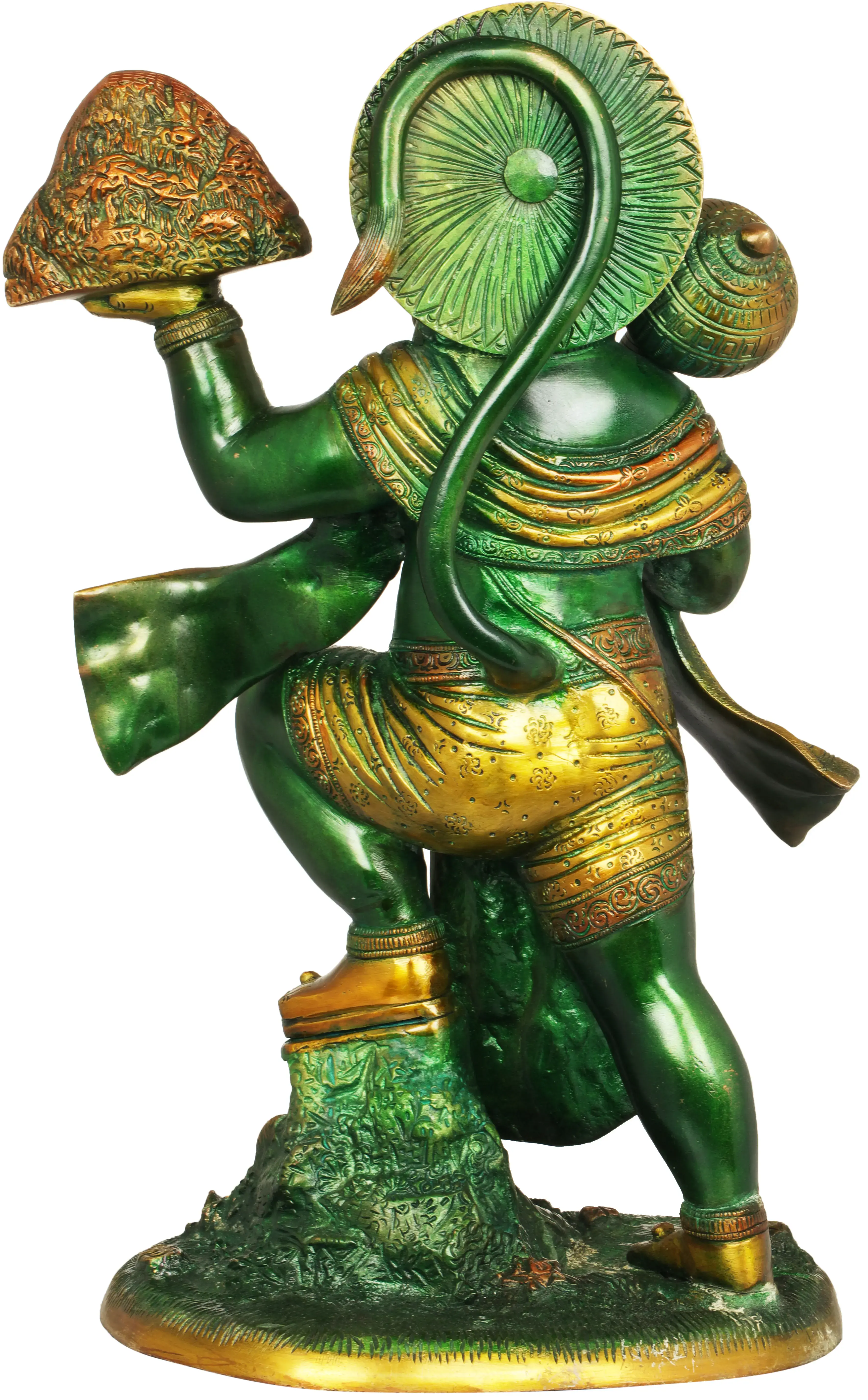 Enter the world of divine devotion and unwavering strength with this brass sculpture of Lord Hanuman carrying the sacred Sanjeevani Mountain. Handcrafted by skilled artisans in India, this idol captures the moment when Hanuman flew across the skies to retrieve the life-saving herb to save Lord Lakshmana. This depiction of Lord Hanuman's supreme devotion and selflessness is a symbol of courage and unwavering faith. As you place this sculpture in your home, you invite the blessings of Hanuman, fostering an atmosphere of bravery, protection, and faith in the face of adversity.