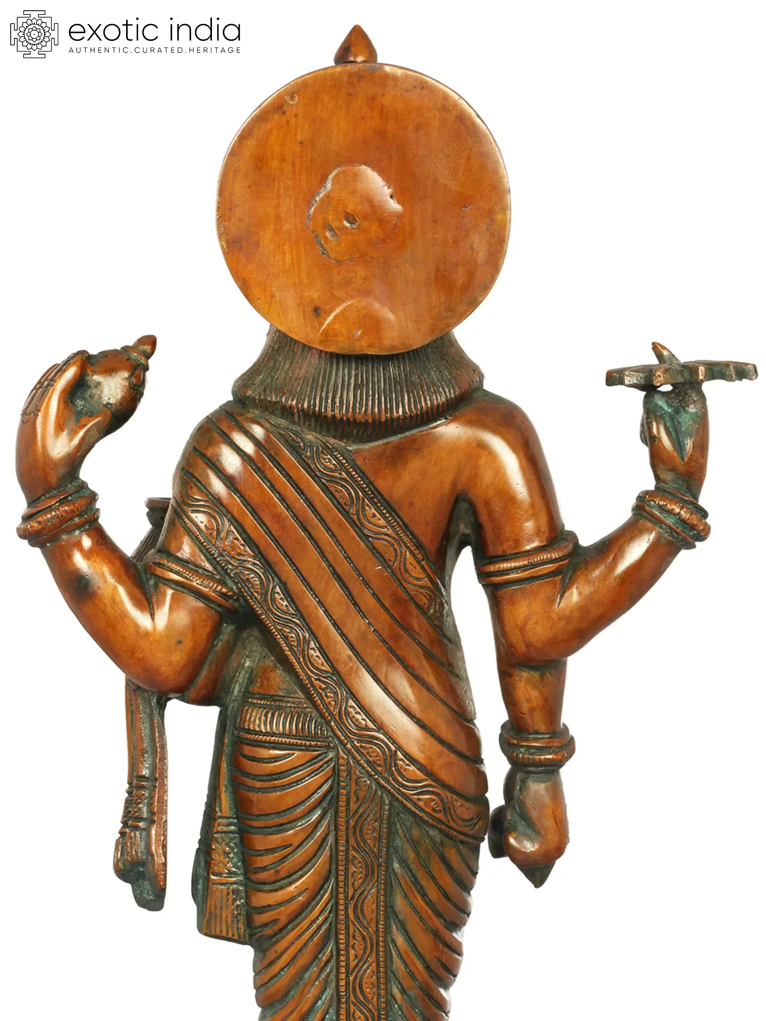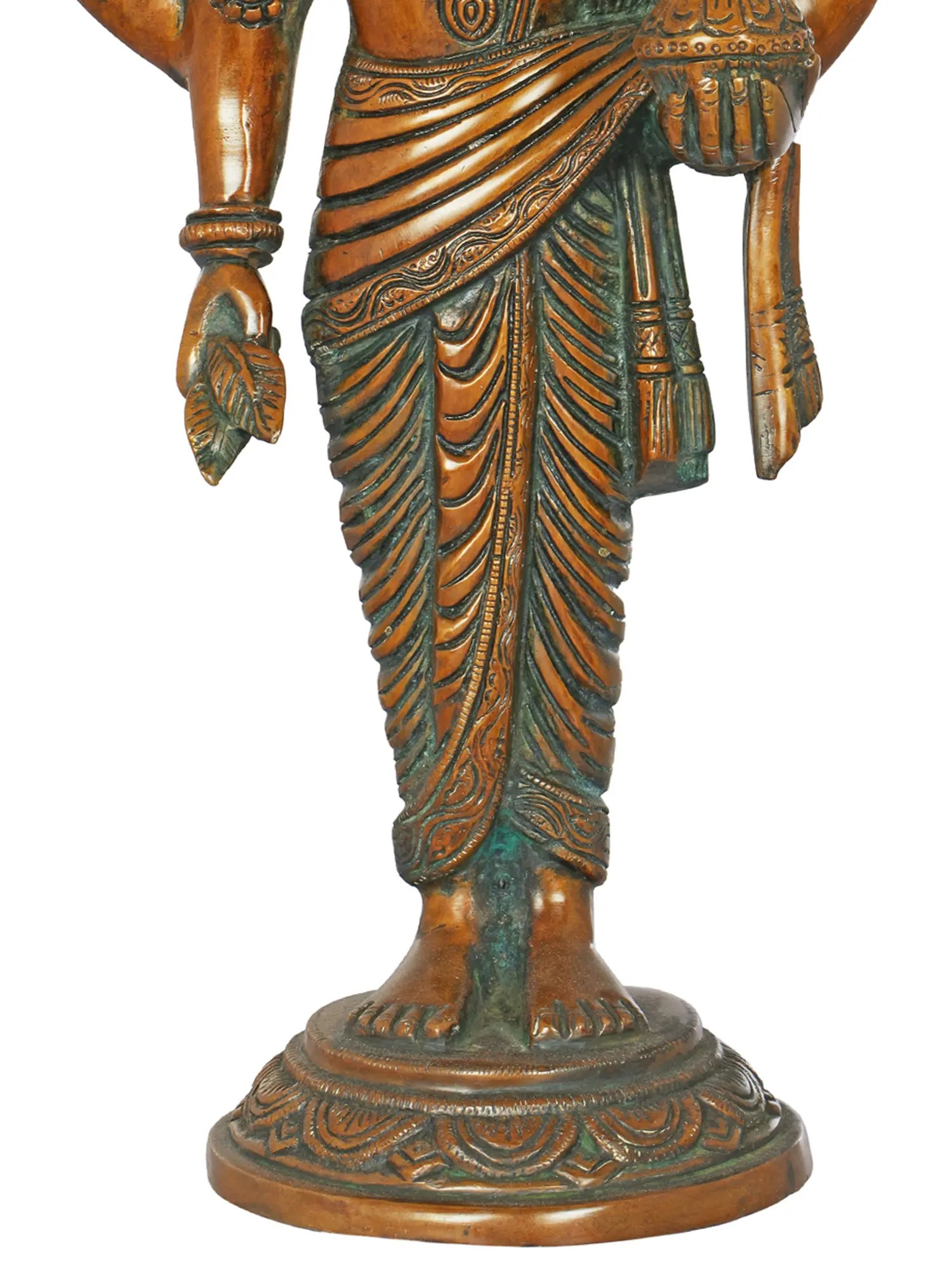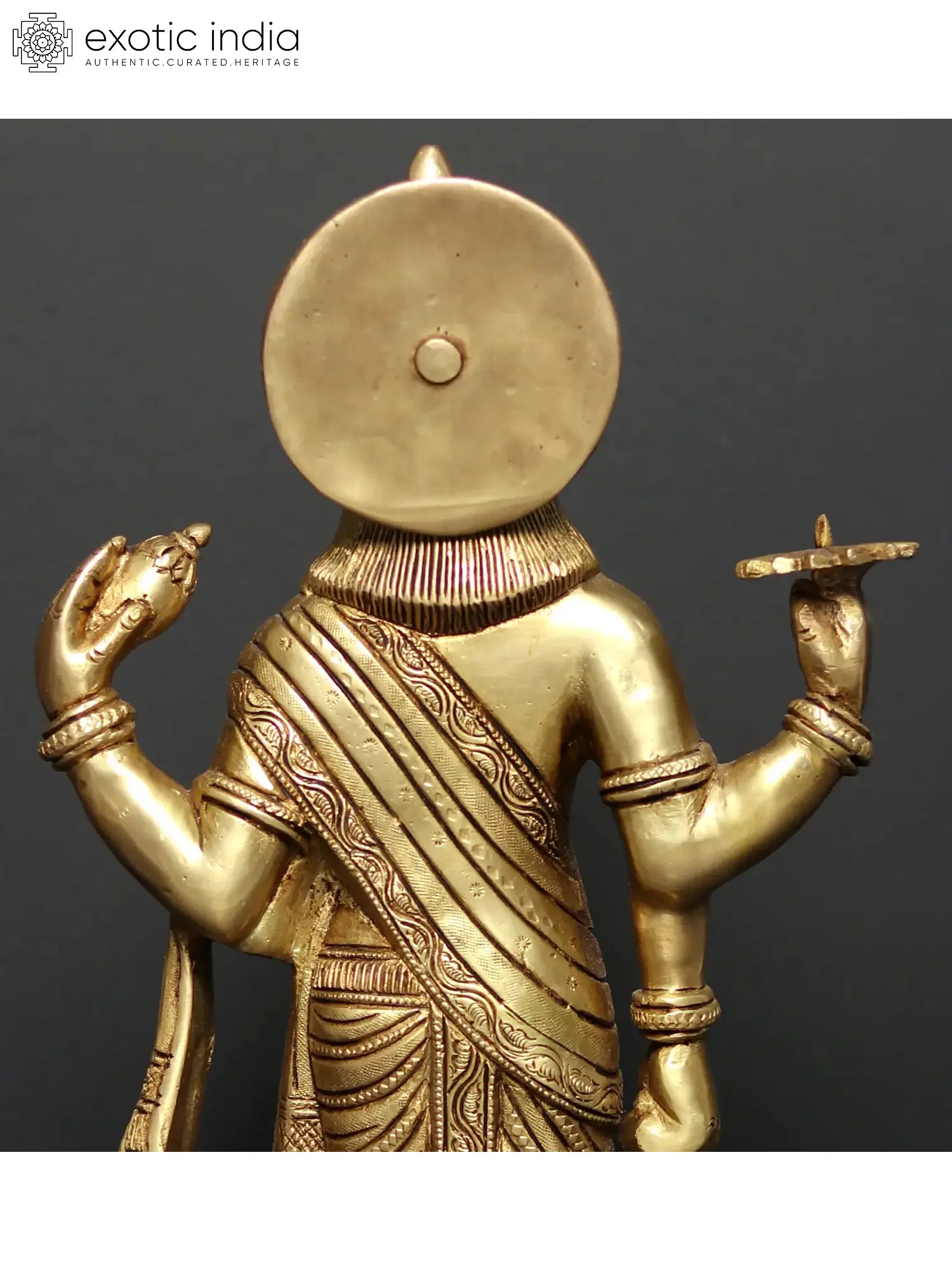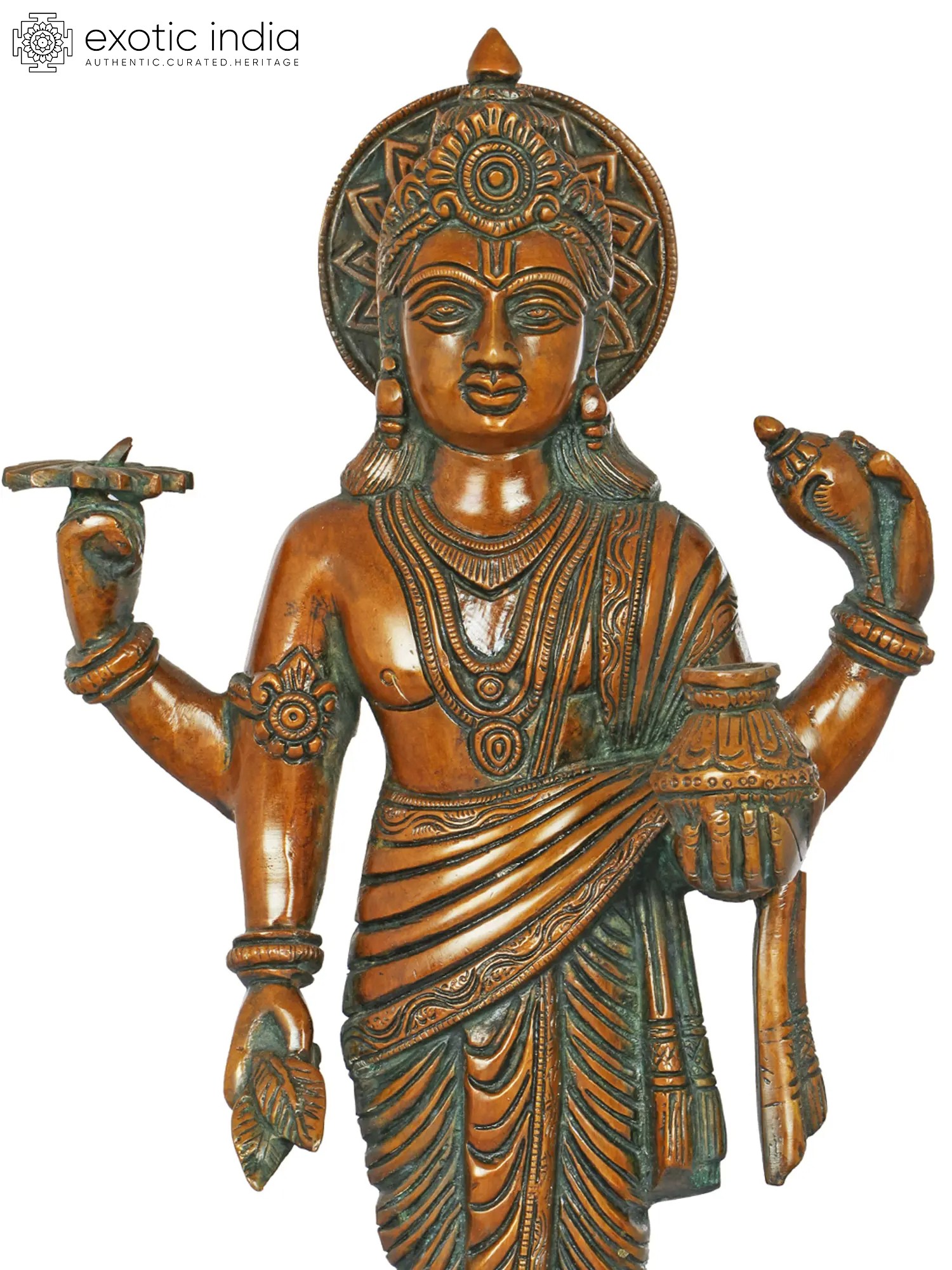 An incarnation of Adi Narayana - Dhanvantri is the physician of the heavens in the Hindu tradition. According to ancient legends, he is said to have emerged during the churning of the milk ocean (Samudra Manthan) and is credited as the inspirational source of Ayurvedic practice. Cast in the durable brass, here Dhanvantri stands up straight on a disc-shaped pedestal as Chaturbhujadhari (four-armed) holding a chakra, conch, medicinal herb (vanaspati), and the pot of elixir representing healing and longevity.