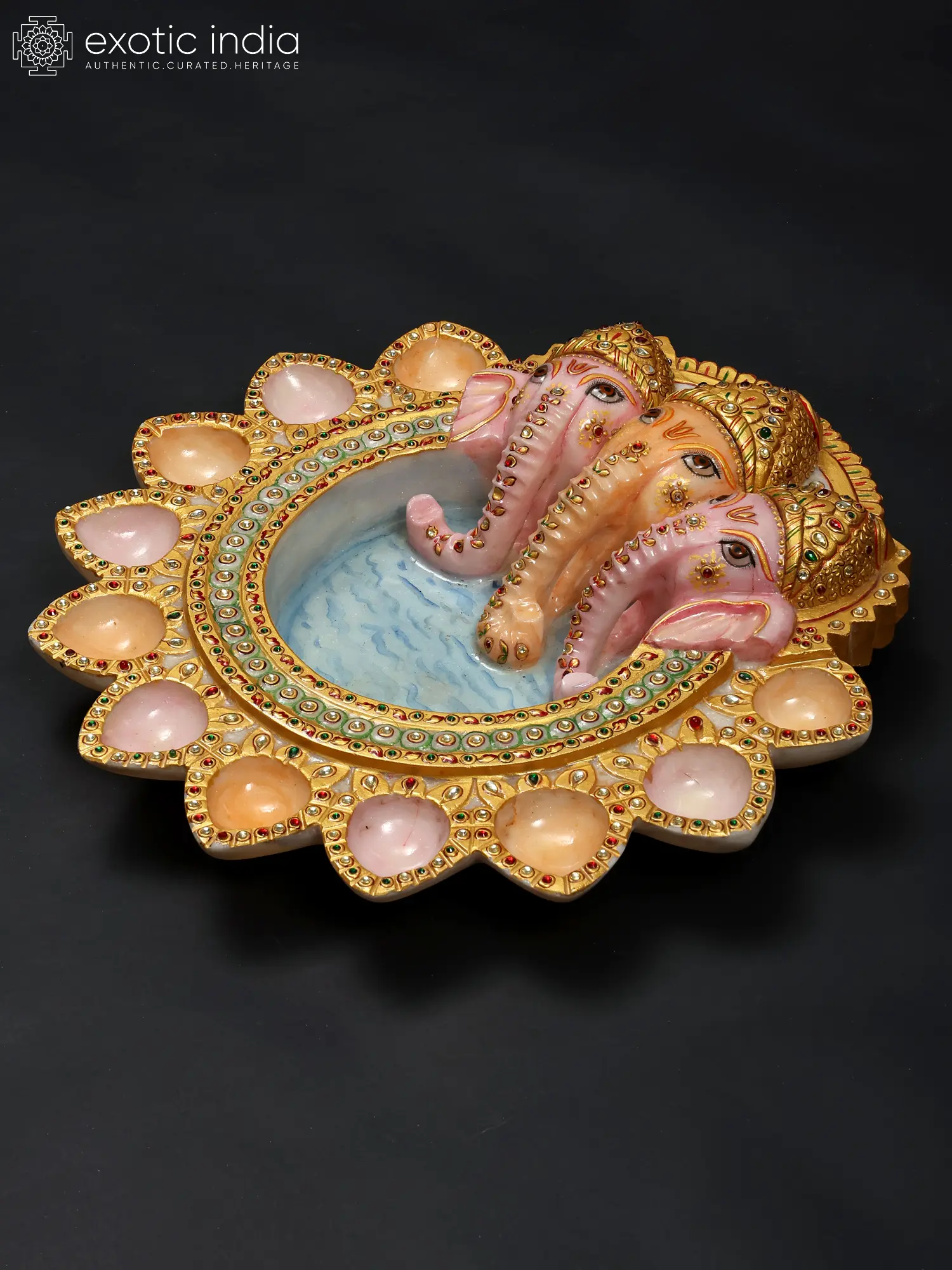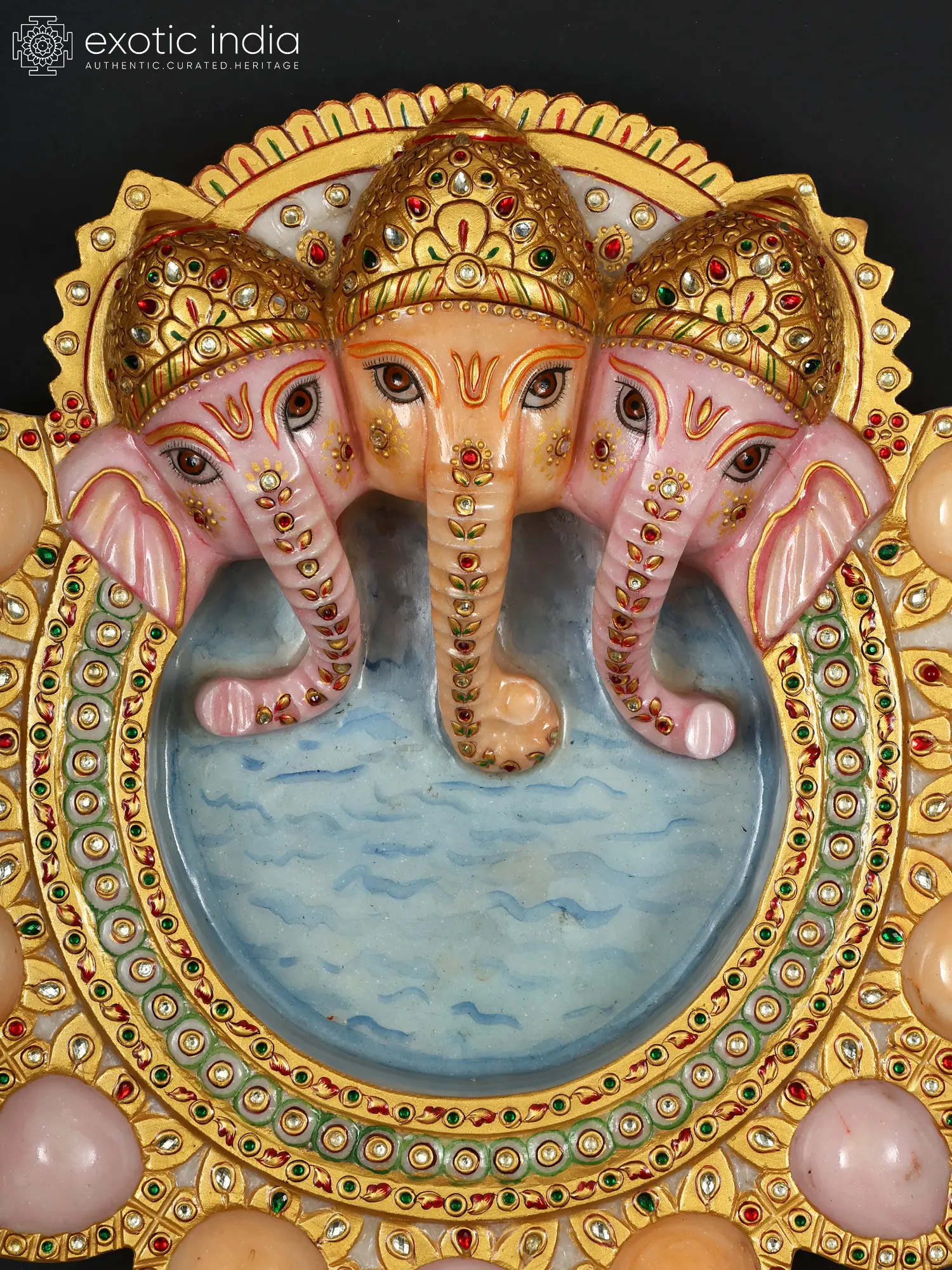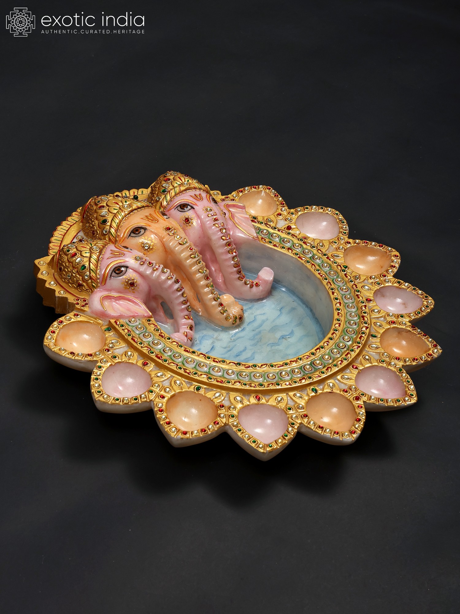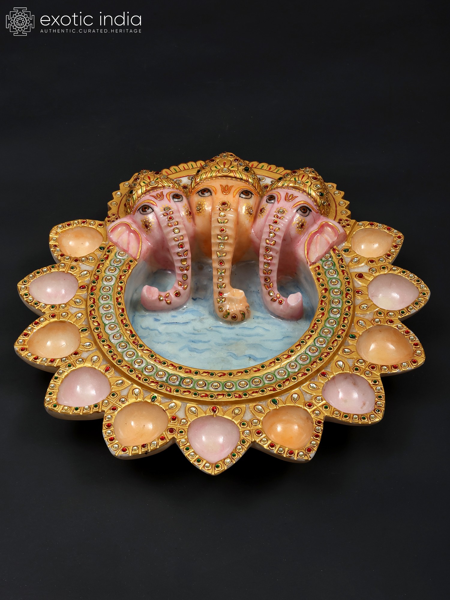 15" Divine Three-Faced Ganesha Urli with Diya | Marble with Stone Work