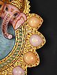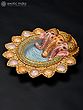 Observe the graceful representation of the divine, with its serene expression and intricate ornamentation adorning the crowned heads. The central basin, rendered in a soothing aquatic blue, evokes a sense of tranquility, inviting the placement of a lamp or floral offerings. Radiating outwards, a meticulously crafted border frames the central motif, studded with polished semi-precious stones in a delightful array of soft pinks and warm peaches, each nestled within gilded settings. The overall dimensions, approximately 15 inches in height, ensure a substantial yet elegant presence.