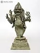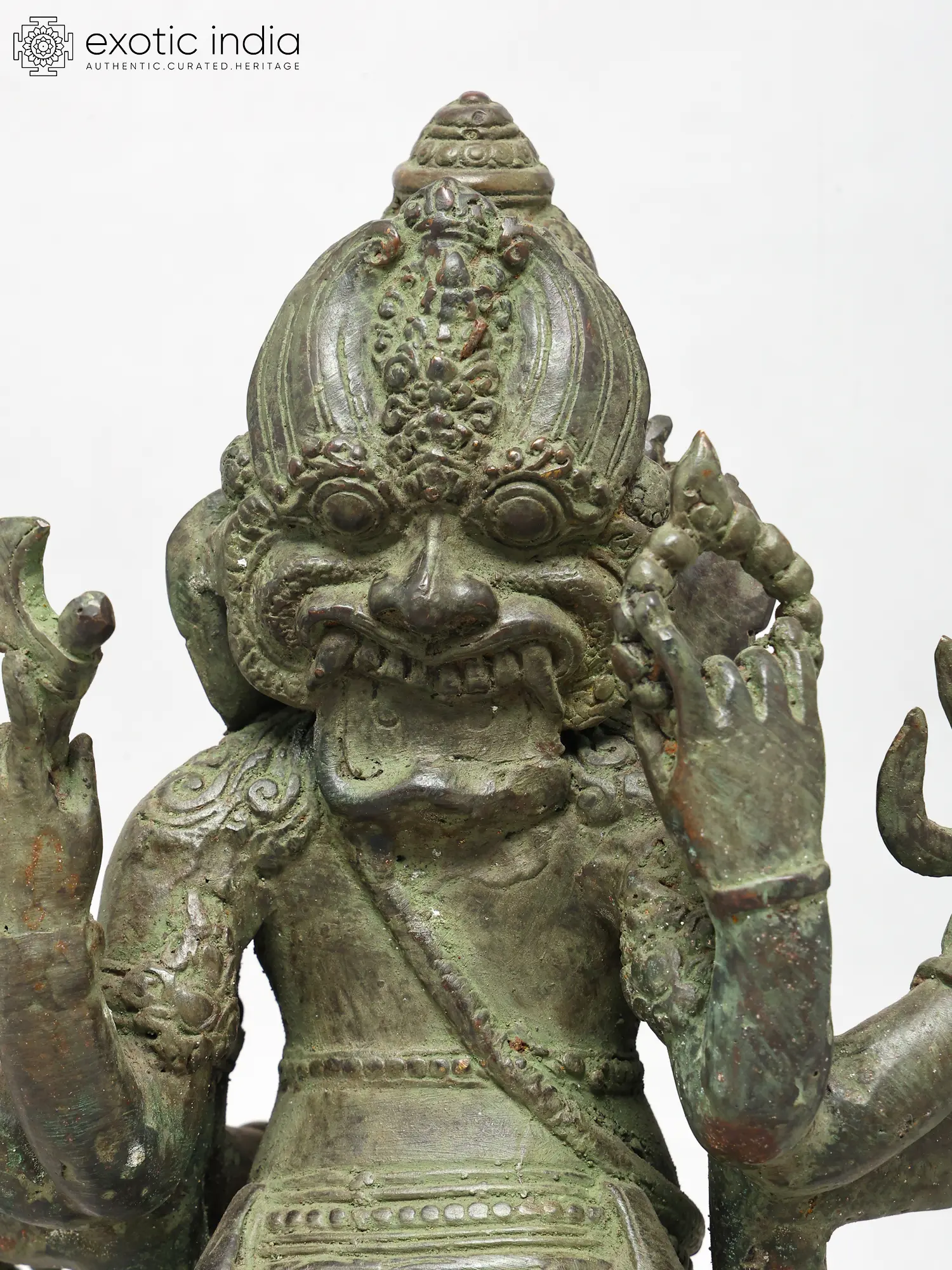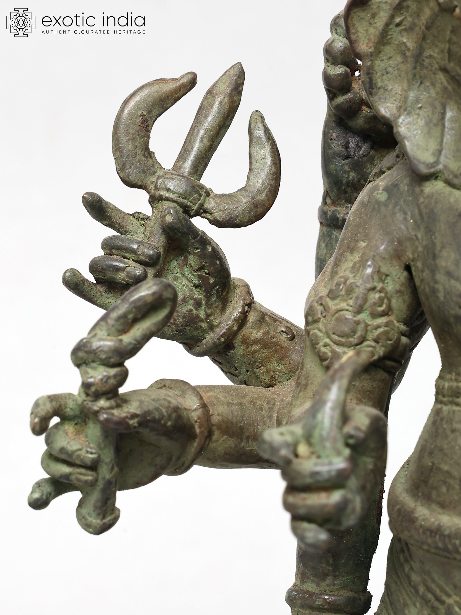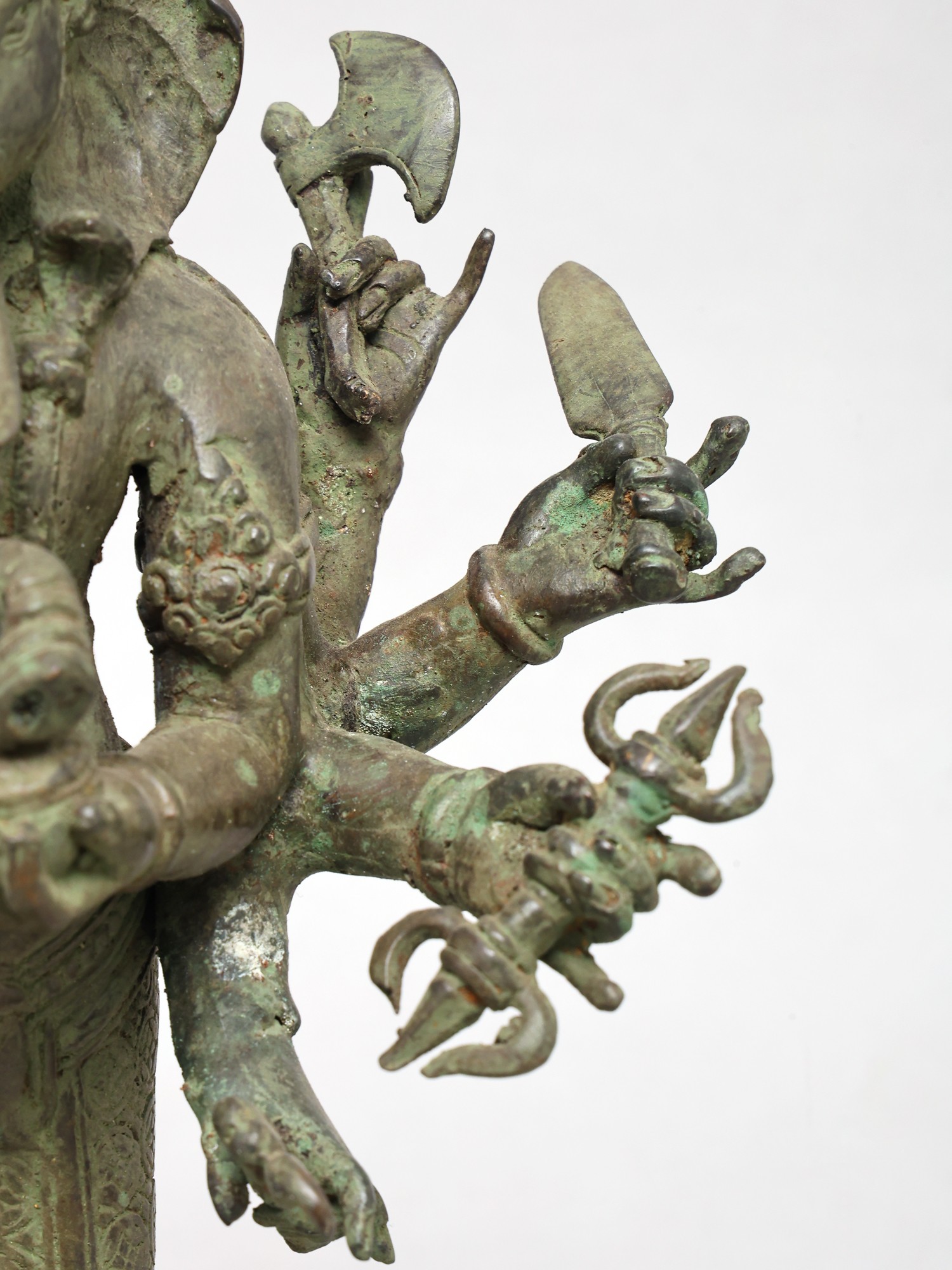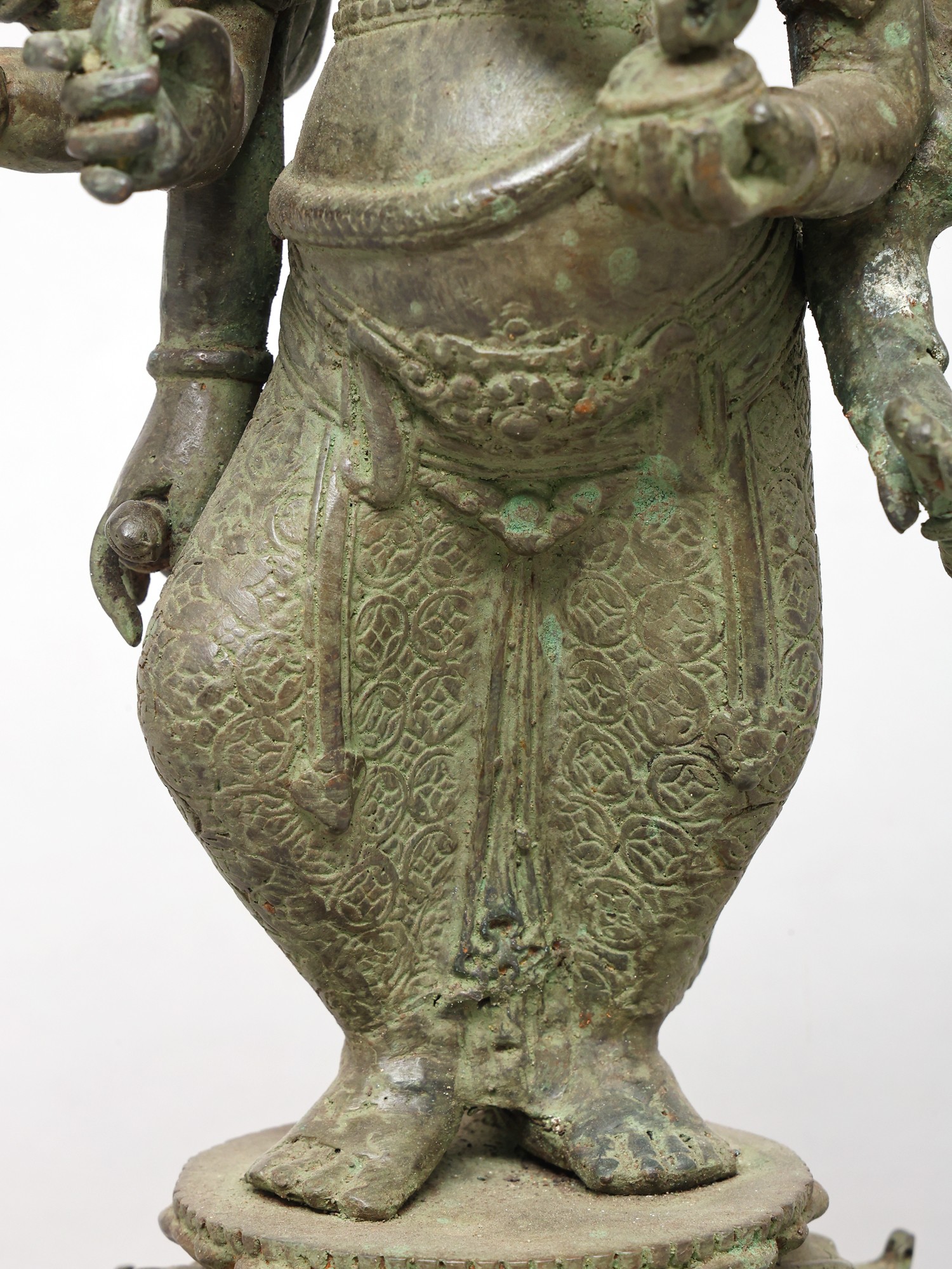 Observe the commanding presence this form commands, standing at an impressive fifteen inches tall. Its eight arms are artfully positioned, each holding symbolic implements that denote its multifaceted powers and responsibilities. The detailed ornamentation on the waistband and the intricately rendered crown further elevate its majestic appeal. The form rests upon a lotus pedestal, a classic motif representing purity and spiritual growth, which is itself mounted on a square base adorned with classical motifs.