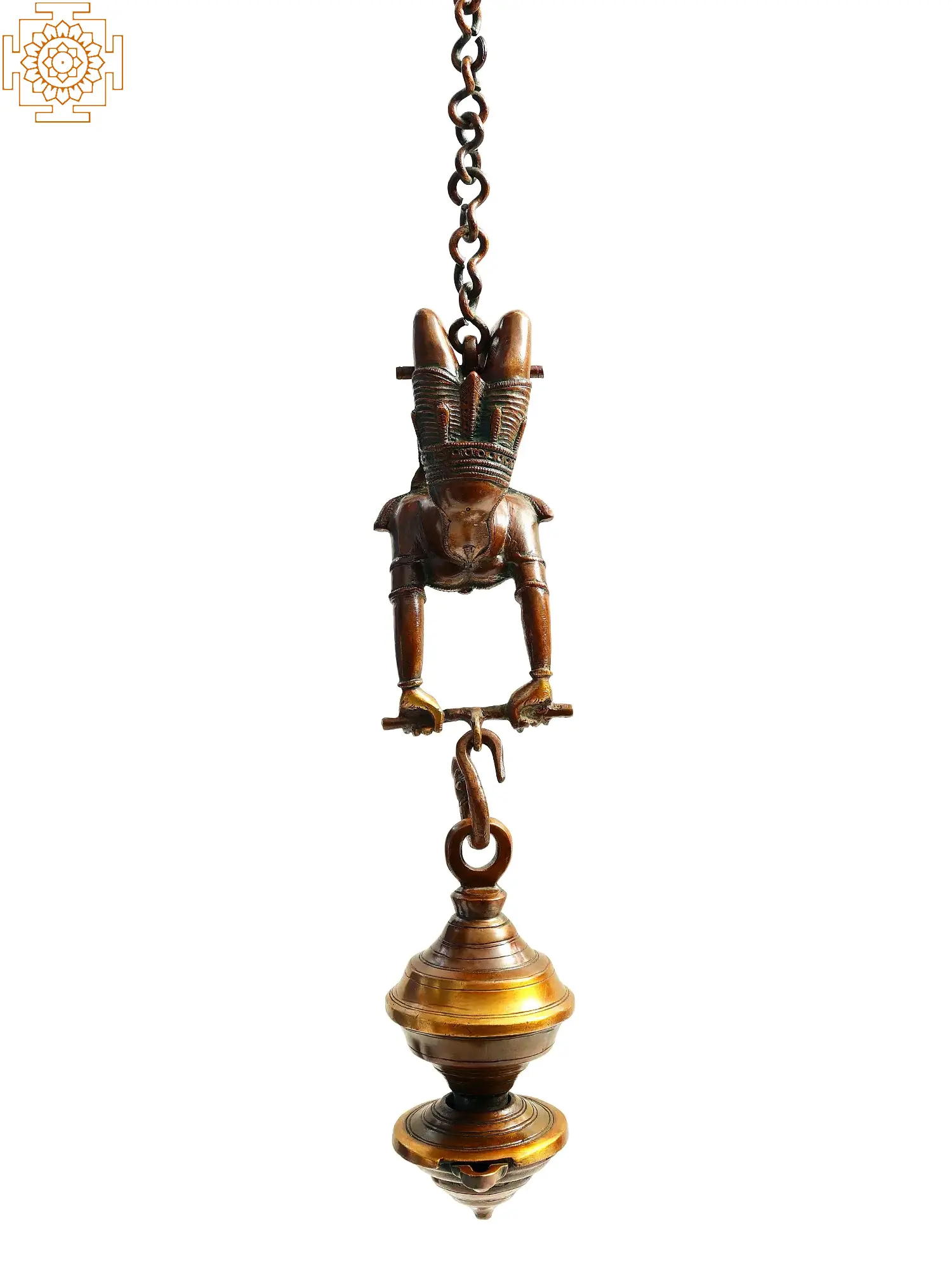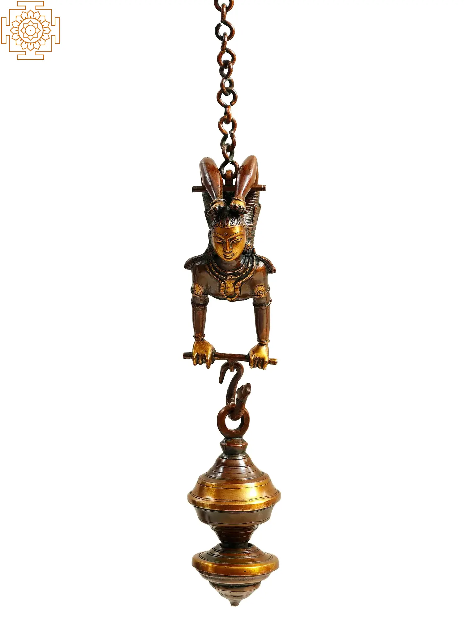 This Female Acrobat Oil Lamp in brass is a monument to the lamp manufacturers' astute skill. In the crown picture, a female acrobat balances her hands with her feet and legs high over her head. The chain is tied to the female's back, and beneath her is a Kindi Vilakku light. The lamp's pot-shaped body also serves as an oil reservoir. There is only one wick that recharges via the oil pot. This light has no spiritual value and is mainly used as a decorative object.