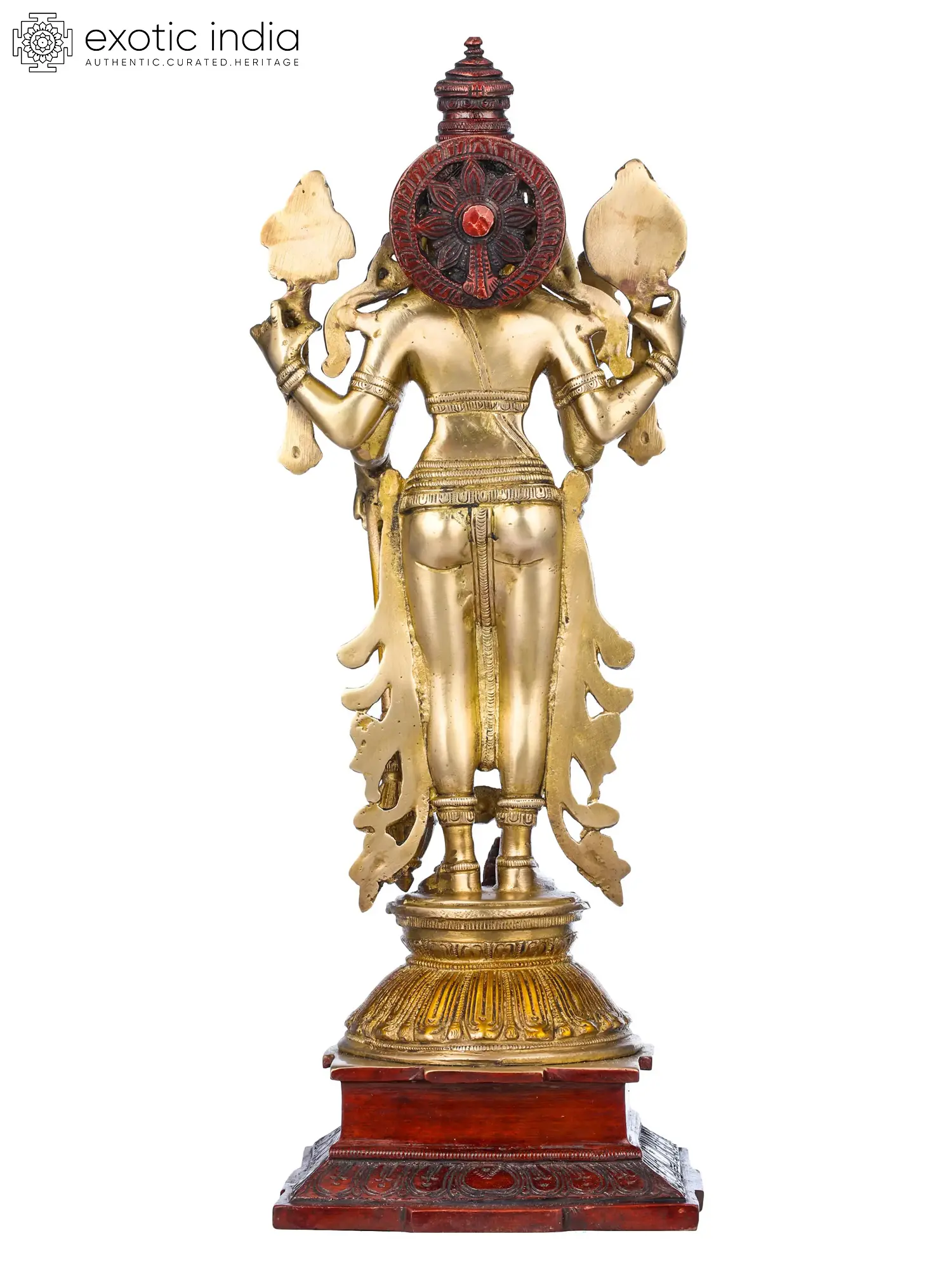 In the artistry of brass, the Four-Armed Standing Vishnu stands as a majestic representation of the Hindu deity, emanating cosmic equilibrium and divine elegance. With four arms gracefully holding symbolic objects, the statue captures Vishnu's serene and protective essence. Meticulously crafted, the brass medium imparts a timeless radiance, elevating the sacred atmosphere. This representation prompts contemplation on Vishnu's pivotal role as the preserver in Hindu cosmology. Whether placed as a centerpiece or revered in a sacred space, the statue becomes a visual ode to cosmic harmony, symbolizing the divine energies that sustain balance within the universe according to Hindu beliefs.