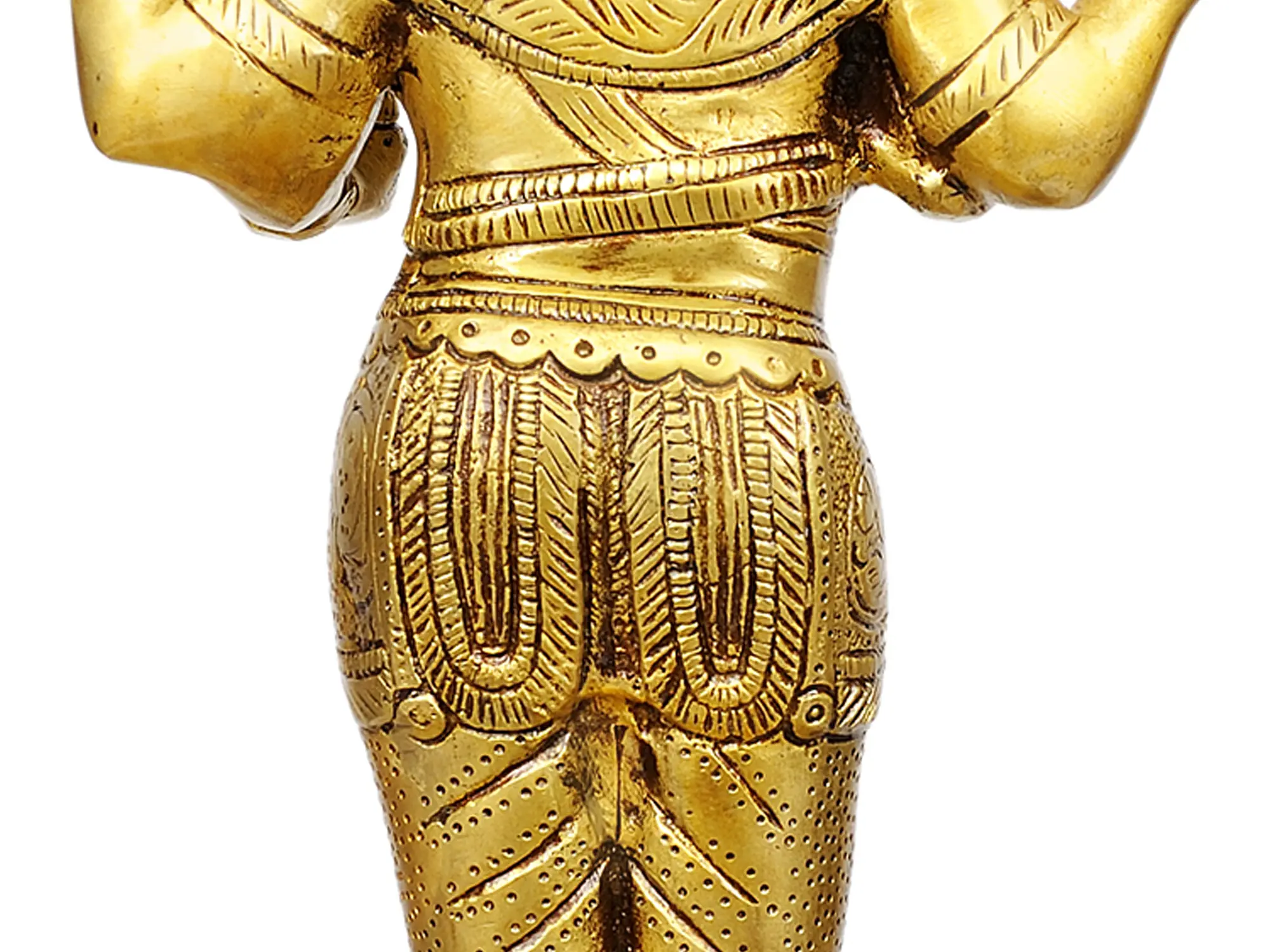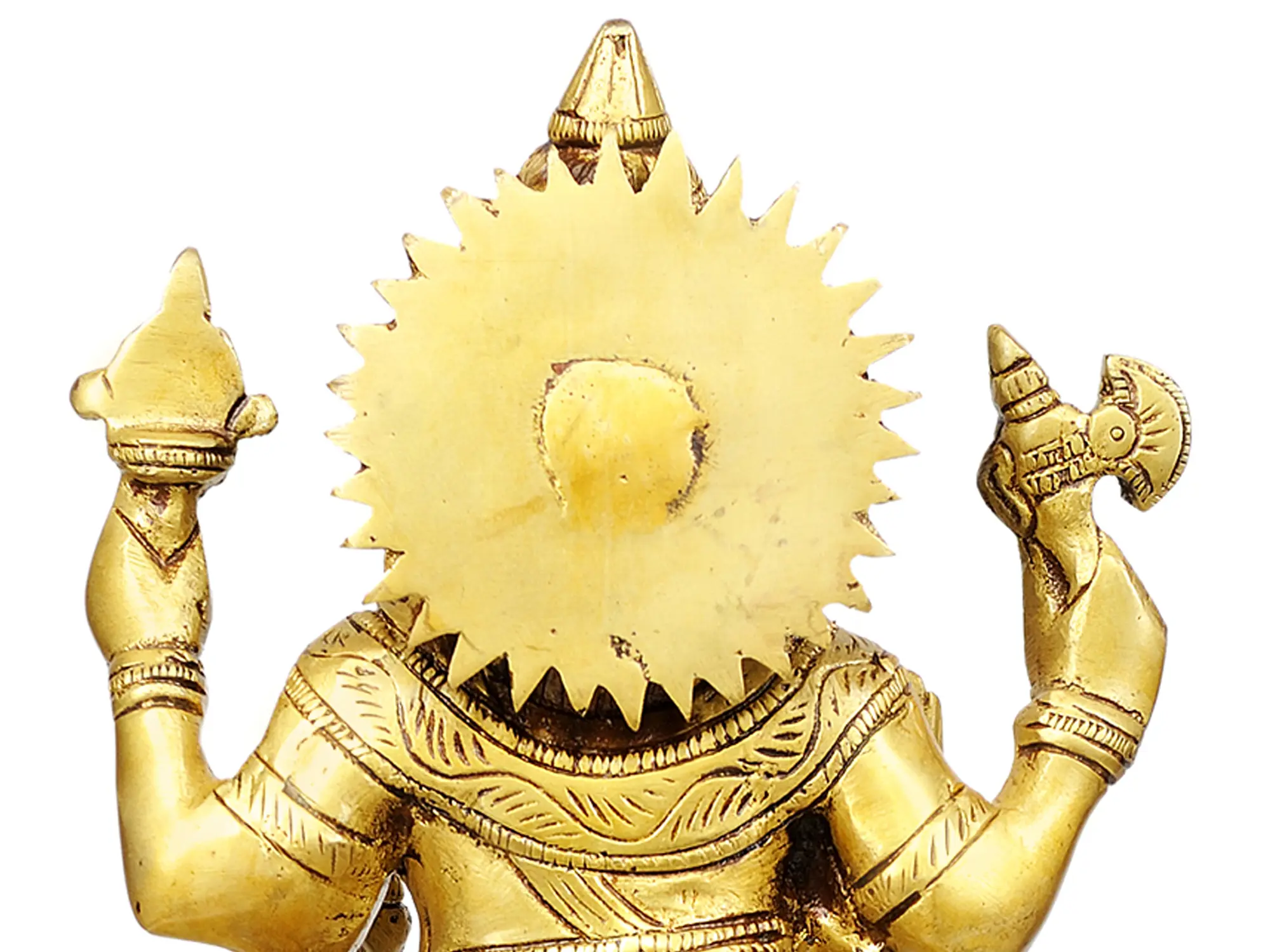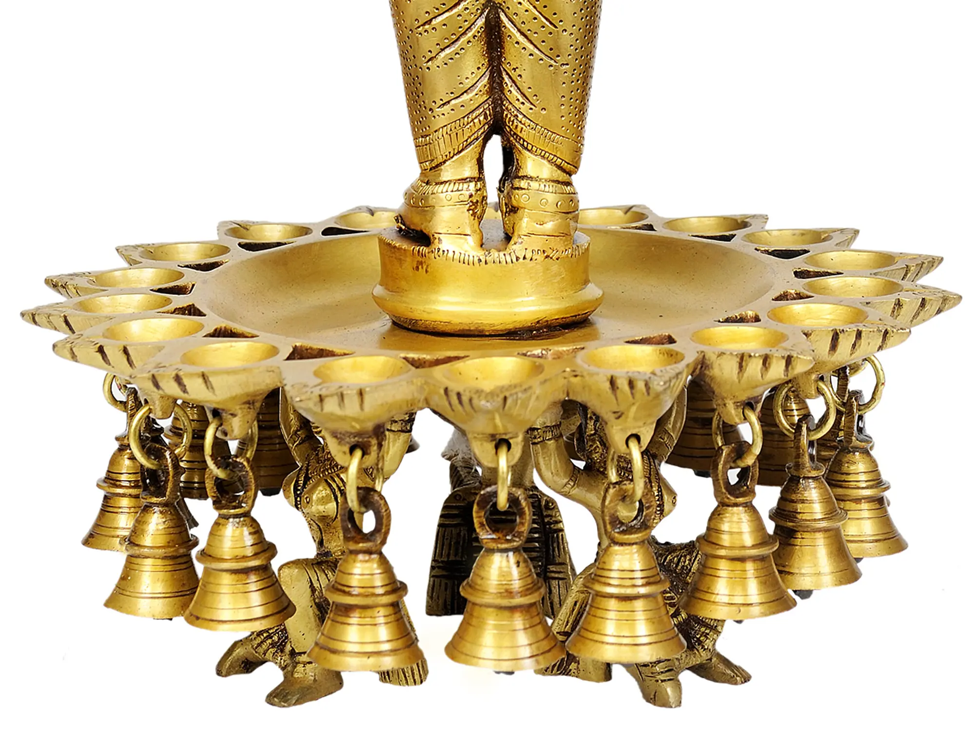 Lord Ganesha is the Ajam (unborn), the Nirvikalpa (attributeless), and the Niraakaar (formless), and he represents the ubiquitous mind. This brass lamp with a central image of Lord Ganesha is a tribute to the omnipresent form of the deity. He is established above multiple wicks in a Chaturbhuj or four-armed form. His head is ornamented with a halo resembling the flames of the sun. There are also bells attached to the lamps, thus signifying a sacred amalgamation of sacred sound and light. This beautiful ritual object with the blessings of Lord Ganesha is a delicate object of art that brings all the goodness of all the symbols in one place.